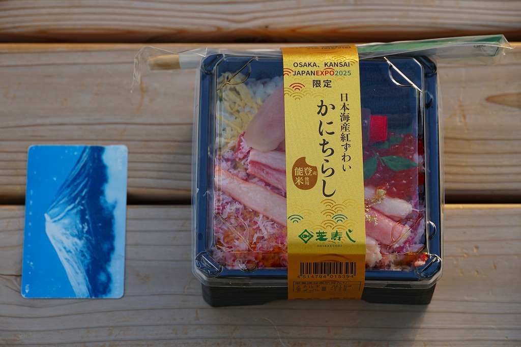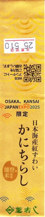 金沢で親しまれる芝寿しが、2025(令和7)年4月13日から10月13日まで開催される大阪・関西万博の土産物店「北陸お花ごっつおマルシェ」に出店、そこで買えた商品のひとつ。金沢でも人気というかにちらしに、正方形のプラ容器に五目酢飯を詰めてカニのほぐし身と棒肉ととびこで覆ったものにいくら、生姜酢漬け、ふき佃煮、錦糸卵を添えたものに、金粉を振り、万博の名を記した金色の紙帯を締めたもの。とても高額な商品だが、万博会場内なのできっと気にされない。