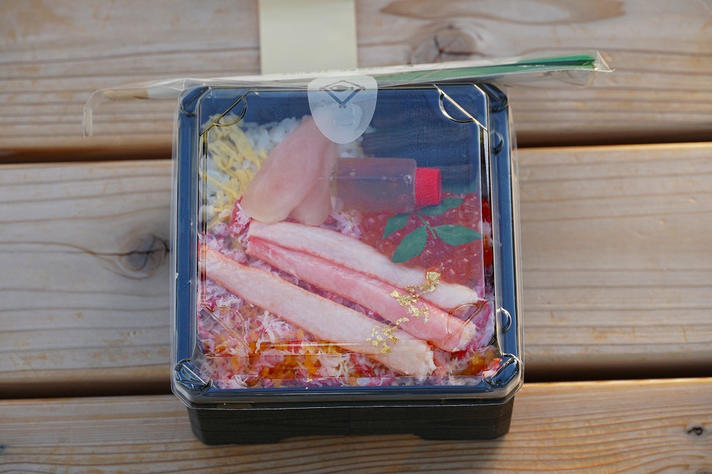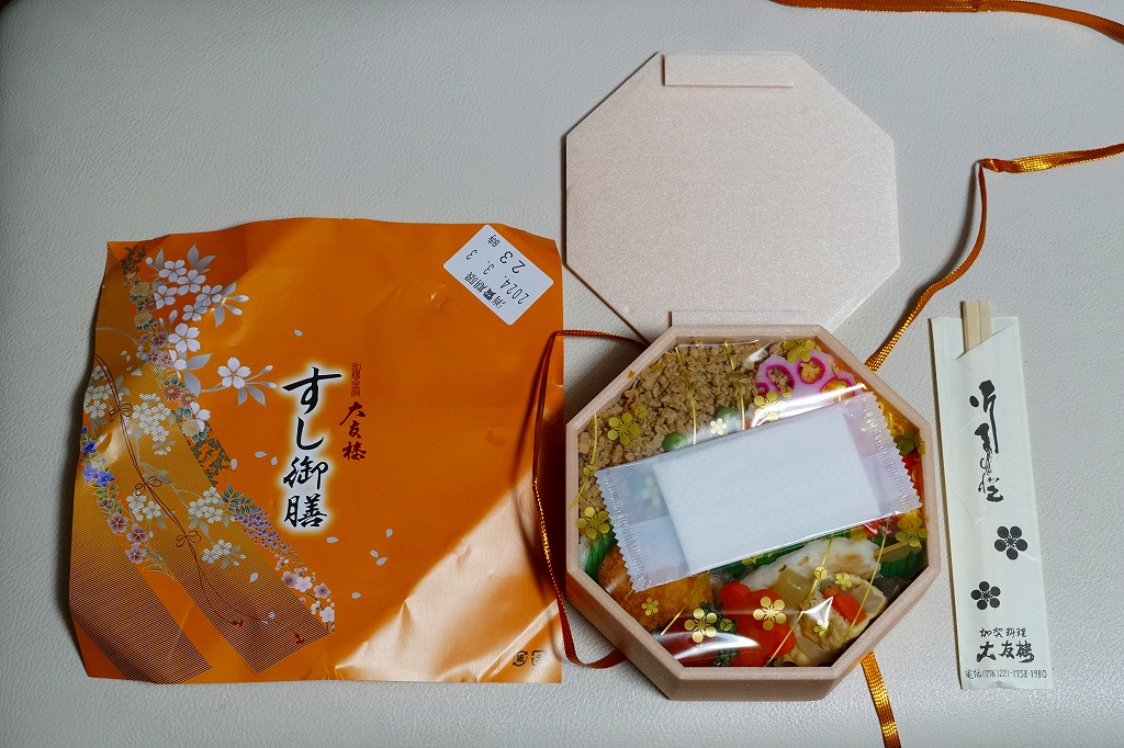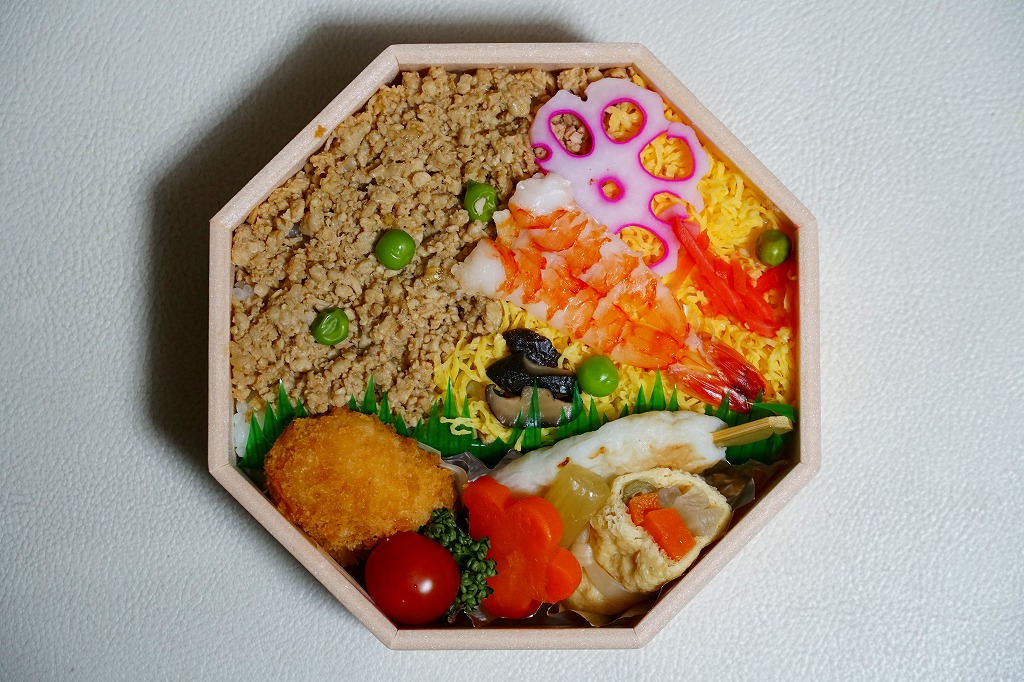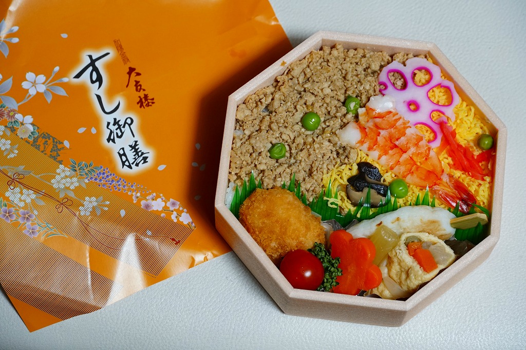 金沢駅の商業施設に入居する駅弁屋の店舗で購入。正八角形の容器に酢飯を詰め、とりそぼろと錦糸卵で覆い、えびや花れんこんなどで彩り、揚げ物と煮物のおかずを添える。この日のこの店舗では最も安価な弁当であり、簡易版かお買い得な商品なのだろう。容器に掛紙をかけてひもでしばる姿は、昔ながらの駅弁にみえる。