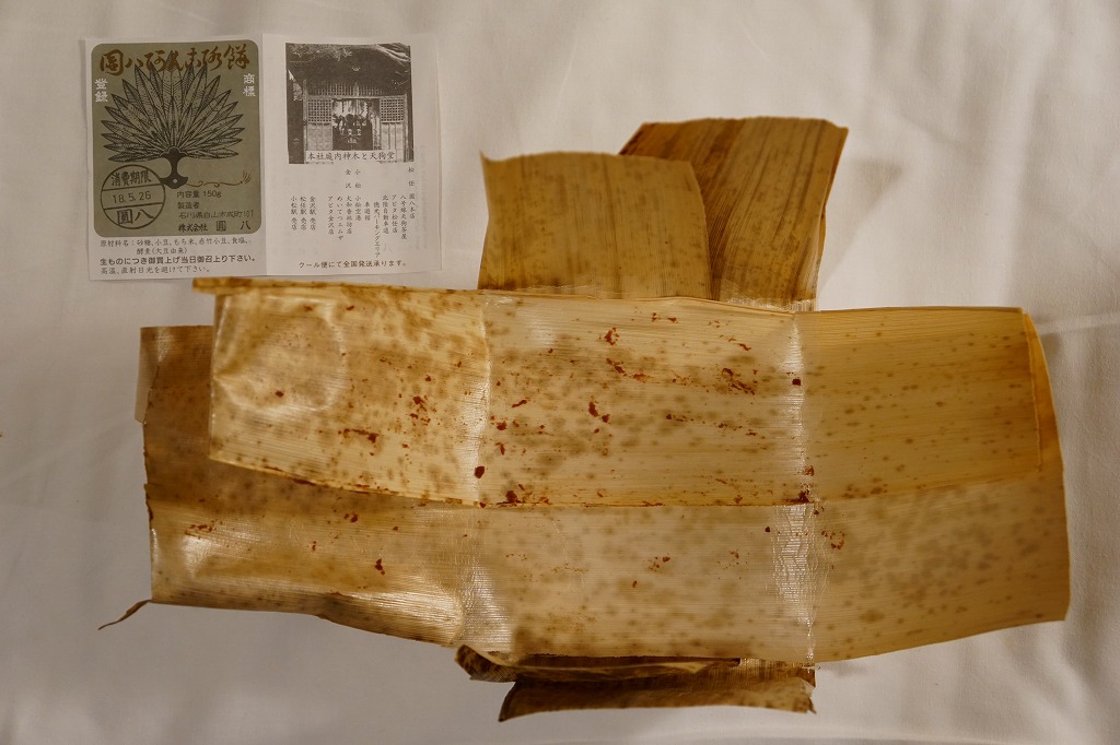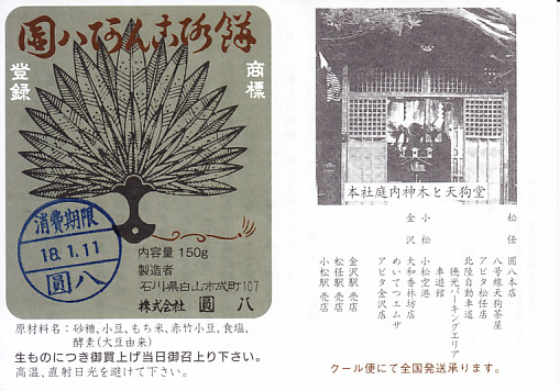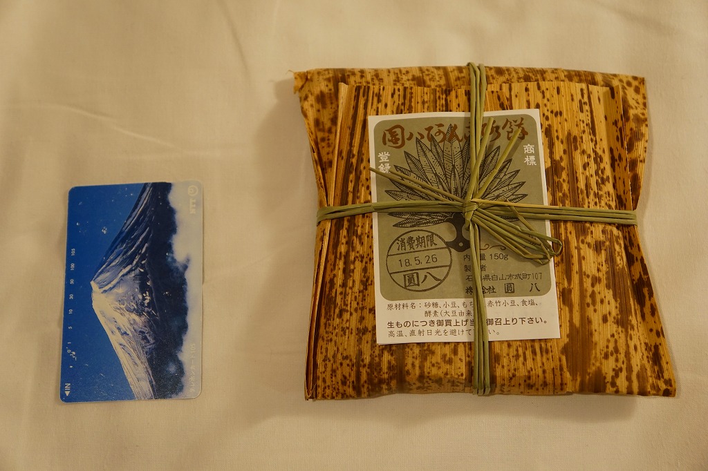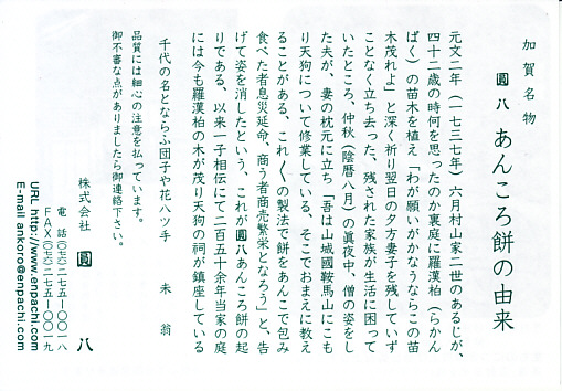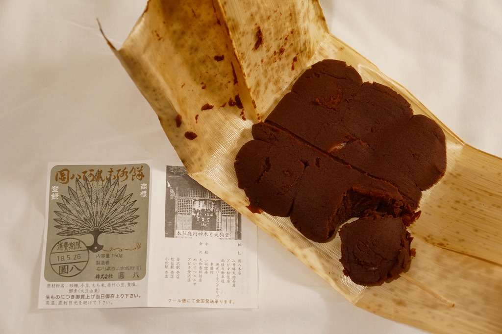江戸時代の元文2年(1737年)に調製元が創業し発売、1898(明治31)年の松任駅開業と同時に駅での立ち売りを始めたという、地元の銘菓かつ鉄道銘菓。餅米の白い団子をこしあんで包んだあんころもちが9個、竹皮2枚で十字に包まれ、掛紙をのせてひもで十字にしばられる。竹皮の中身はぺったんこで、こしあんの板から9粒の餅球が出現。風味はざらざら。これが創業380年、駅売り120年の味。価格は2017年時点で370円、2018年の購入時で390円、2020年時点で420円、2023年時点で450円、2024年時点で480円。
