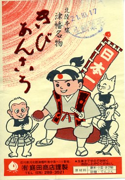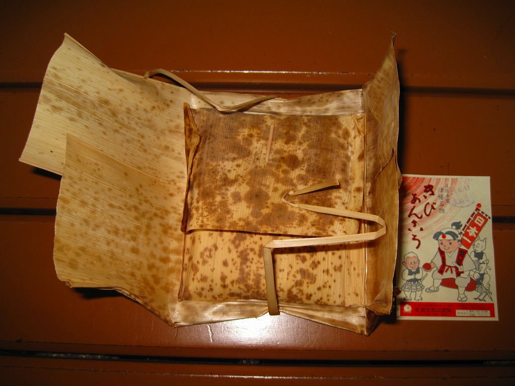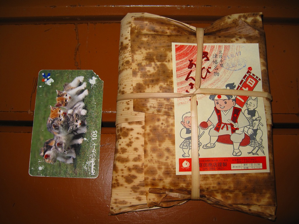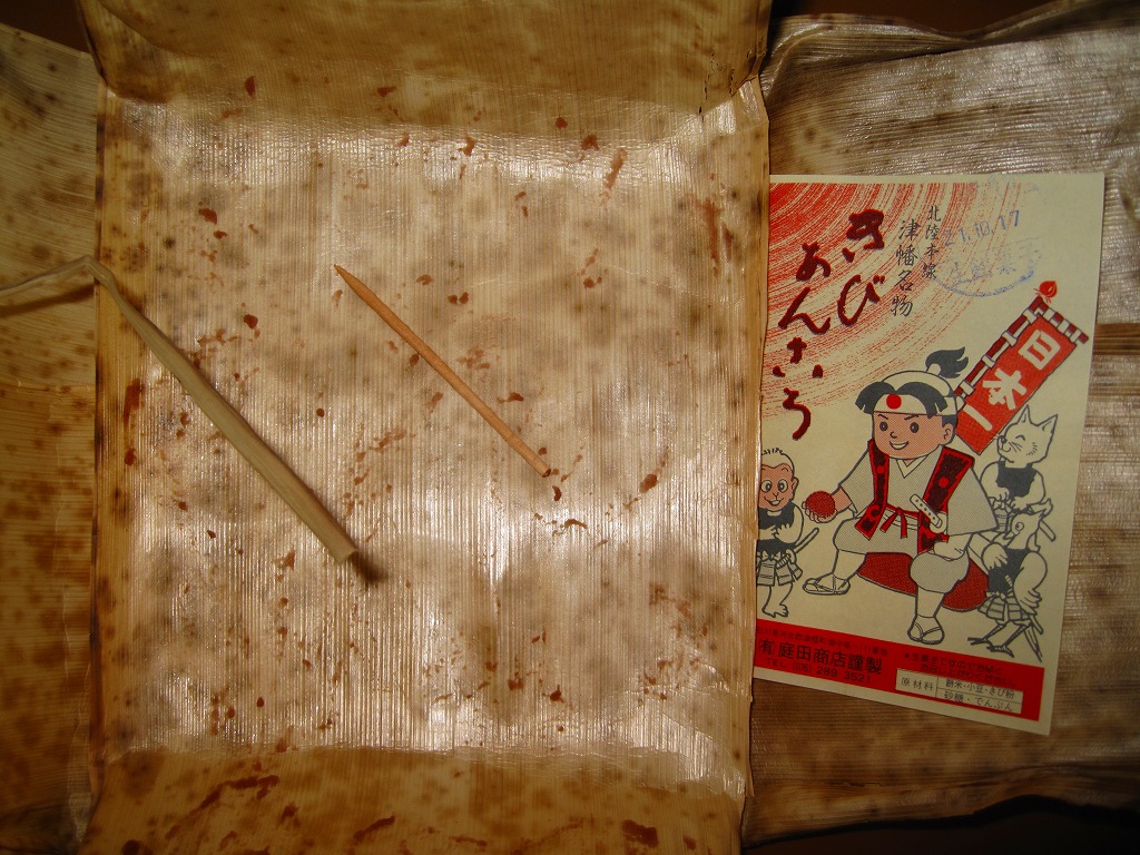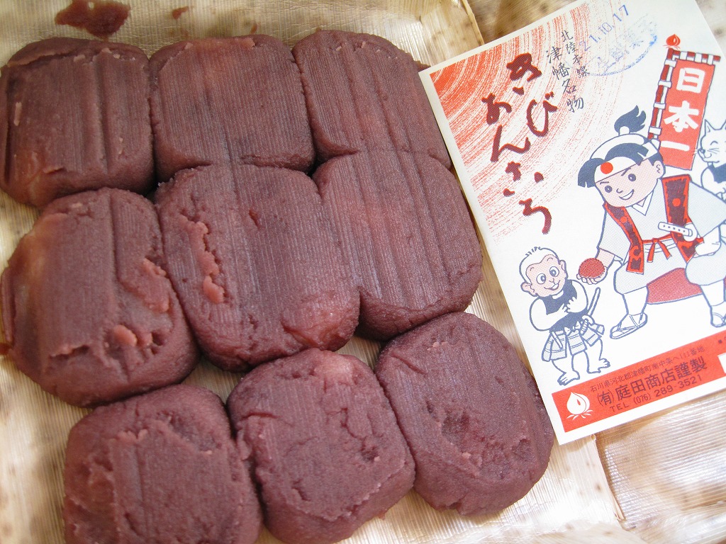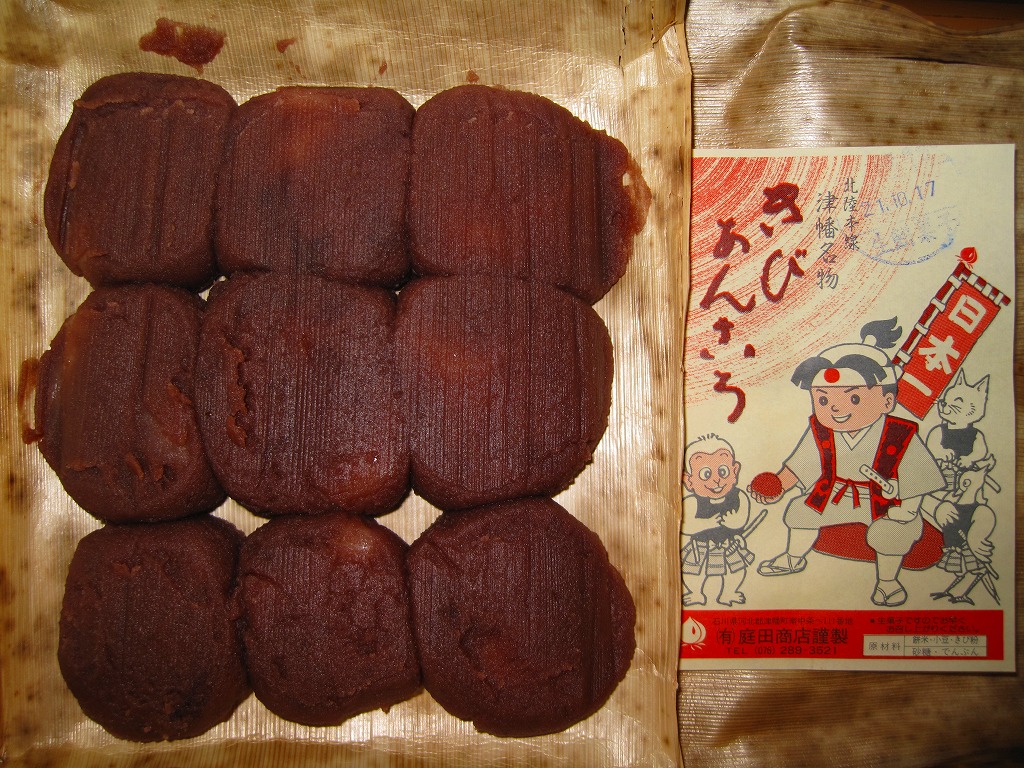 1903(明治36)年の発売。津幡駅で百余年の歴史を刻んだ鉄道銘菓。餅米を使い、きび粉を練り込んだ小さなあんころもちが9個、竹皮に十字に包まれて、ひもで十字にしばられる。百年前から同じ製法で作られていることが売り文句。全国的にも北陸地方でも知名度は薄いと思うし、鉄道雑誌や駅弁紹介本でもほとんど取り上げられないものの、地元と駅に深く根付いた銘菓だと思う。