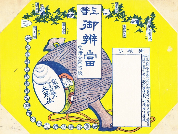 1910年代、大正10年代のものと思われる、昔の今庄駅弁の掛紙。収集者は1920(大正9)年のものとしていた。今庄駅は1962(昭和37)年6月に北陸トンネルが開通するまでは、山中峠越えのための機関車を付けたり外す駅であり、急行列車を含む汽車が長く停まり、駅弁が売られ、駅そばが親しまれた。トンネルの開通で汽車と旅客の賑わいは消え、駅そば屋は福井駅に、駅弁屋は石川県の大聖寺駅に移転した。