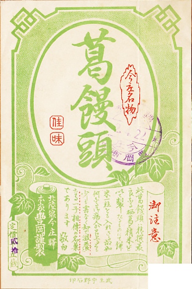 1927(昭和2)年4月22日の調製と思われる、昔の今庄駅弁の掛紙。15銭の価格が20銭に訂正されている。駅弁屋とは異なる構内営業者が、おそらく立ち売りで販売した、駅売り銘菓となろう。