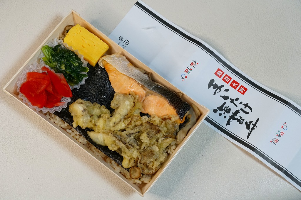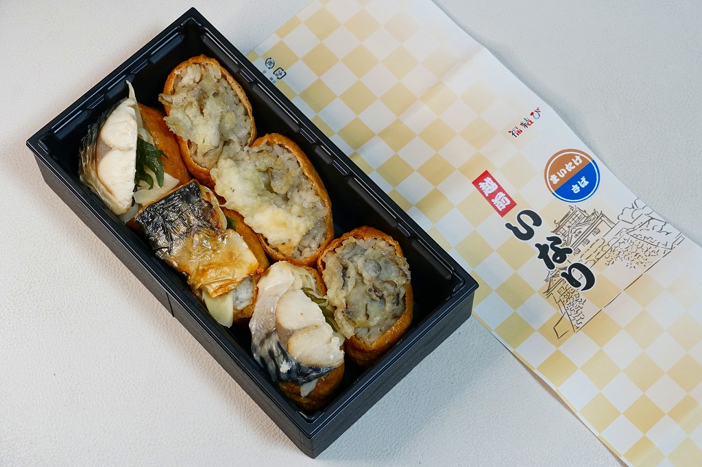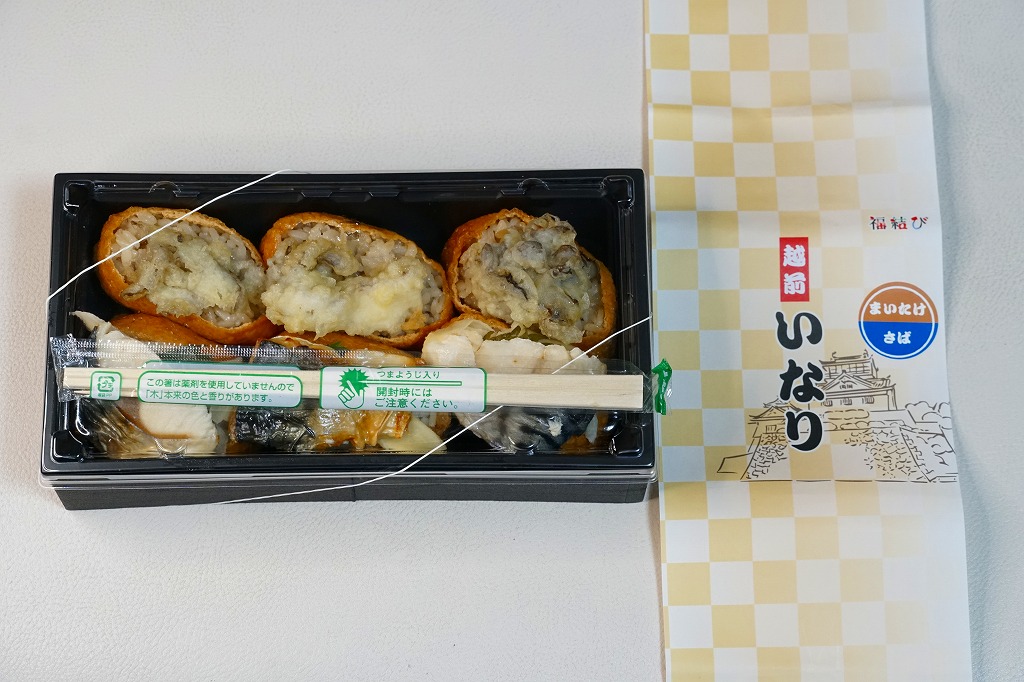 2024(令和6)年1月の京王百貨店の駅弁大会で、九頭竜湖駅の駅弁として実演販売。商品名は催事の一覧表では「まいたけ稲荷・焼きサバ稲荷」であった。「福結び」「まいたけ さば」「越前いなり」の文字と越前大野城を描いた掛紙を巻く惣菜向けプラ容器に、舞茸御飯を詰めてマイタケ天を載せたおいなりさんを3個と、酢飯に焼サバとしその葉とガリを載せたおいなりさんを3個詰める。福井の山の幸と海の幸の詰合せと解釈することもできそうな、ユニークな具のおいなりさん。こんな商品が現地の駅か道の駅に、あるのかどうか。
