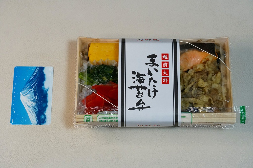 2024(令和6)年1月の京王百貨店の駅弁大会で、九頭竜湖駅の駅弁として実演販売。商品名は催事の一覧表では「九頭竜まいたけ海苔弁」であった。「福結び」「越前大野」「まいたけ海苔弁」の文字を描いた紙帯を巻く長方形の容器に、舞茸御飯を敷き、海苔で覆い、マイタケ天と焼鮭を載せ、玉子焼とネギと福神漬を添える。もし仮にこの弁当が本当に九頭竜の道の駅で存在すれば、700円くらいで買えると思う簡素なお弁当。現地で売られる舞茸弁当は、大野市街の土産物店にも入荷し、500円前後で買える。