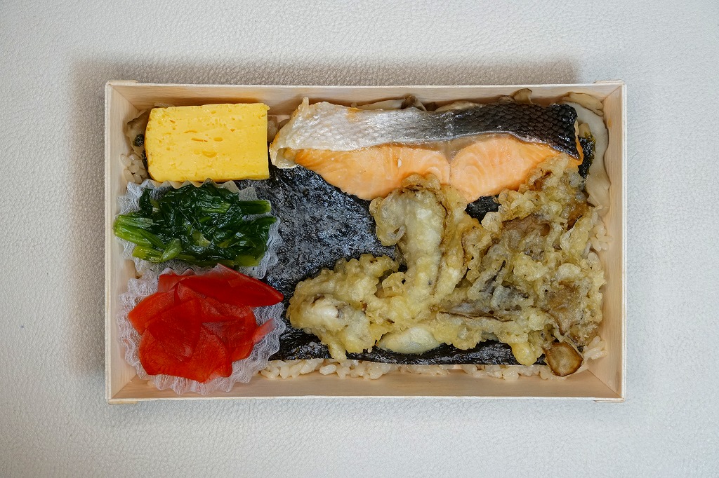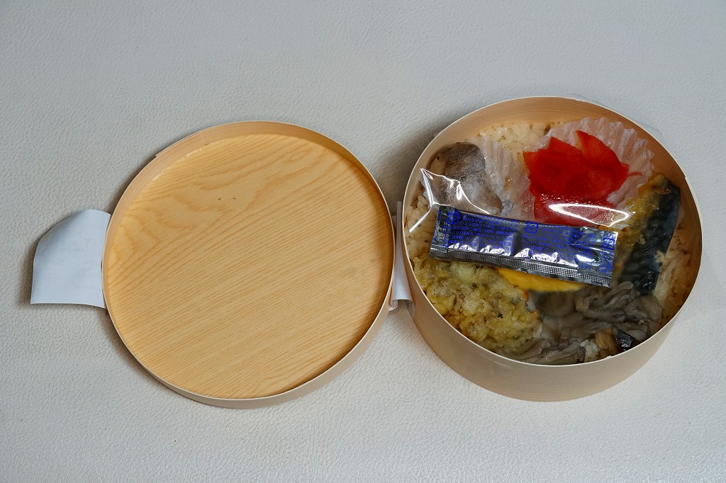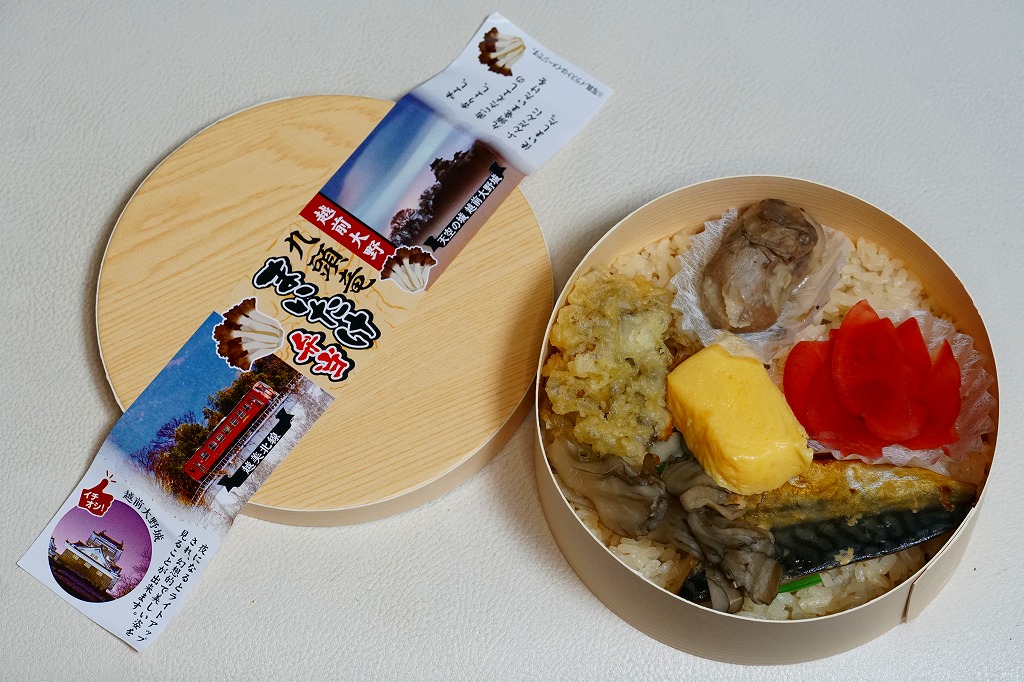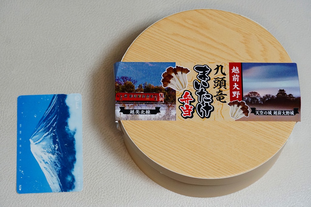 2023(令和5)年1月の京王百貨店の駅弁大会で実演販売。福井県のJR越美北線の九頭竜湖駅で、冬期間(11月中旬から3月まで)予約販売される駅弁を名乗り販売。実際には京王百貨店の駅弁大会の担当者が、福井県大野市で九頭竜湖駅に隣接する「道の駅九頭竜」で買えた舞茸弁当、マイタケの炊き込みごはんを、催事の商品に仕立てたもの。2012年や2014年にも、そんな触れ込みで売られた「駅弁」を、この催事場で見た気がする。