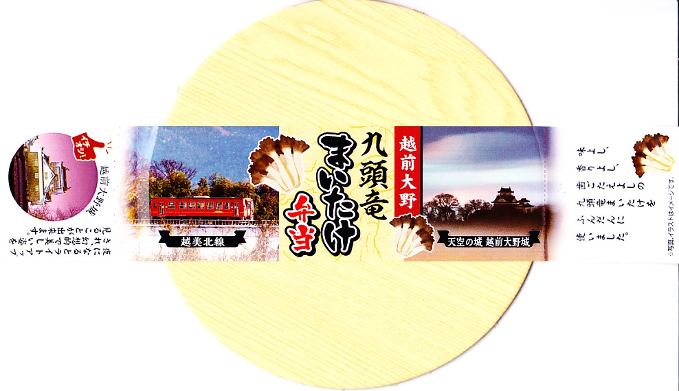 真ん丸の容器に、商品名とまいたけのイラストに、越美北線と越前大野城の写真を使うシールを貼り留める。これにマイタケの炊込飯を詰め、マイタケの煮物と天ぷらを載せ、焼サバ、さといも、玉子焼、紅生姜も載せる。福井県大野市の九頭竜まいたけは特産品で、道の駅でも使われたり売られ、この弁当にも使われる。