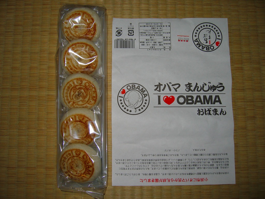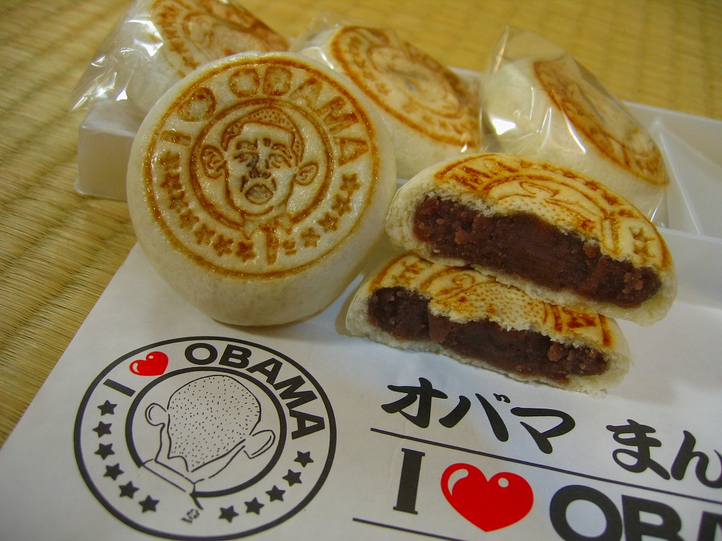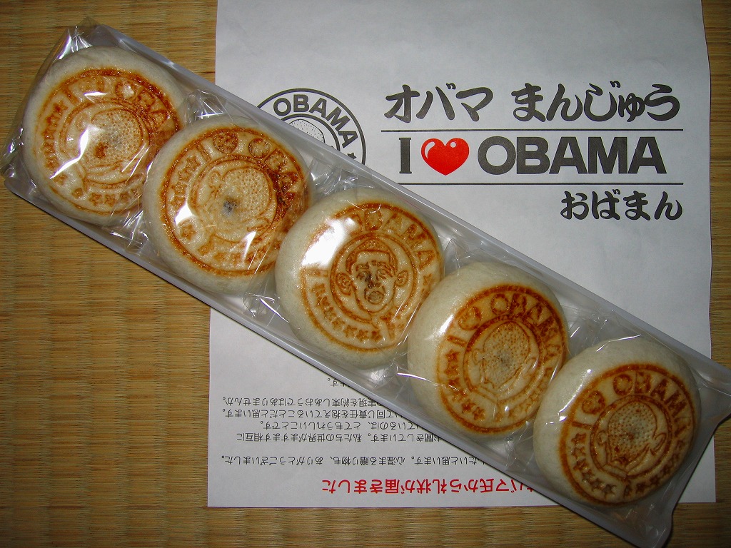 大統領予備選の激戦が日本でもテレビで大きく取り上げられる中、有力候補者と同じ名前を持つ福井県小浜市では、市長がオバマ陣営へプレゼントを送付したり、「オバマ候補を勝手に応援する会」なる地域グループが出現、この騒動もテレビに乗って全国へ宣伝された。地元の菓子店は主力の酒饅頭をアレンジして、このような商品を売り出した。