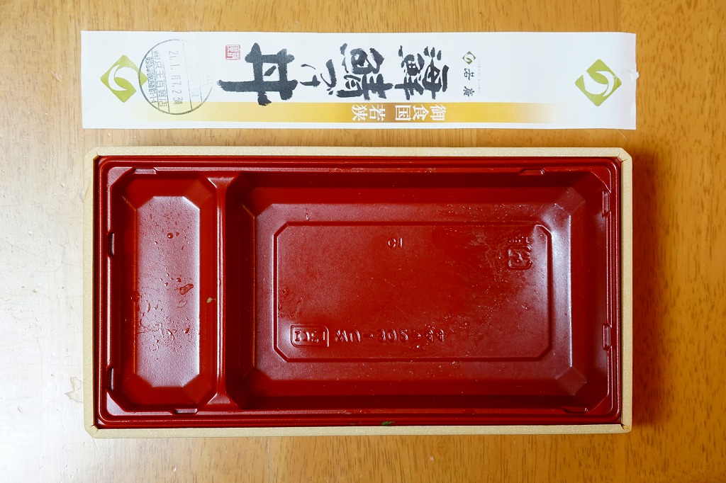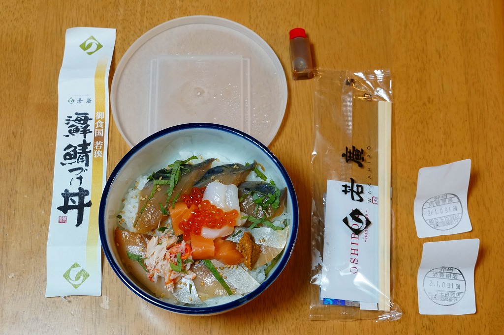 これ以外の場所や現地で売られたかは定かでない。この商品は駅弁大会で小浜駅の駅弁として売られたほか、この調製元の商品は、2020〜2021年の駅弁大会シーズンでは各地で、福井駅の駅弁として売られた。時と場合によって、福井駅や鯖江駅など北陸地方各地の駅弁だったり、羽田空港など関東や関西や北陸の空弁だったり、過去には北陸のバス弁を名乗ったこともある。今回は店内調製のため、食品表示は消費期限と百貨店の所在地のみとなり、原材料名や調製元の所在地などは表示されない。
