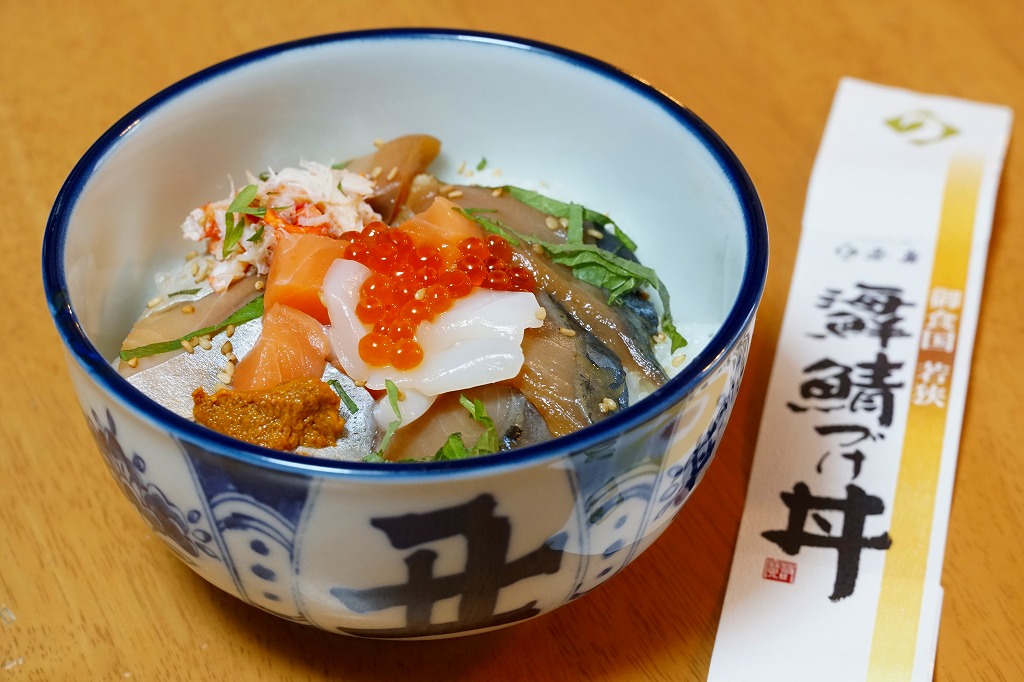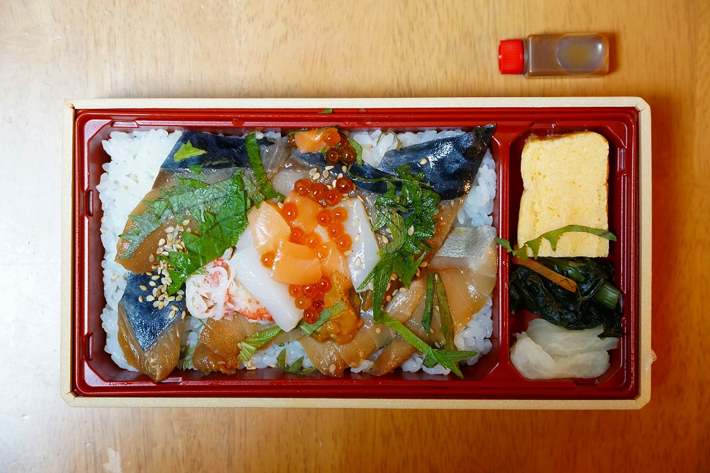 2021(令和3)年1月の京王百貨店の駅弁大会で実演販売。 白飯の上を寒サバの漬けで覆い、大葉、カニ、ウニ、イクラ、サーモン、白ごまで彩り、漬物や玉子焼を添える。脂が乗ったり、みずみずしさのある、散らされた具の、海の幸の数々がうまい。コロナ禍で例年になく空いていた催事場で、行列ができる人気だった。