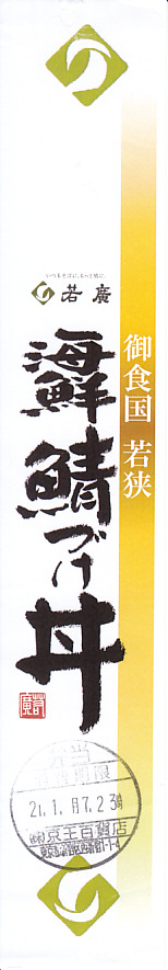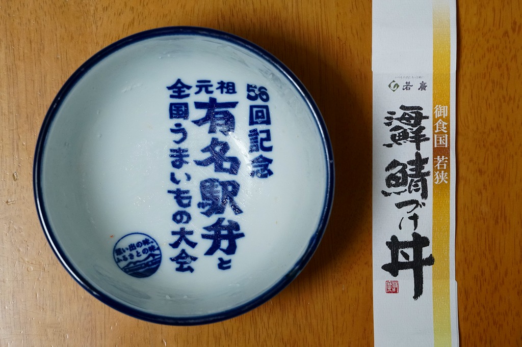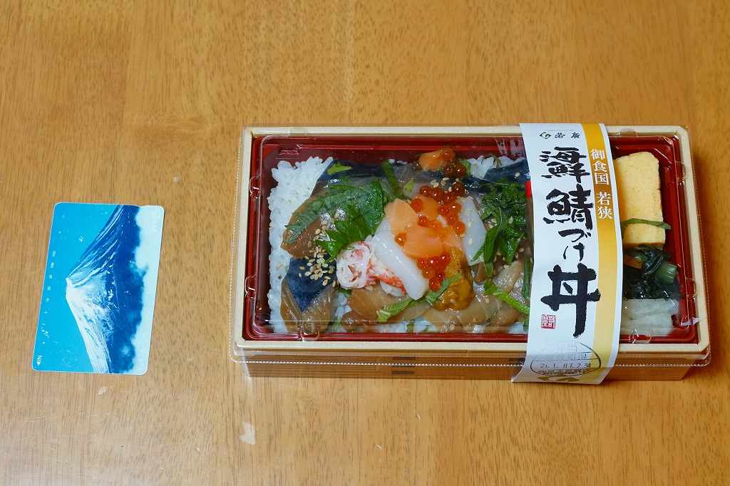 2021(令和3)年1月の京王百貨店の駅弁大会で実演販売。上記の商品「御食国若狭海鮮鯖づけ丼」について、京王百貨店の駅弁大会限定で、その名を記した特製どんぶりに入れて販売した。2020年の岡山駅「岡山名物デミカツ丼」、2019年の金沢駅「蟹のドリア」、2018年の水戸駅「常陸牛山椒風味カルビ弁当」、2017年の鳥取駅「山陰鳥取かにめし」、2016年の米子駅「海の宝箱丼」、2015年の名古屋駅「抹茶ひつまぶし日本一弁当」と同じ。ベースの商品が人気だったためか、毎日早くから完売していて、買いにくい商品だった。