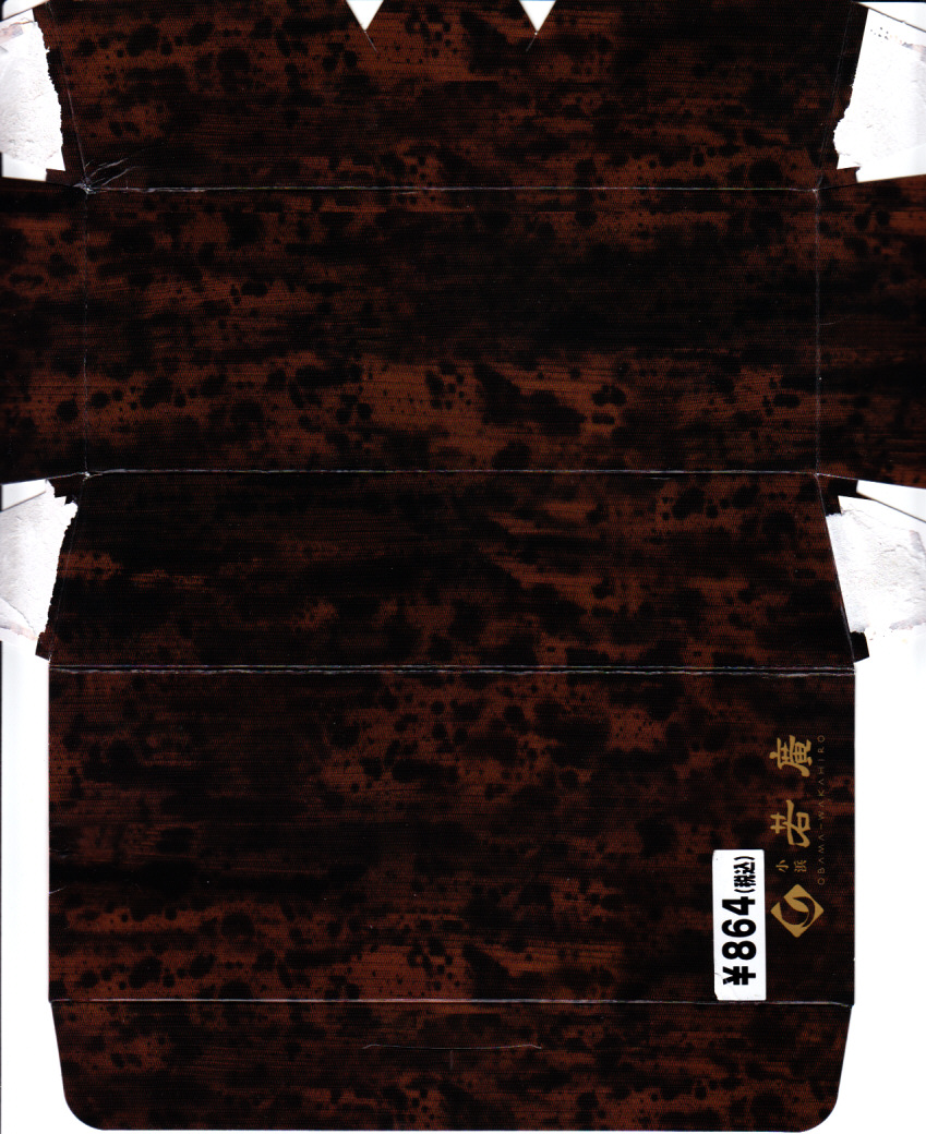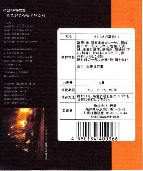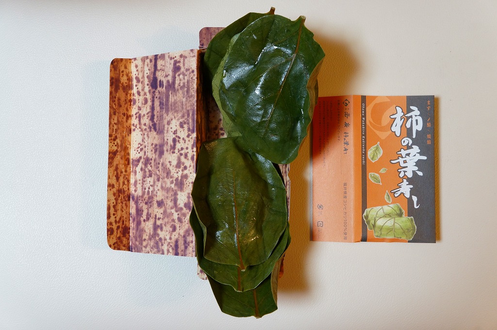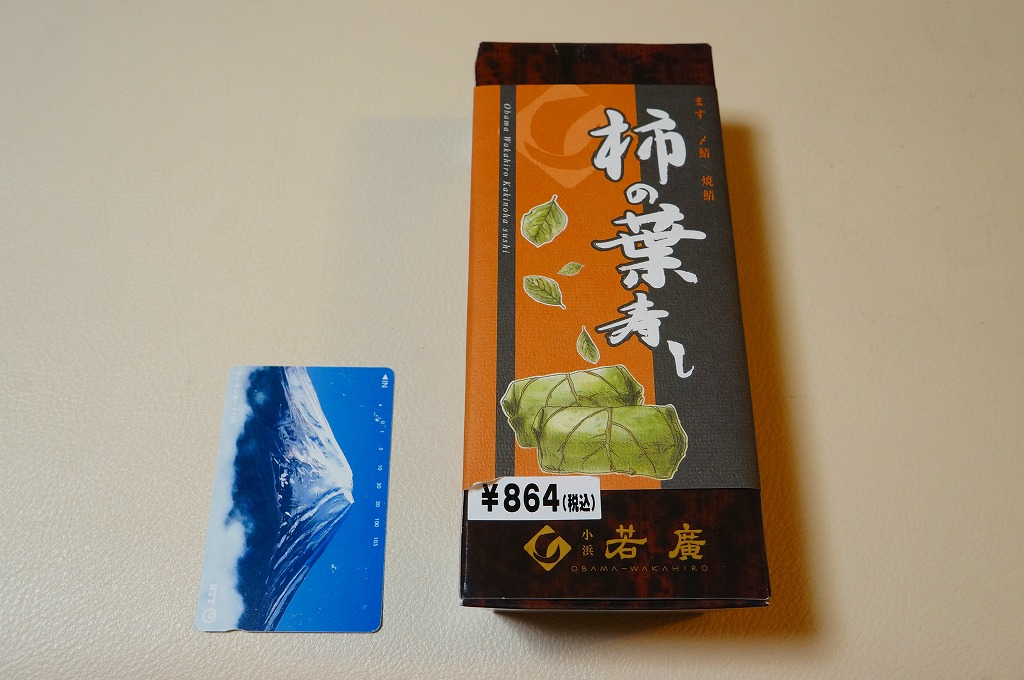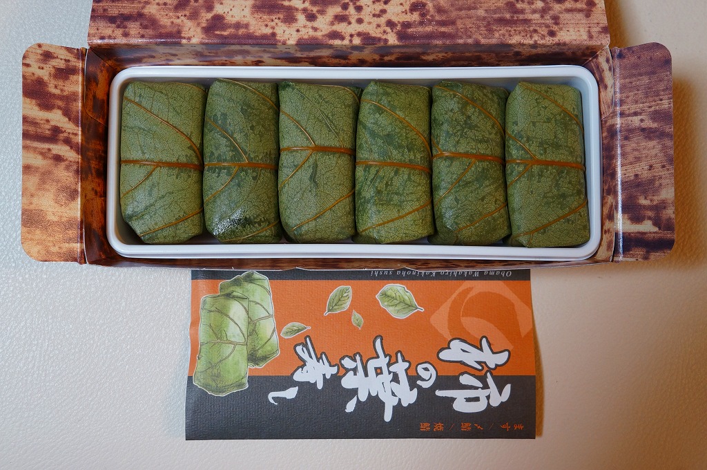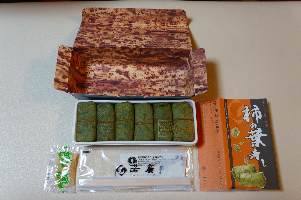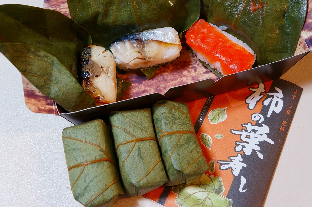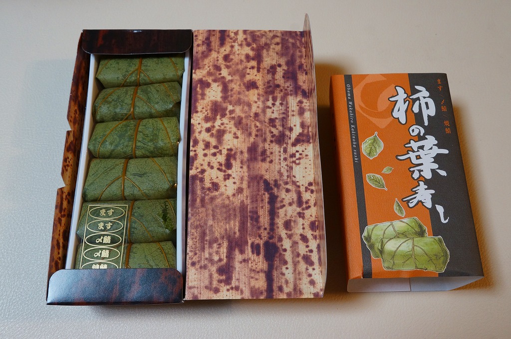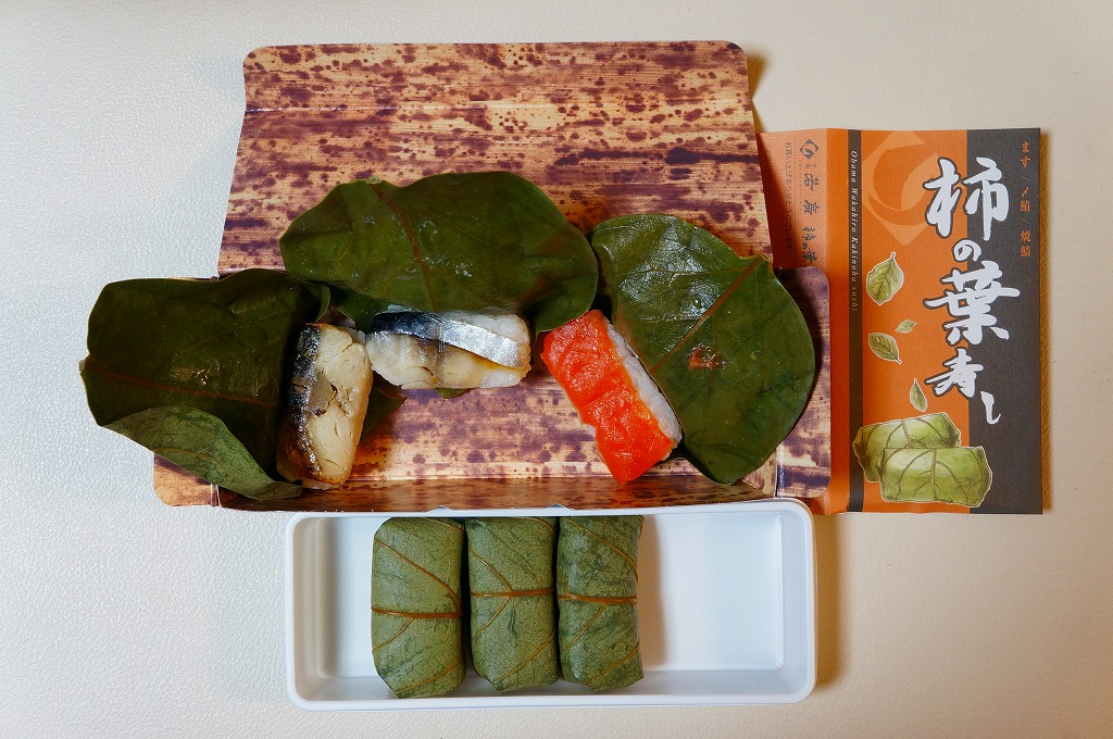 鯖江駅のコンビニで買えた商品。その名のとおりの柿の葉寿司で、マスと〆鯖と焼鯖が2つずつ、酢飯と合わせて柿の葉で巻かれ、白いトレーに並べられ、竹皮柄のボール紙箱に収められ、掛紙を巻かれる。これは、福井県の鯖江あるいは小浜の商品というよりはむしろ、東京都内と商業施設の催事場とネットショッピングで売られるナショナルブランド。福井県内では主に、道の駅や高速道路で売られる模様。