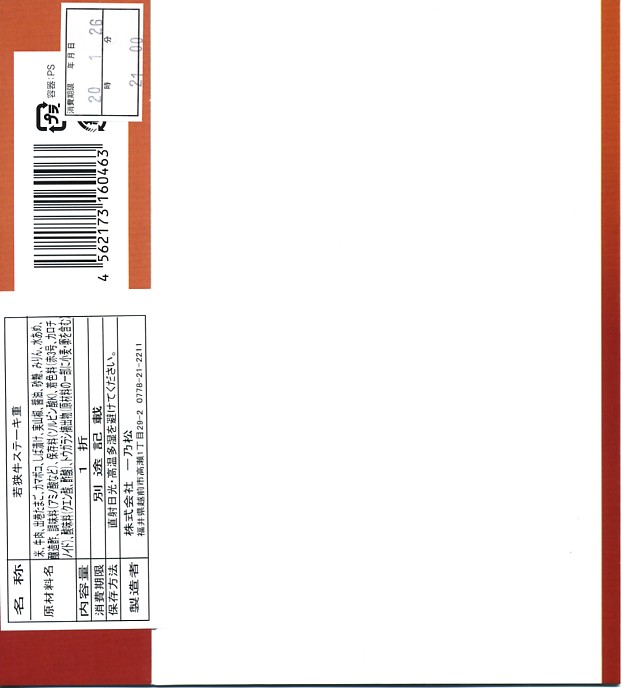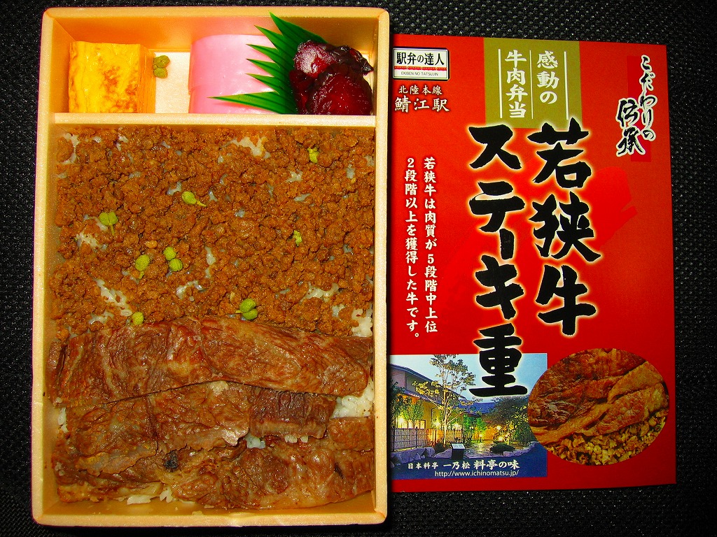 中身は白御飯の上に牛そぼろと牛ステーキ3切れを載せて、蒲鉾、玉子焼、柴漬けを添えた牛丼。ぱさついた感じの牛肉の風味は可もなく不可もなし。分量を考えるとえらく高価だが、5段階中上位2段階以上の若狭牛を使っているとは書かれている。
