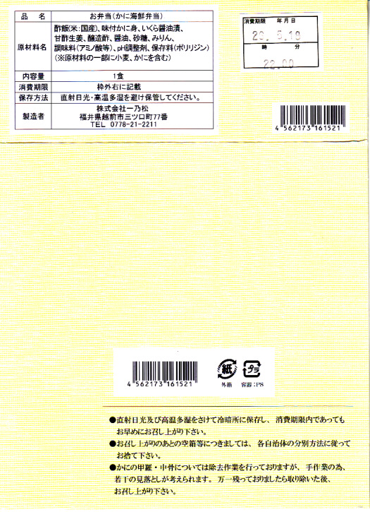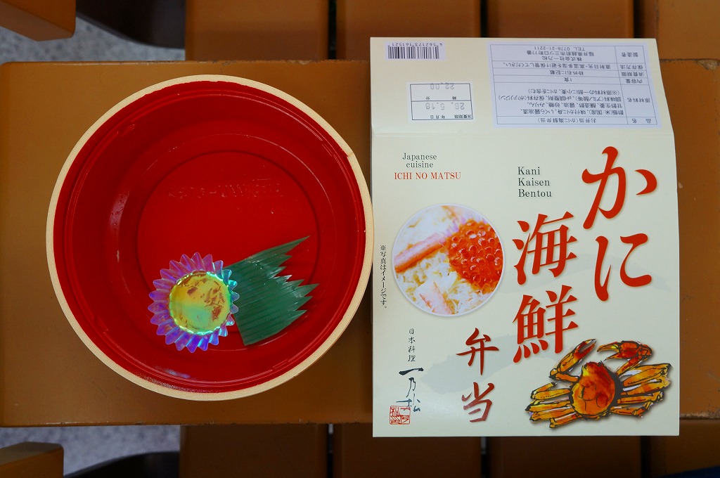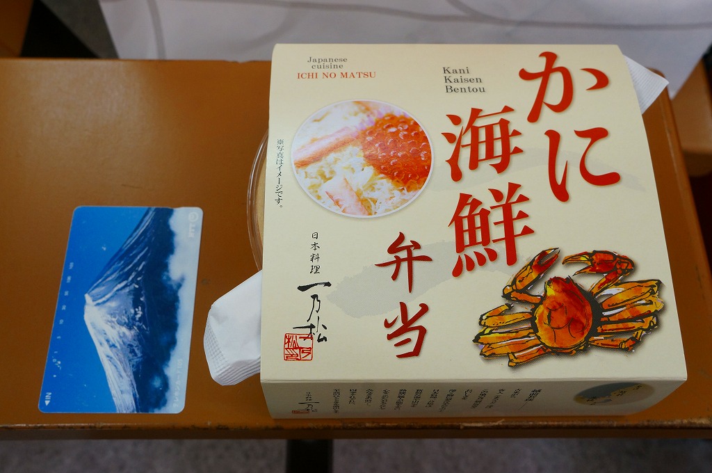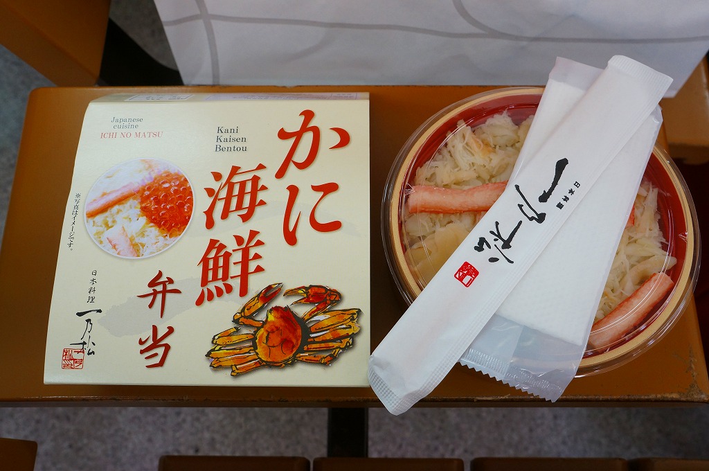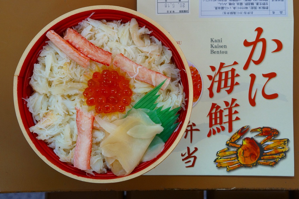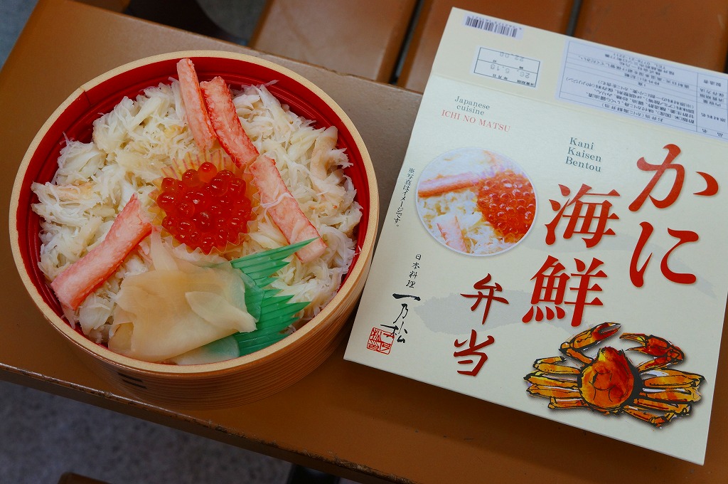 鯖江駅のコンビニで買えたお弁当。丸い容器に酢飯を詰め、カニのほぐし身で覆い、数本のカニ脚とイクラ醤油漬で彩り、ガリを添える。デパートの北海道物産展で買えるような、属地不詳な商品。駅で買えた弁当に、そんな感想を思うのは、ここのこれらの商品は、全国各地の駅弁催事で、その時々に様々な駅や空港や地域や肩書きを名乗って売られるからである。