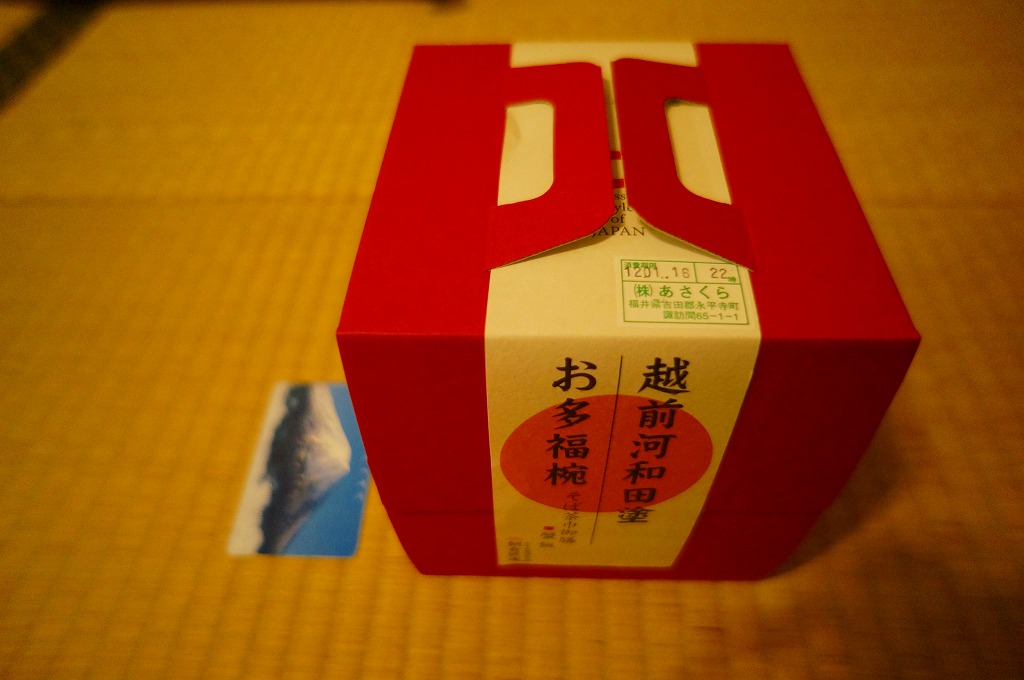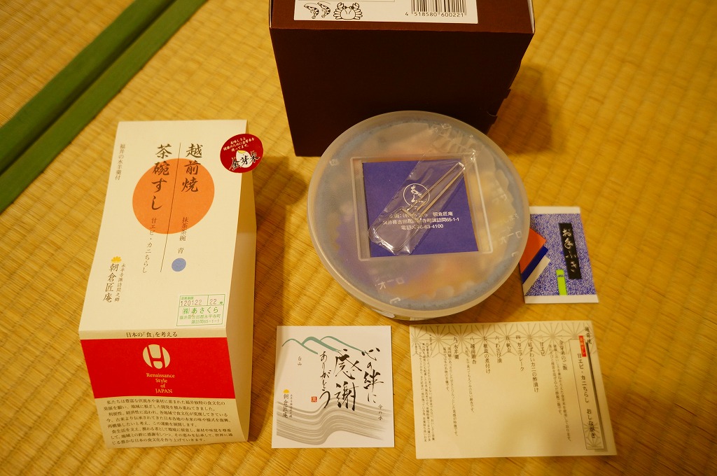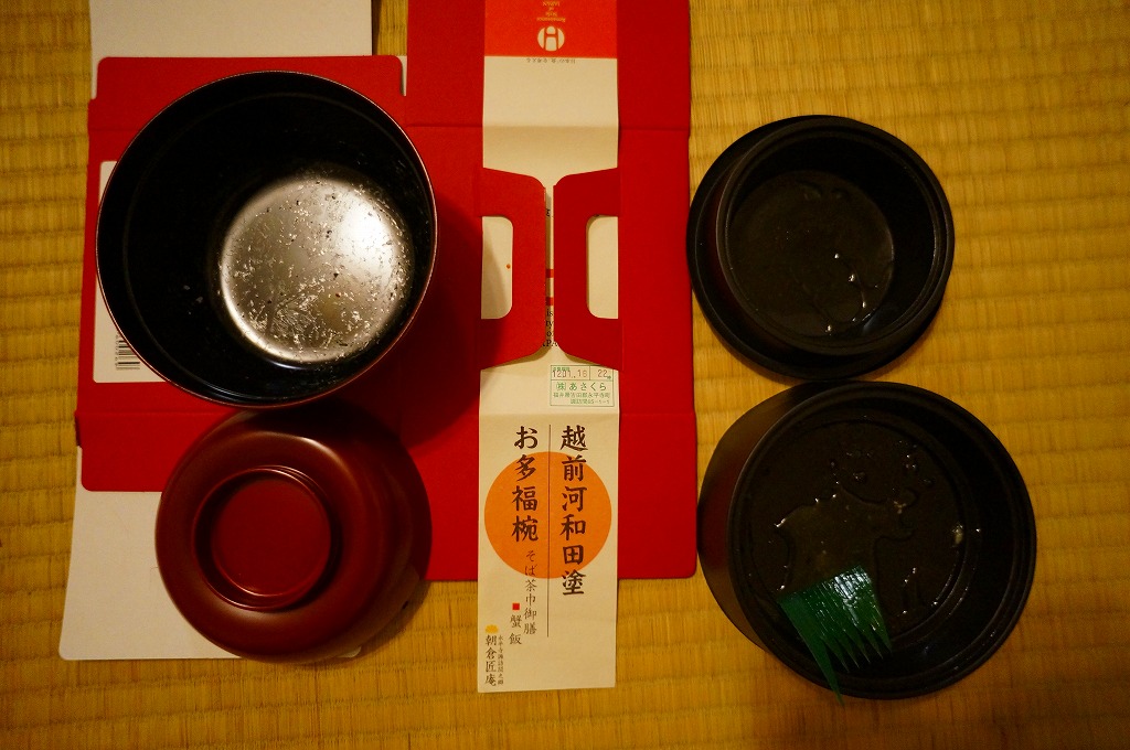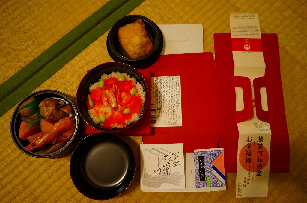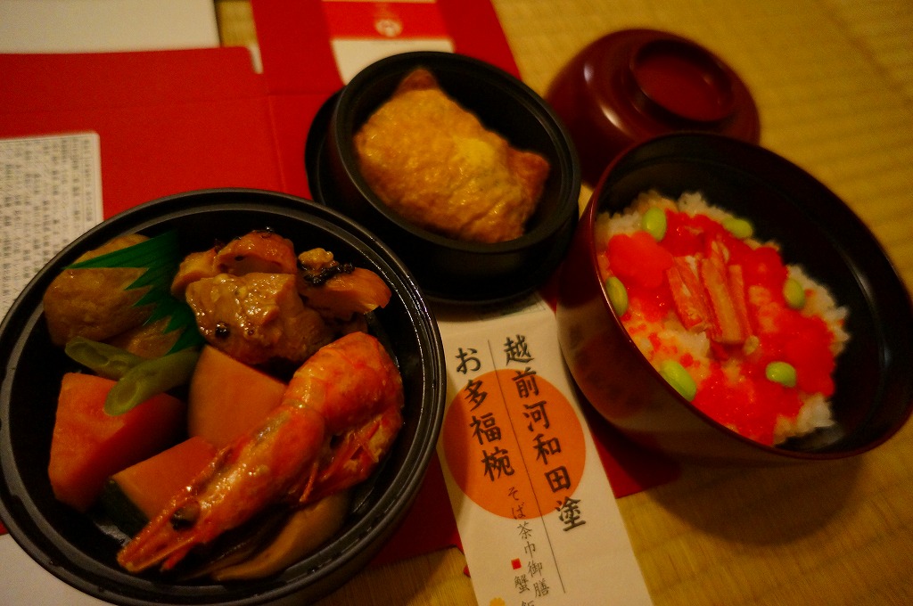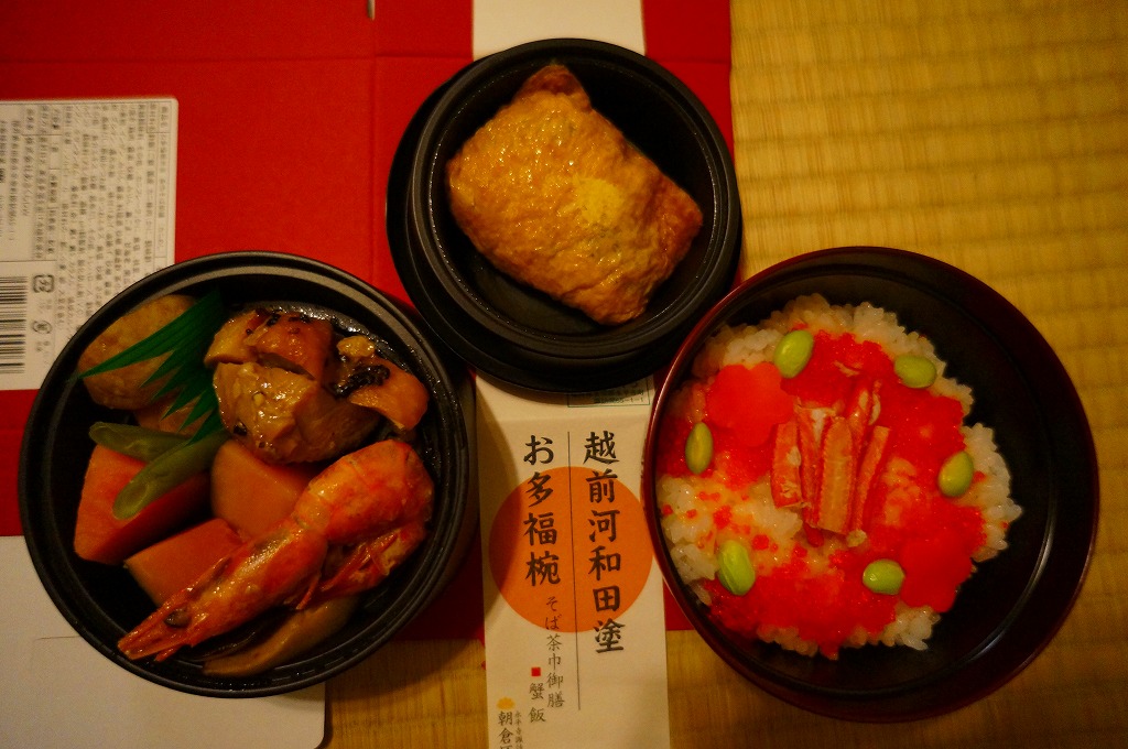 2011(平成23)年12月下旬に福井鉄道の越前武生駅で2種を同時に発売した、福井鉄道史上初の駅弁とされる。越前河和田塗というプラスティック製の椀を、同じような色のボール紙製容器に収める。中身はプラ製トレーで三重になっており、下段にカニとトビッコと枝豆を載せた御飯、中段に有頭海老、カボチャ煮、サトイモ煮、鶏照焼、シイタケ煮などの粒の大きいおかず、上段に茶きんそば。