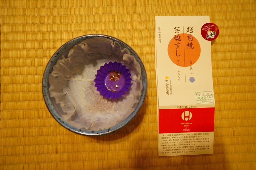 2011(平成23)年9月に北陸自動車道南条サービスエリアの速弁として発売、これが京王百貨店駅弁大会と阪神百貨店の駅弁大会で、JR北陸本線武生駅の駅弁として販売されたもの。「日本古窯弁当シリーズ」とまったく同じ越前焼の茶碗を使用、しおりや掛紙を添えてボール紙の箱に詰める。中身は金芽米の御飯を錦糸卵、カニほぐし身、有頭海老、ホタテ煮で覆い、シイタケやわさび漬などを添え、水ようかんを別添するもの。