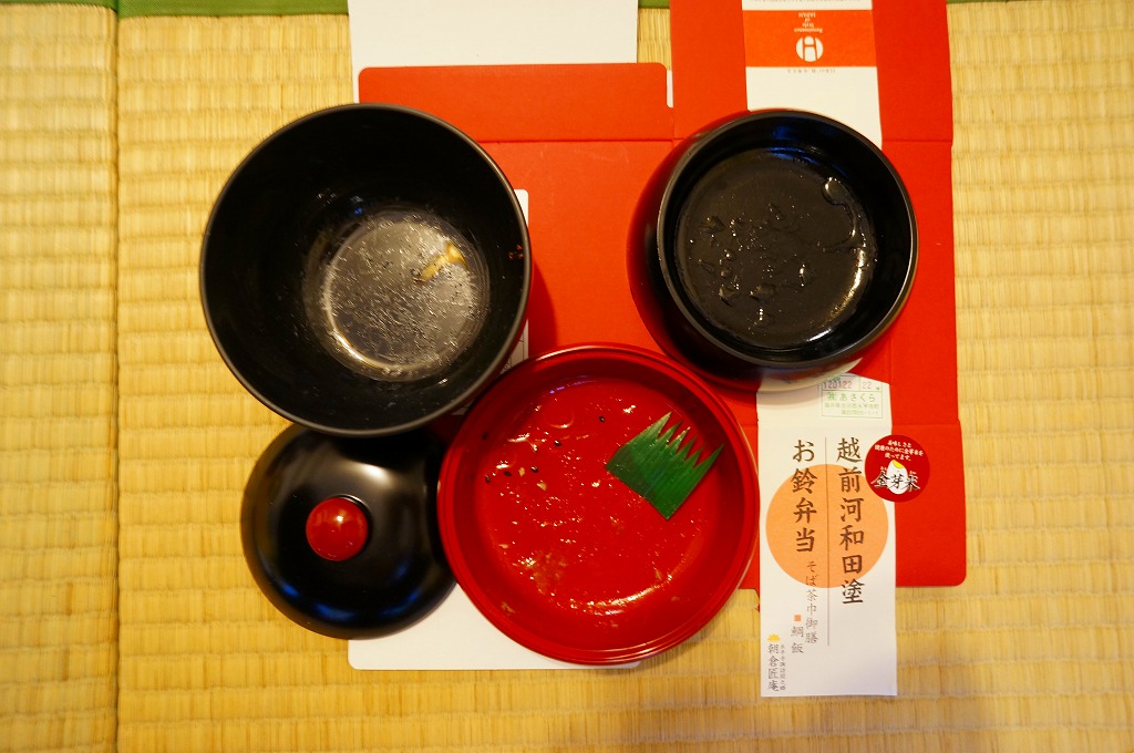 2011(平成23)年12月下旬に福井鉄道の越前武生駅で2種を同時に発売した、福井鉄道史上初の駅弁とされる。越前河和田塗というプラスティック製の黒い椀を、赤いボール紙製容器に収める。容器は二層構造、さらに下層をプラ製トレーで重層にしており、下段にタイやトビッコの御飯、中段に有頭海老、カボチャ煮、サトイモ煮、鶏照焼、シイタケ煮などの粒の大きいおかず、上段に茶きんそば。同時登場の下記商品と容器は違うが中身はほぼ同じ、値段も同じ、実態もおそらく同じ。駅弁と名乗らなければ、下段の鯛飯も中段の茶巾も上段の煮物もおいしくいただける。