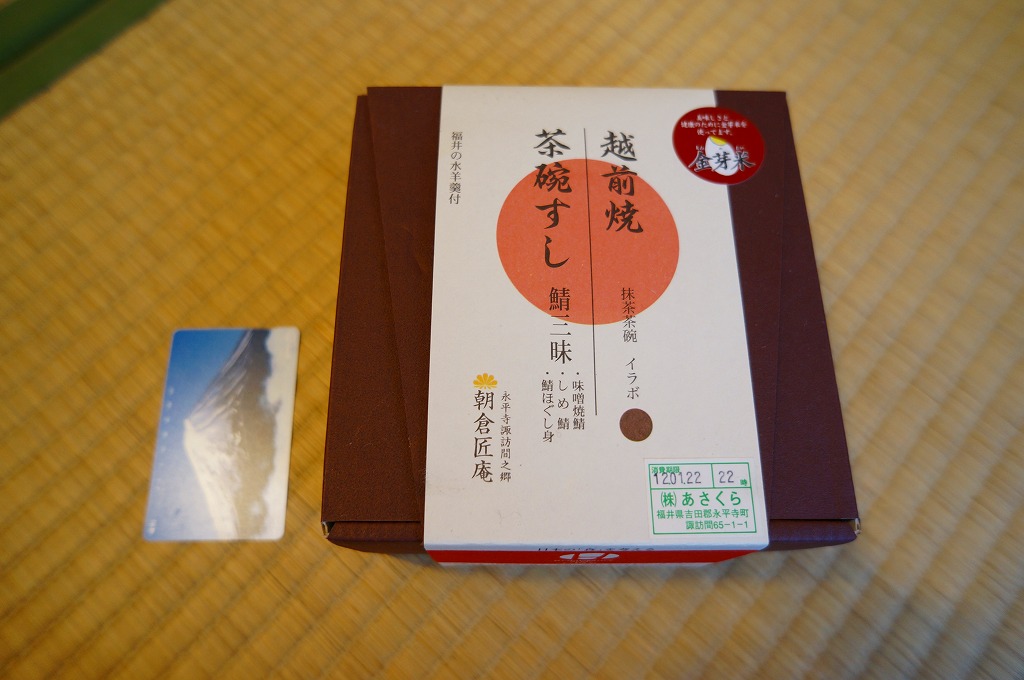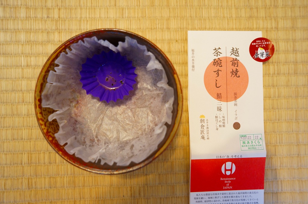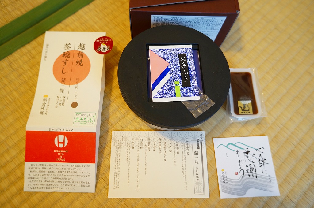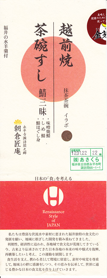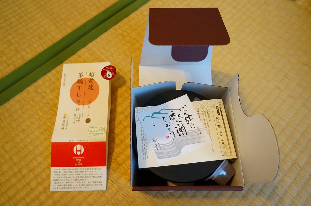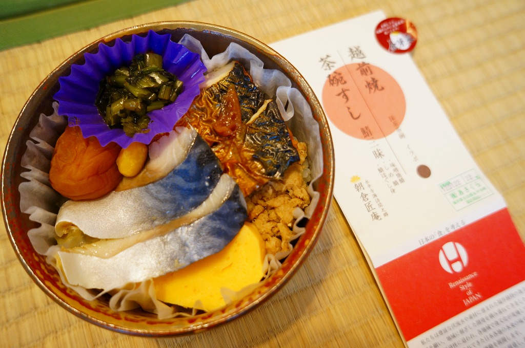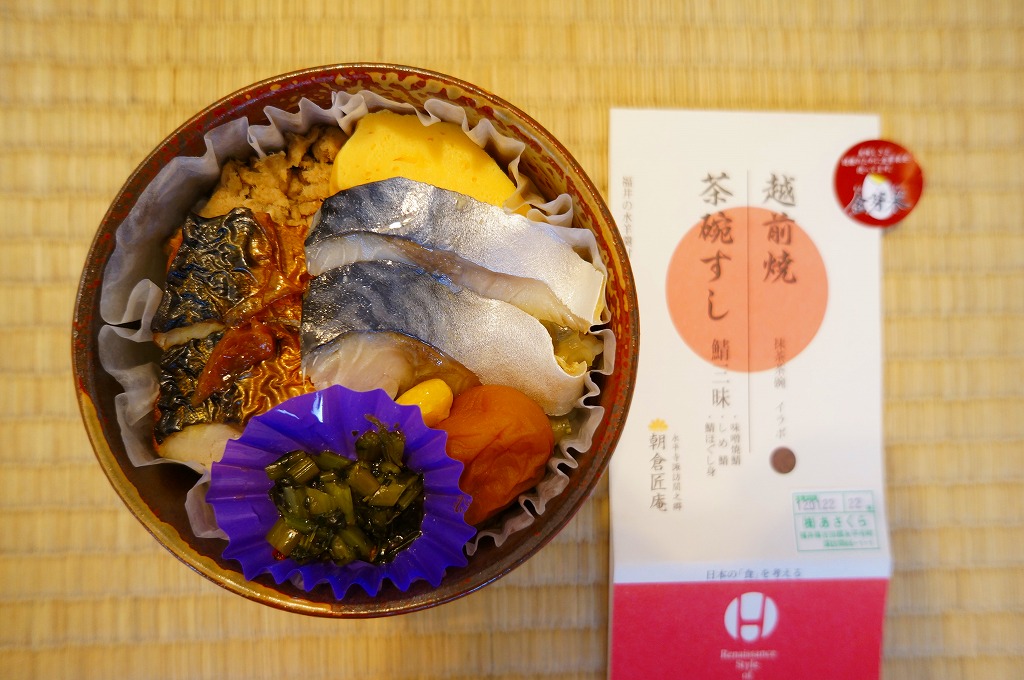2011(平成23)年9月に北陸自動車道南条サービスエリアの速弁として発売、これが京王百貨店駅弁大会と阪神百貨店の駅弁大会で、JR北陸本線武生駅の駅弁として販売されたもの。「日本古窯弁当シリーズ」とまったく同じ越前焼の茶碗を使用、しおりや掛紙を添えてボール紙の箱に詰める。中身は金芽米の御飯をサバ味噌焼、シメサバ、焼きサバほぐし身と3種のサバで覆い、福井梅、わさび漬、玉子焼を添え、水ようかんを別添するもの。