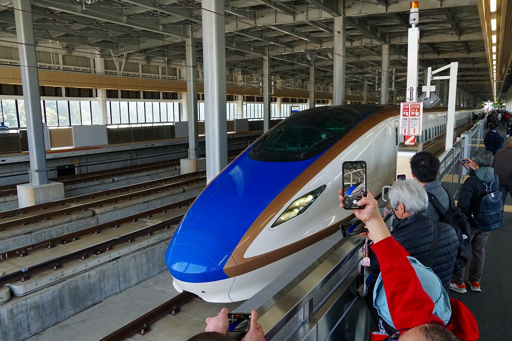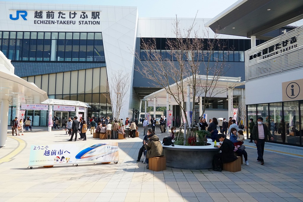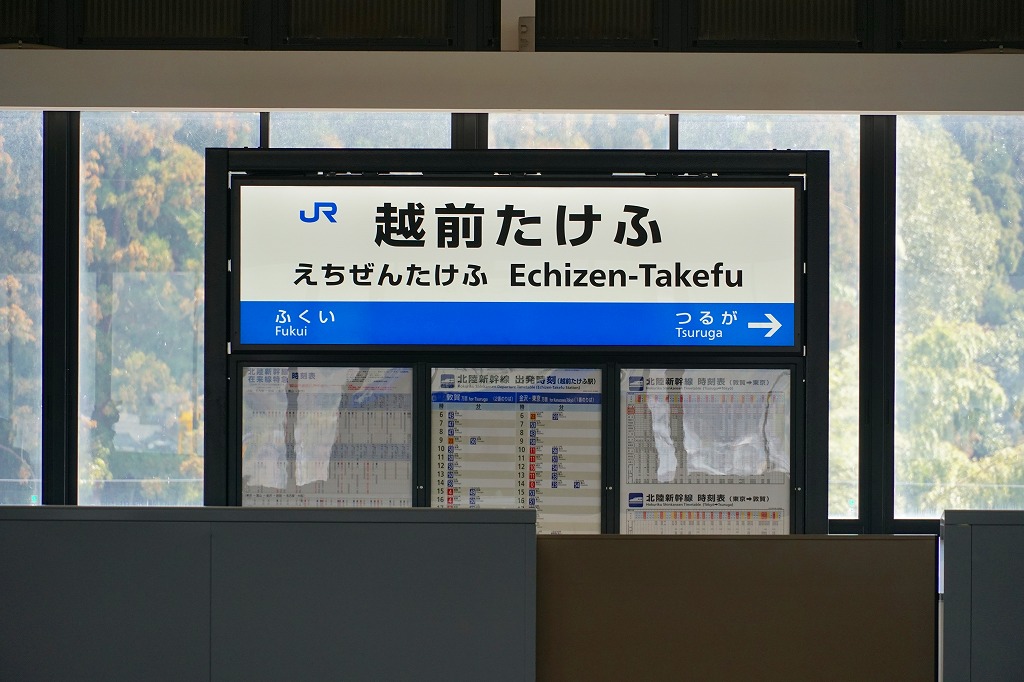 東京駅から北陸新幹線「はくたか」で3時間40分。北陸新幹線の敦賀駅までの延伸開業により、福井駅と敦賀駅との間で、既存の武生駅や鯖江駅から小山を隔てた東側に、道の駅と新幹線の駅ができた。駅弁はないが、道の駅に駅弁のような弁当があり、福井駅でも同じものを見かけた。2024(令和6)年3月16日開業、福井県越前市大屋町。
