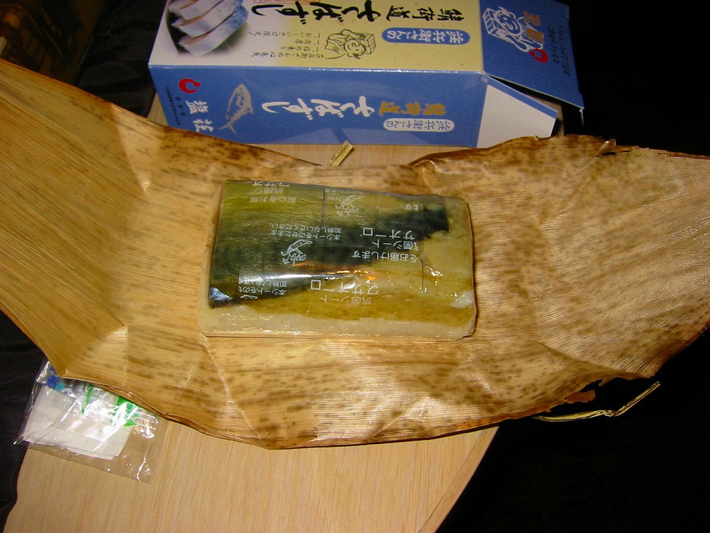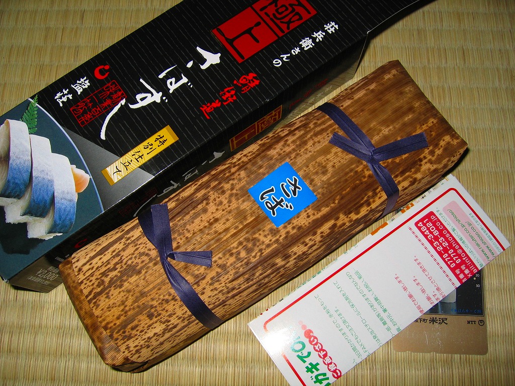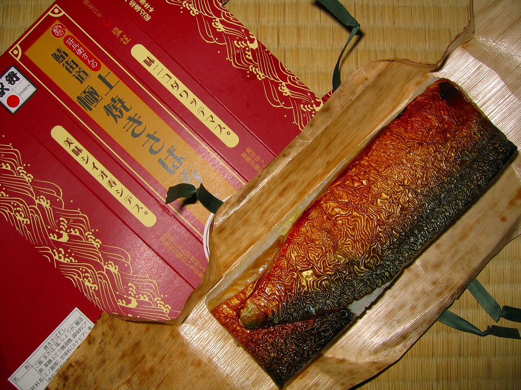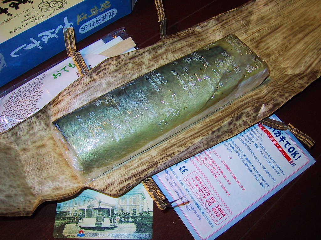 敦賀駅弁の主力商品。酢飯と肉厚で脂の乗った鯖を白板昆布で巻き、笹の葉で包んで針金で巻いて、ボール紙のパッケージに詰め込む。米子や高山の同種駅弁と同等の値段と美味を誇るが、通販注文用ハガキを同封している点が他と異なる。鯛・カニ・マスのバージョンもあり、これも通販で購入可能。価格は2002年の購入時で1,500円、2014年時点で1,550円、2020年時点で1,700円。