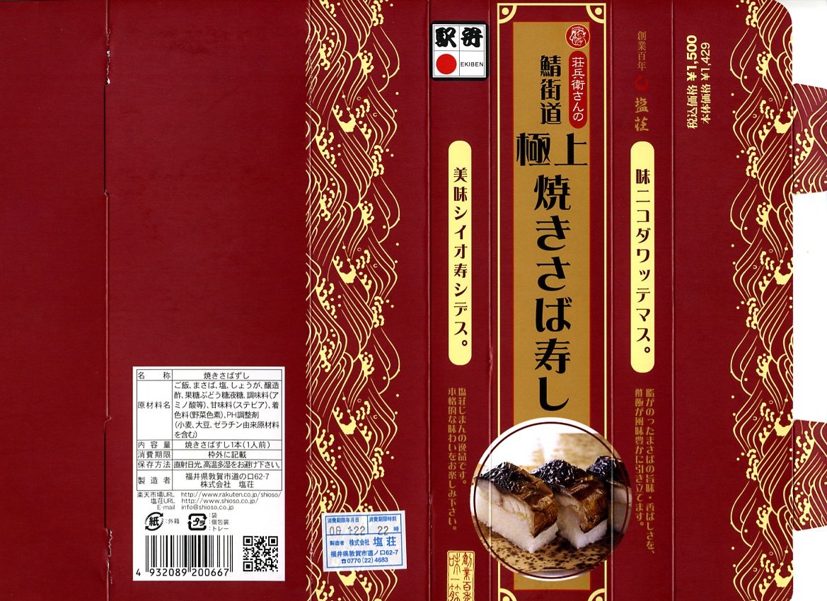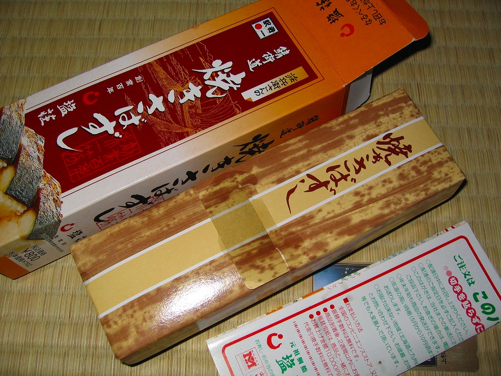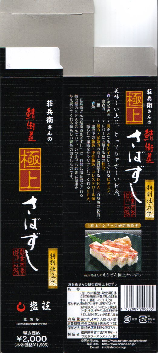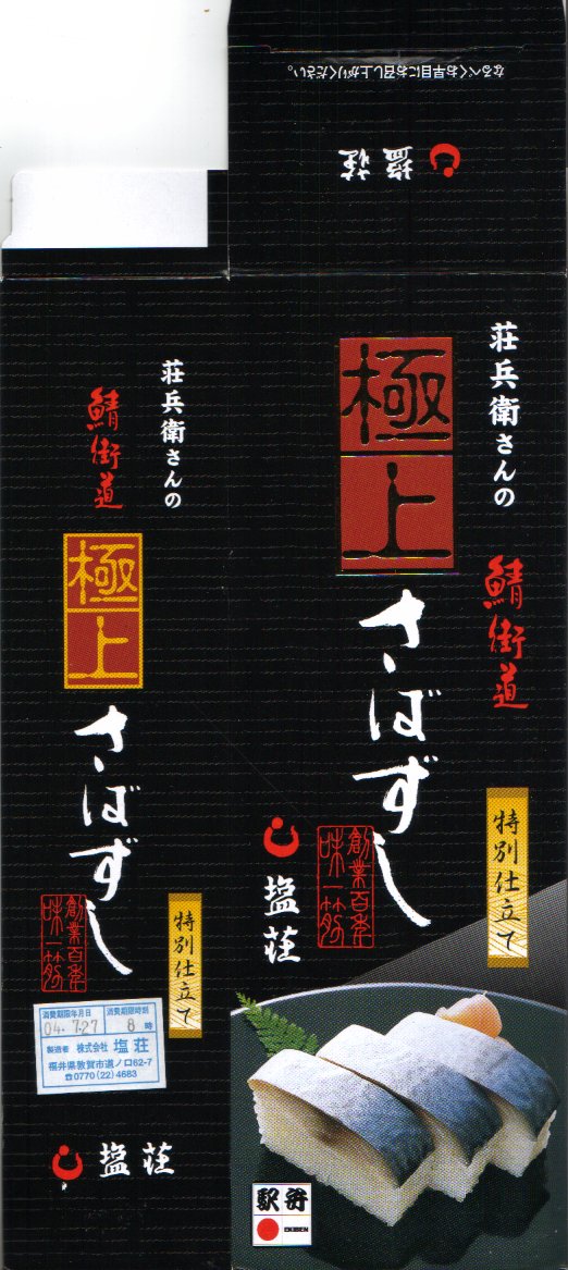 2005(平成17)年の夏か秋の発売と思われる、敦賀駅弁「荘兵衛さんの鯖街道焼きさばずし」の上等版。コンパクトなボール紙容器に見慣れた包装と形状の棒寿司が1本入る。中身は同じだが値段は倍なので、サバも良いものを使えるのだろう、焼き目の細やかさや身の厚さが、通常版より良いような気がした。価格は2006年の購入時で1,500円、2015年時点で1,550円、2020年時点で2,000円。