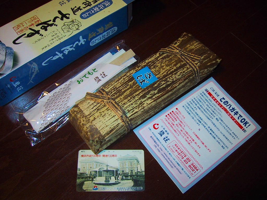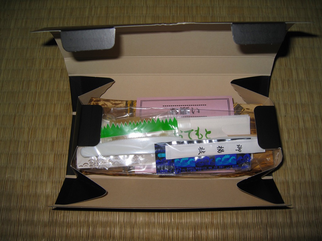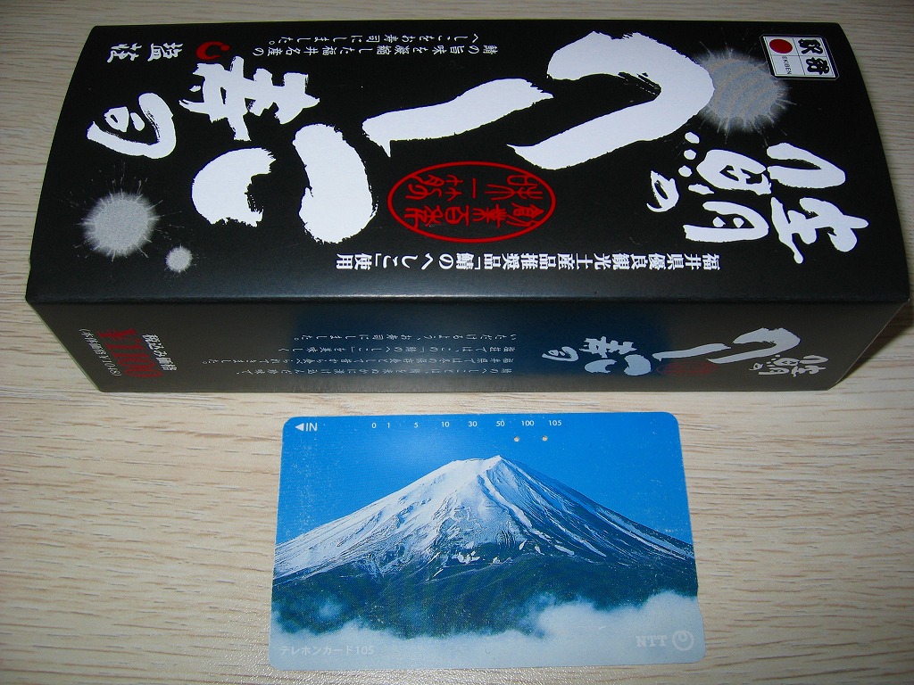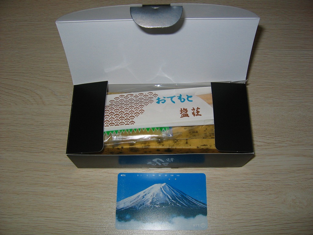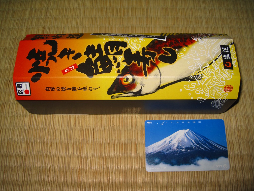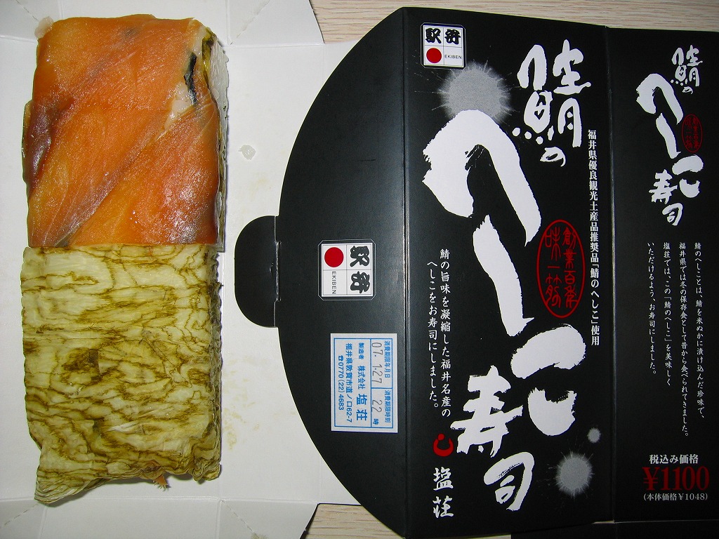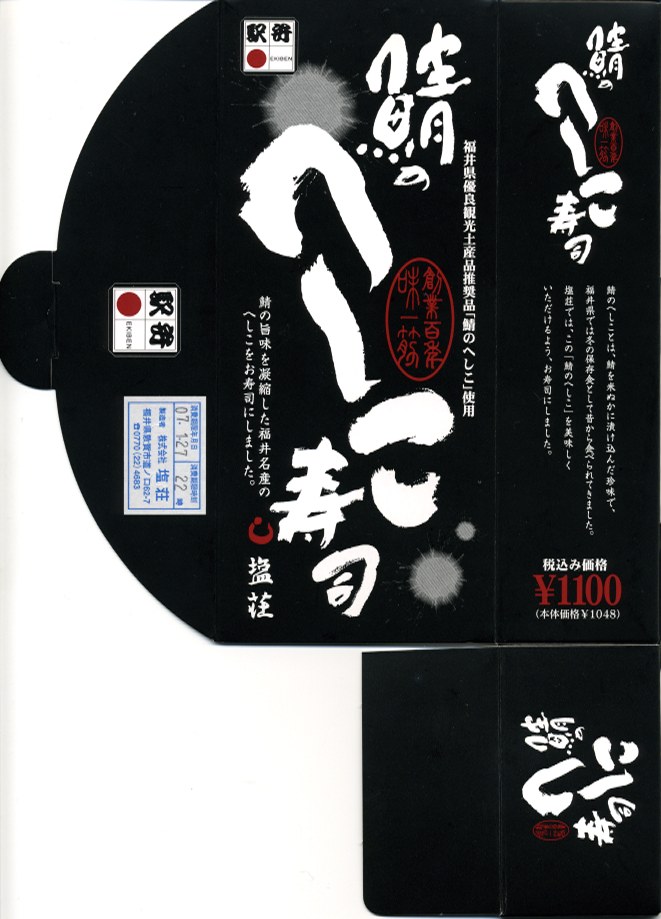 2006(平成18)年の発売か。敦賀駅の棒寿司駅弁でよく見る構造の、黒く小さなパッケージ。中身は棒状酢飯に生ハム色の薄く塩辛い身を貼り、その半分だけ昆布に巻くもの。通常のサバ棒寿司と異なり、とにかく魚の身がない一方で、これだけ分量が少ないのに千円で足りない値段がするので、おそらく不満が先行するだろう。1シーズンで売り止めた模様。