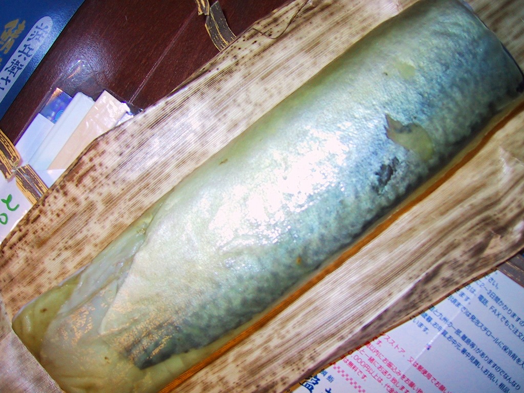 2003(平成15)年の末頃に発売か。有名な空弁「みち子がお届けする若狭の浜焼き鯖寿司」の影響を受けて商品化されたようで、調製元のネット通販サイトでは「今、空弁&駅弁で大大大ブレイク中」などと宣伝された。酢飯の上に焼鯖をたっぷり載せた棒寿司を、竹皮に模したボール紙で包み、フルカラー印刷のパッケージに包む。