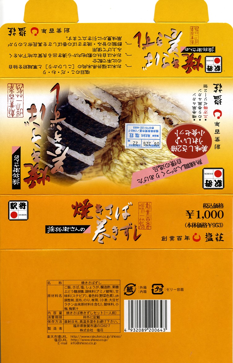 上記の駅弁「荘兵衛さんの鯖街道焼きさばずし」の、2011(平成23)年時点での姿か。内容と味は同じだが、竹皮は本物になり、駅弁の名前は短くなり、パッケージと中身が小さくなった感じで、しかし価格は300円も上がって1,100円。酢飯がノーカットで1本なのに、焼サバが6切れにカットされている不思議な合わせ方だった。2015年時点での価格は1,150円。2015年までの販売か。