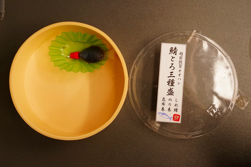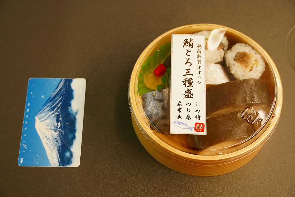 敦賀駅で買えた鯖寿司。敦賀駅の駅舎に見える交流施設「オルパーク」の1階で、駅と駅弁売店を結ぶ通路に、敦賀で1986年創業の水産物屋が屋台を出し、サバの箱入り棒寿司や米などを販売していた。丸い惣菜プラ容器に、しめ鯖と酢飯を合わせた鯖寿司を2切れ、さらに黒板昆布で巻いた鯖寿司を2切れ、しめ鯖の細巻きを2個詰めた。敦賀駅のコンビニにない味わいと、価格と内容で敦賀駅で普段売られる駅弁にない手軽さがある。この調製元の鯖とろ寿司は、脂がのって身の厚い三陸産の鯖を使用し、独自の製法で生よりおいしい鯖とろ寿司を実現したという。