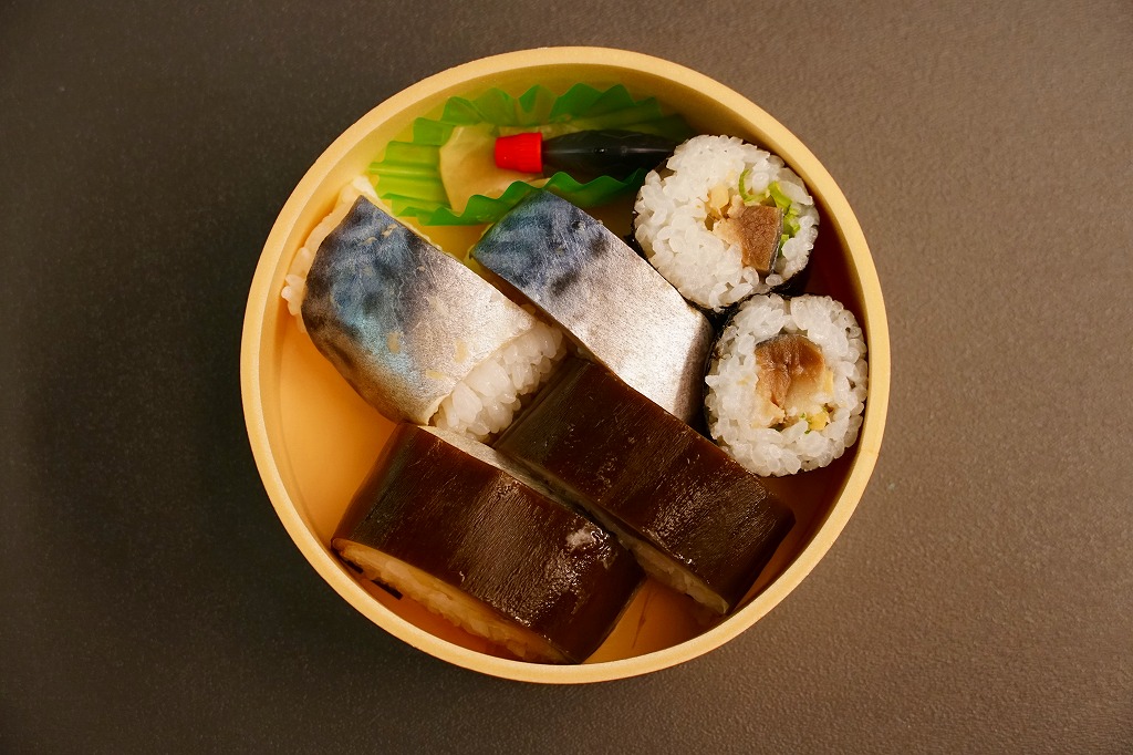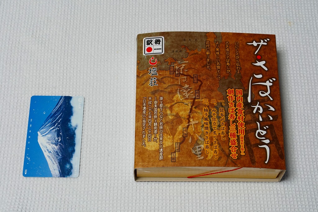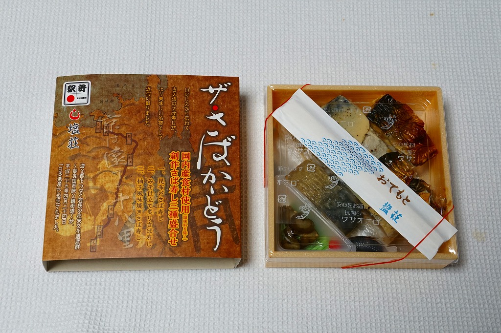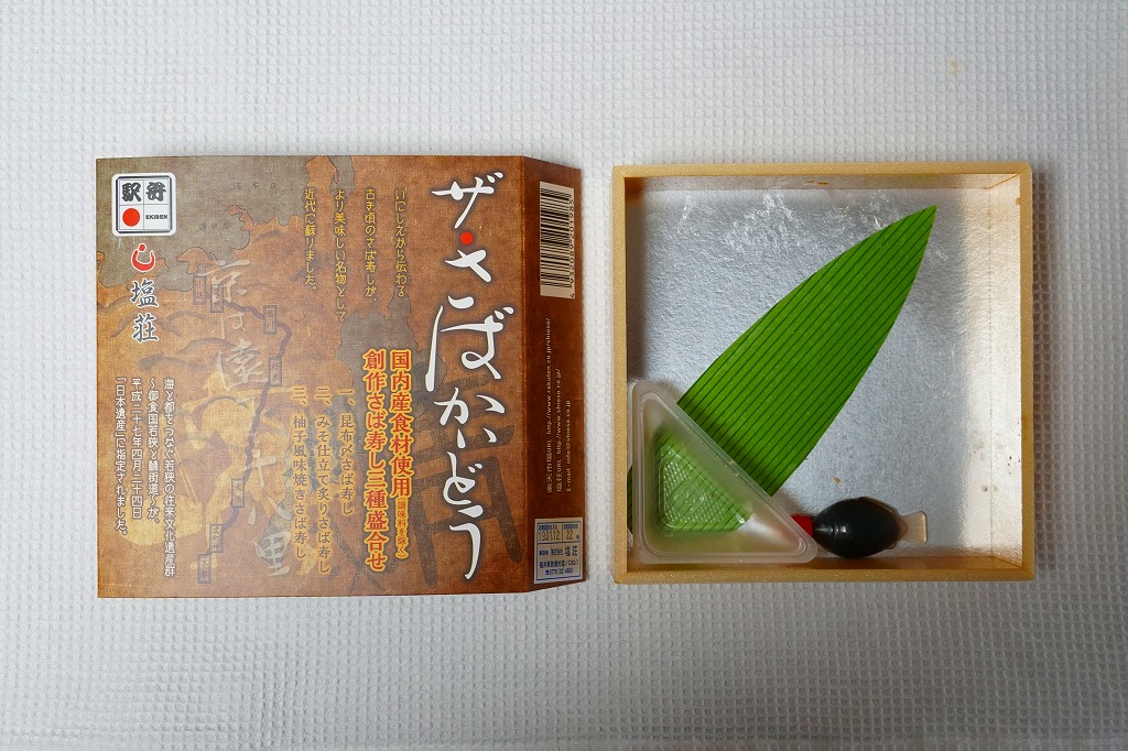 2015(平成27)年8月までに発売。小箱の中身はサバの棒寿司のカットが6切れ。その内容がスリーブに記載されているとおり、昆布〆さば寿しが2切れ、みそ仕立て炙りさば寿しが2切れ、柚子風味焼きさば寿しが2切れ。棒寿司の駅弁と同じ味を、食べやすく少しだけいただけるので、車内や旅先で食べる駅弁としては、こちらが重宝すると思う。2019年頃までの販売か。