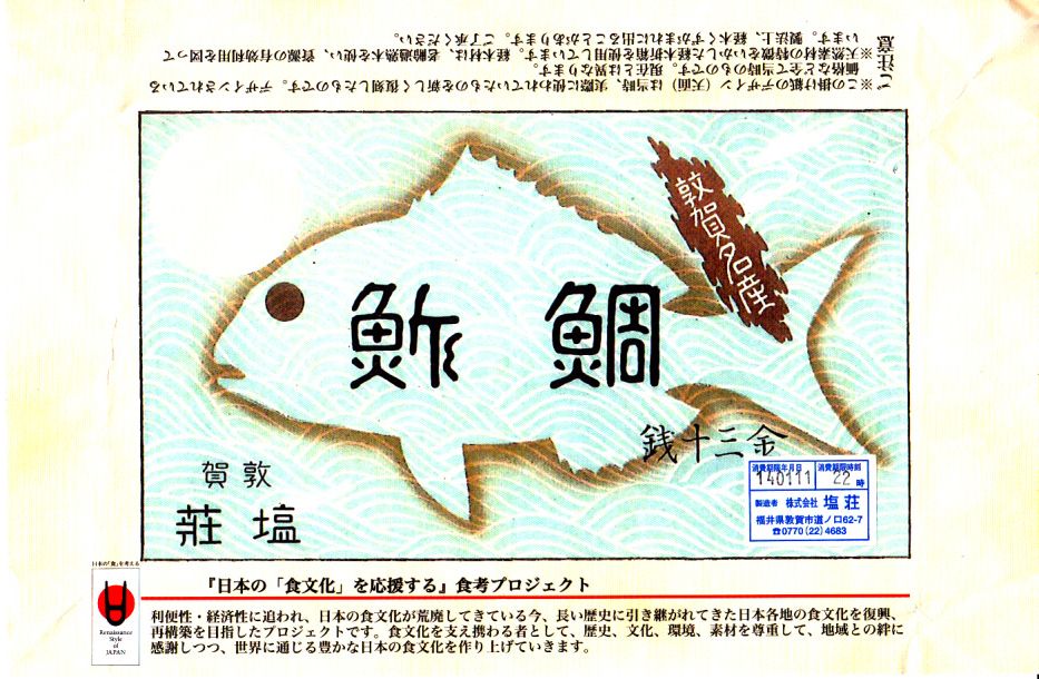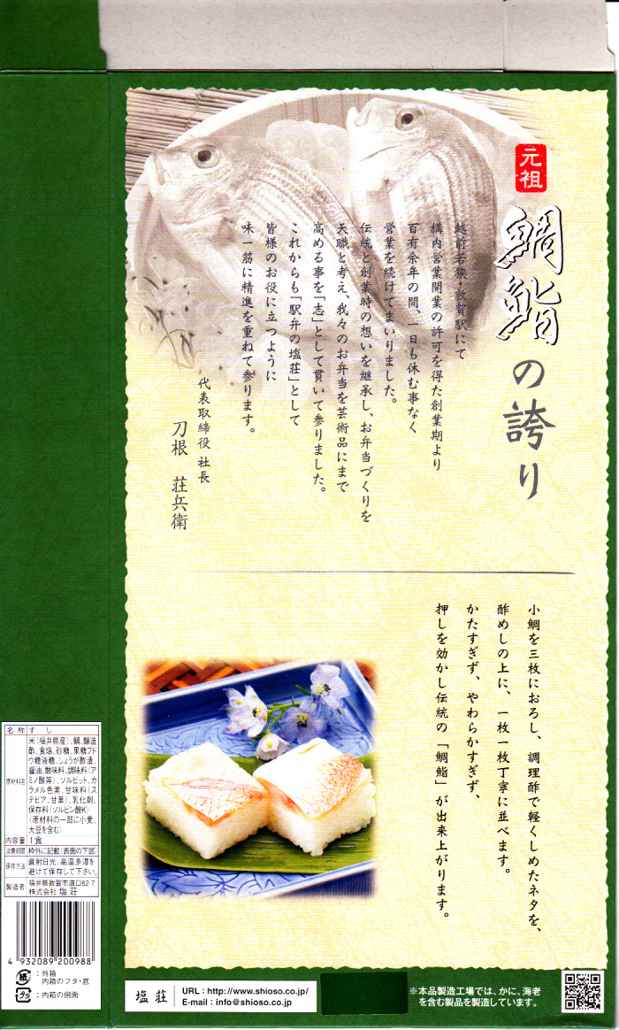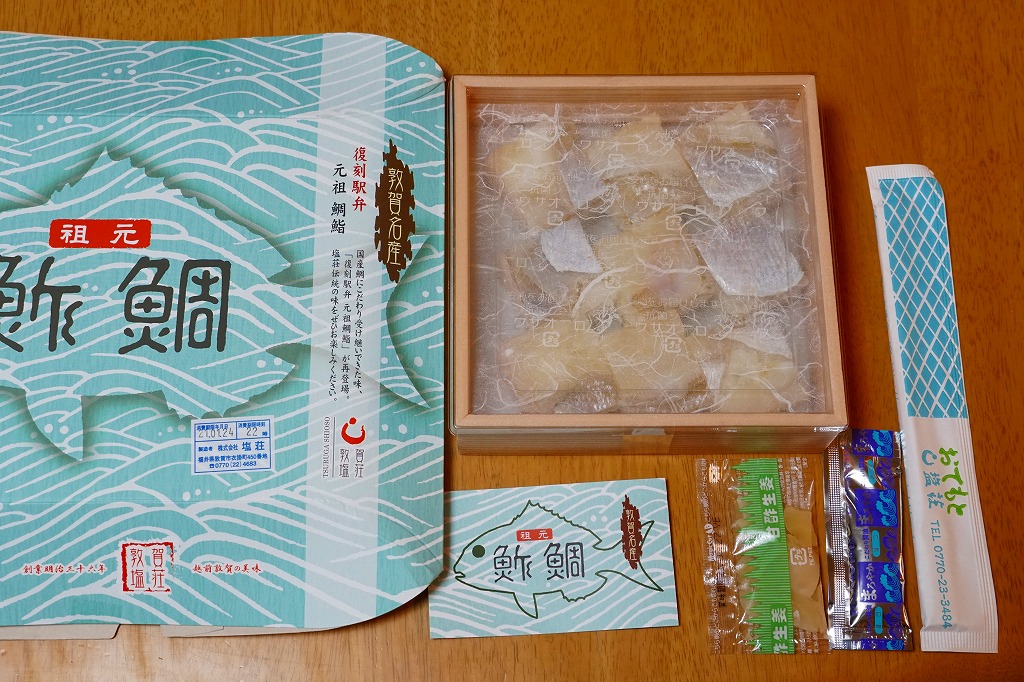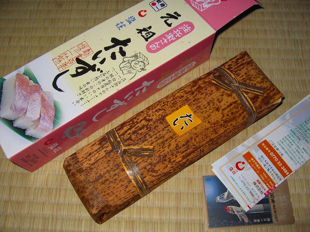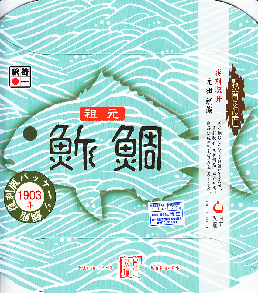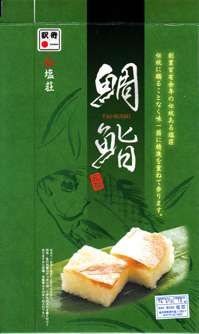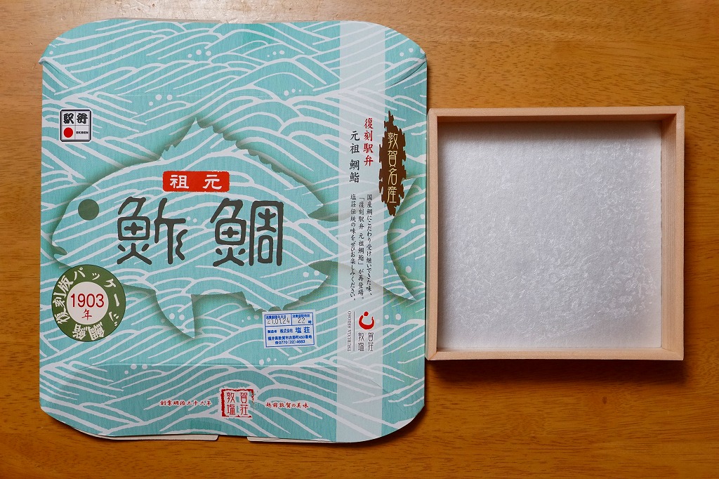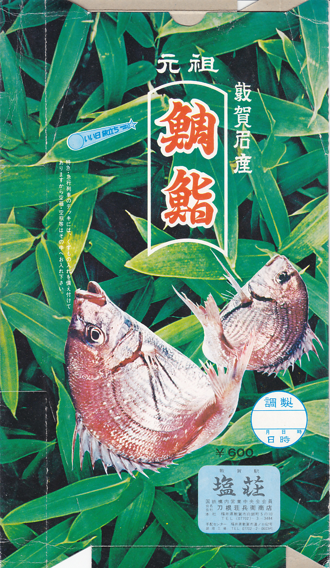 2003(平成15)年1月10日に購入した、敦賀駅弁の箱。当時は「元祖鯛鮨」の折箱を収める紙箱について、折箱の形に合わせ、四隅の角が落とされていた。この形状は昭和時代からのものであった。