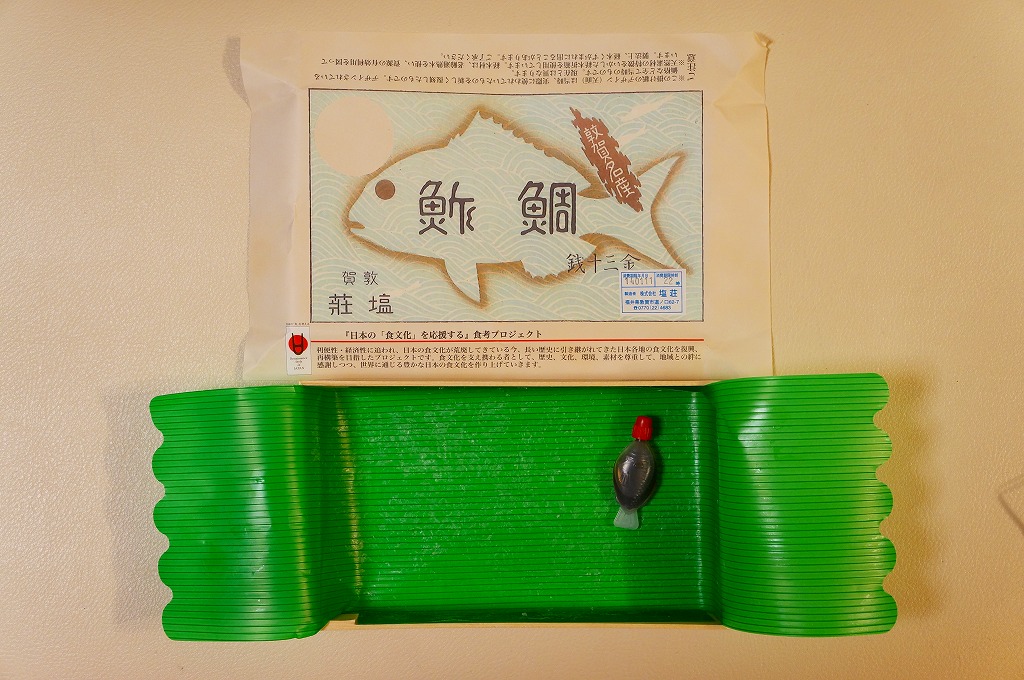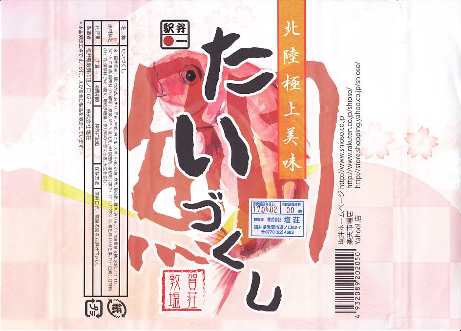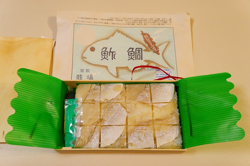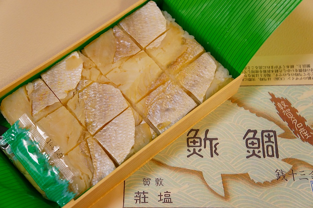 敦賀駅弁の主力商品「荘兵衛さんの鯖街道さばずし」の、サバがタイに変わったもの。酢飯の上に鯛の身を敷いて、抗菌シートとともにラップで巻いてから笹の葉で包み、針金で止めて化粧箱に入れる。うまみも強いがクセも強いので、万人受けはしないと思う、高品質で高価格な土産物系棒寿司駅弁。通信販売対応商品。価格は2004年の購入時で1,500円、2014年4月の消費税率改定で1,550円、2020年時点で1,700円、2023年時点で1,800円。