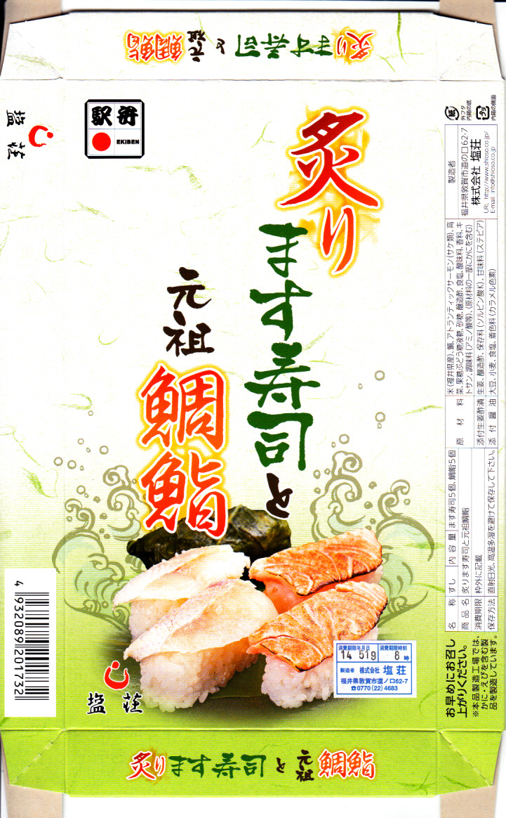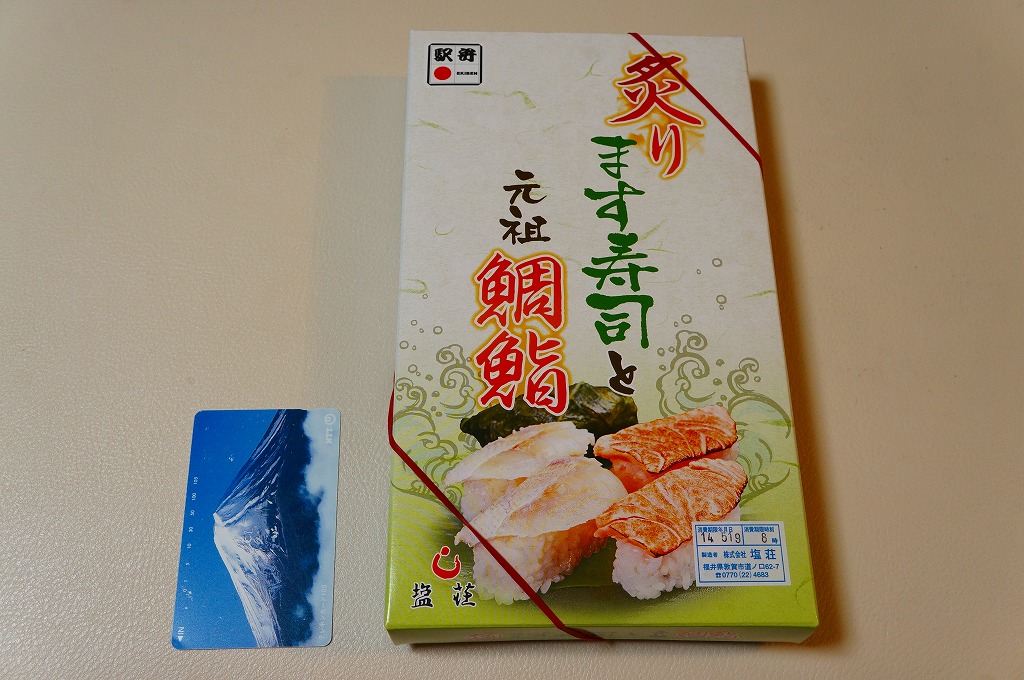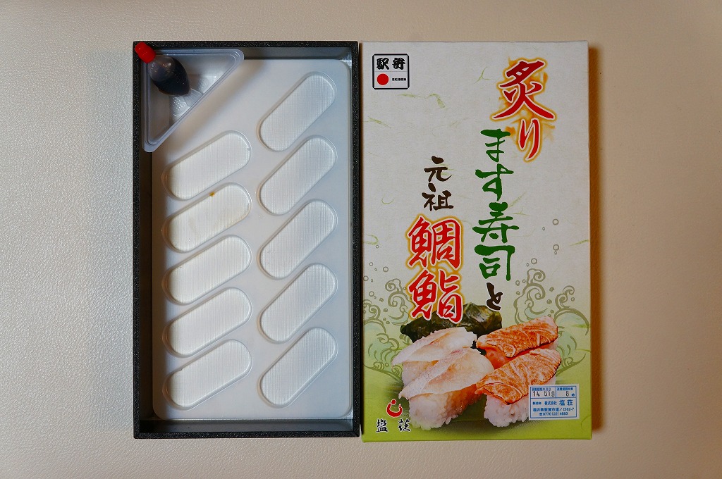 2013(平成15)年の秋までに発売か。その名のとおり、炙ったマス(サーモン)寿しを5個、敦賀駅弁の元祖鯛鮨を4個、加えて高菜巻を1個、プラ製トレーのくぼみにはめて、ガリと醤油を加え、名前と中身の写真を印刷したボール紙の箱に詰める。詰め方は味気ないが、味は確か。伝統の元祖鯛鮨に、トロトロで脂の乗る炙りマスに、モチモチ感を詰め高菜巻。価格は2014年の購入時で1,030円、2019年時点で1,100円、2020年時点で1,180円、2023年時点で1,280円。