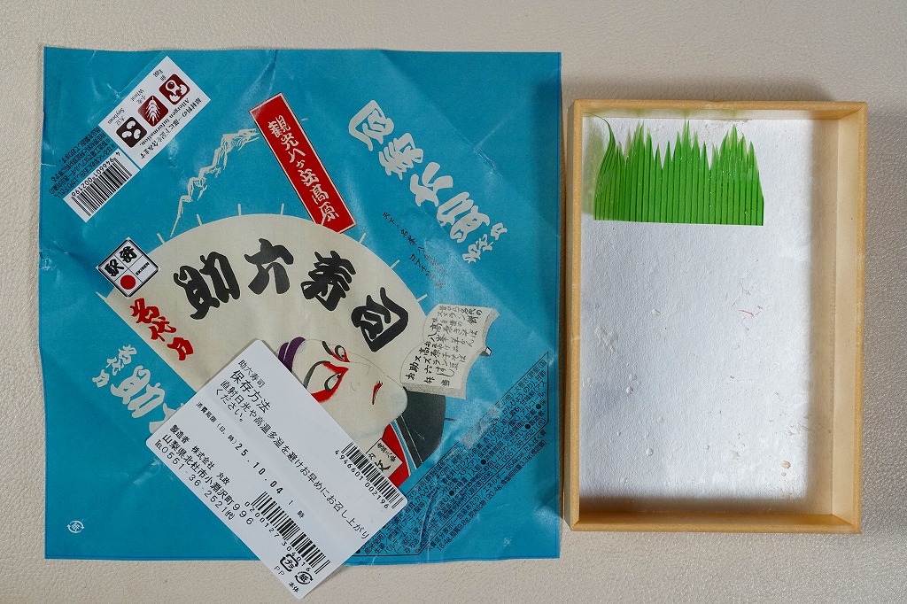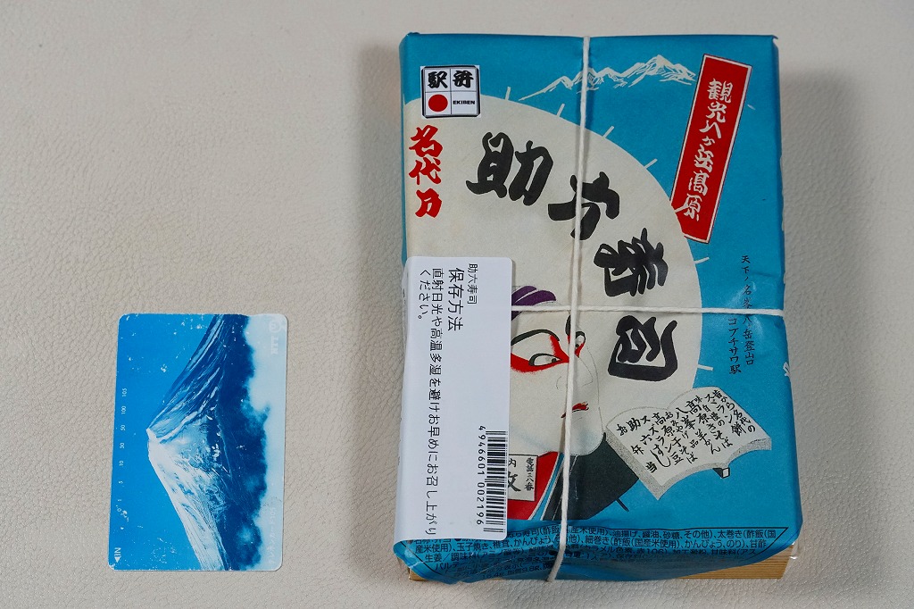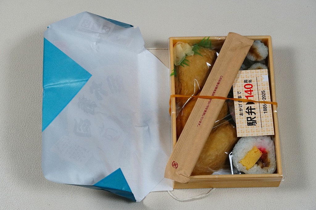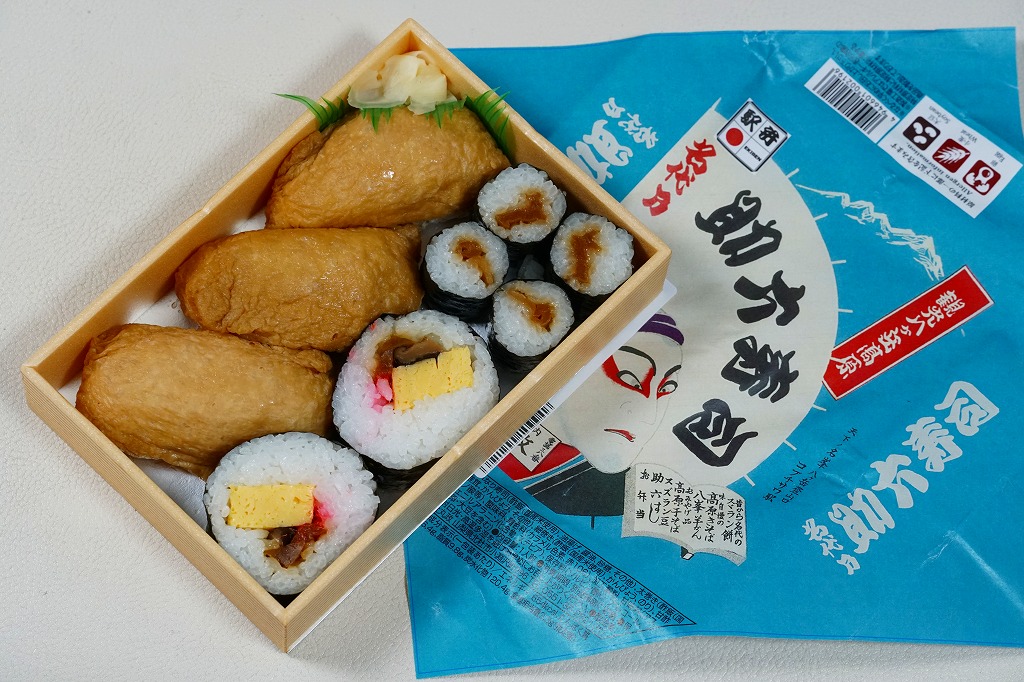 日本鉄道構内営業中央会が駅弁誕生140周年を記念して、会員のうち34社が原則として2025(令和7)年10月1日から販売した、復刻をテーマにした駅弁の、小淵沢駅弁の丸政バージョン。加えてJR東日本の駅弁キャンペーン「駅弁味の陣2025」にエントリーし、10月1日から11月30日まで販売した。1938年に販売を開始した助六寿司の復刻版で、販売当時のパッケージを使用したという。中身は自家製いなり寿司3個、玉子焼きや椎茸煮などの太巻き2個、かんぴょうの細巻き4個で、まさに語源どおり揚巻と助六の寿司。値段はだいぶ上がったため、記念の駅弁という位置づけは良かったと思う。