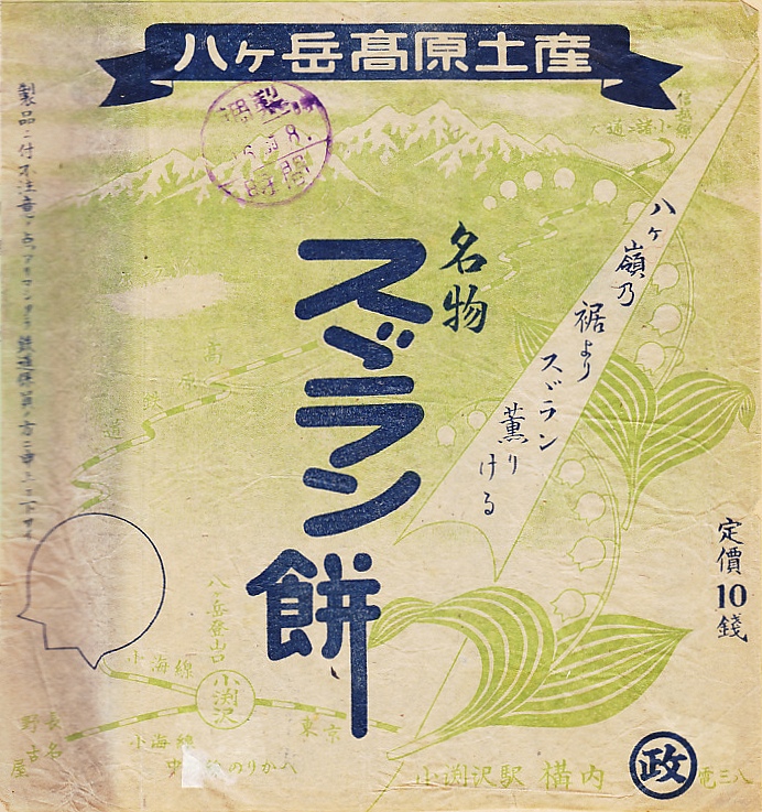 第二次大戦前のものと思われる、昔の小淵沢駅弁の掛紙。上記の復刻商品「寿ずらん餅」の、現役当時のもの。現在のJR小海線が全通し「小海線」の名が付いた、1935(昭和10)年11月以降のものだろう。当時もこの旧国鉄で最高所を走る路線が「高原鉄道」とみなされたことがうかがえる。八ヶ嶺乃裾よりスゞラン薫りける、のだそうな。調製印を押す欄をスズラン型にしたのに、調製印は全然違う場所に押された。