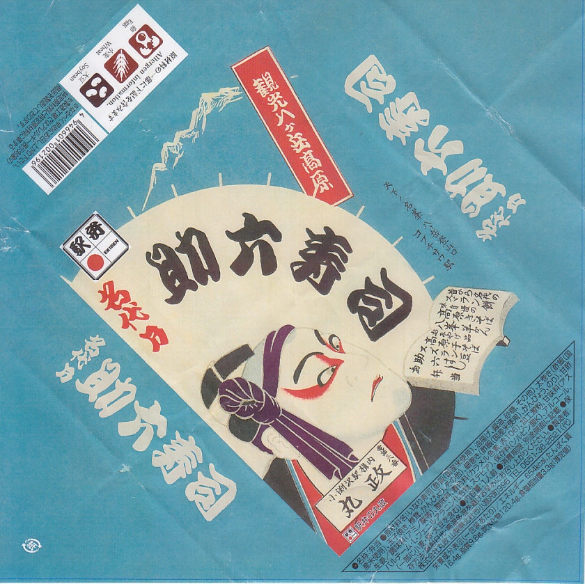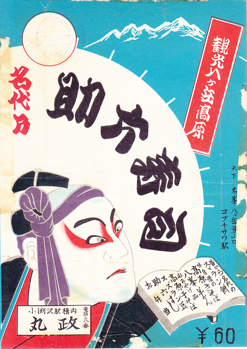 1950年代、昭和30年前後のものと思われる、昔の小淵沢駅弁の掛紙。小淵沢駅が八ヶ岳のふもとにあることと、助六寿司が歌舞伎の演目にちなむことは変わらないが、台本に描いた駅弁屋の取扱商品は、今とはだいぶ違う。