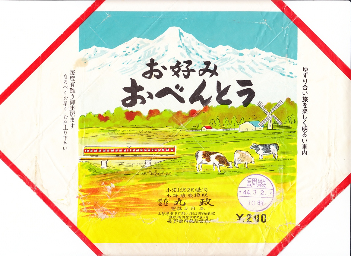 1969(昭和44)年3月2日10時の調製と思われる、昔の小淵沢駅弁の掛紙。八ヶ岳を描くのは小淵沢駅弁ならではで、加えて小海線をイメージしたような牧場と列車も描く。調製元表記の所にも「小海線乗換駅」と記す。