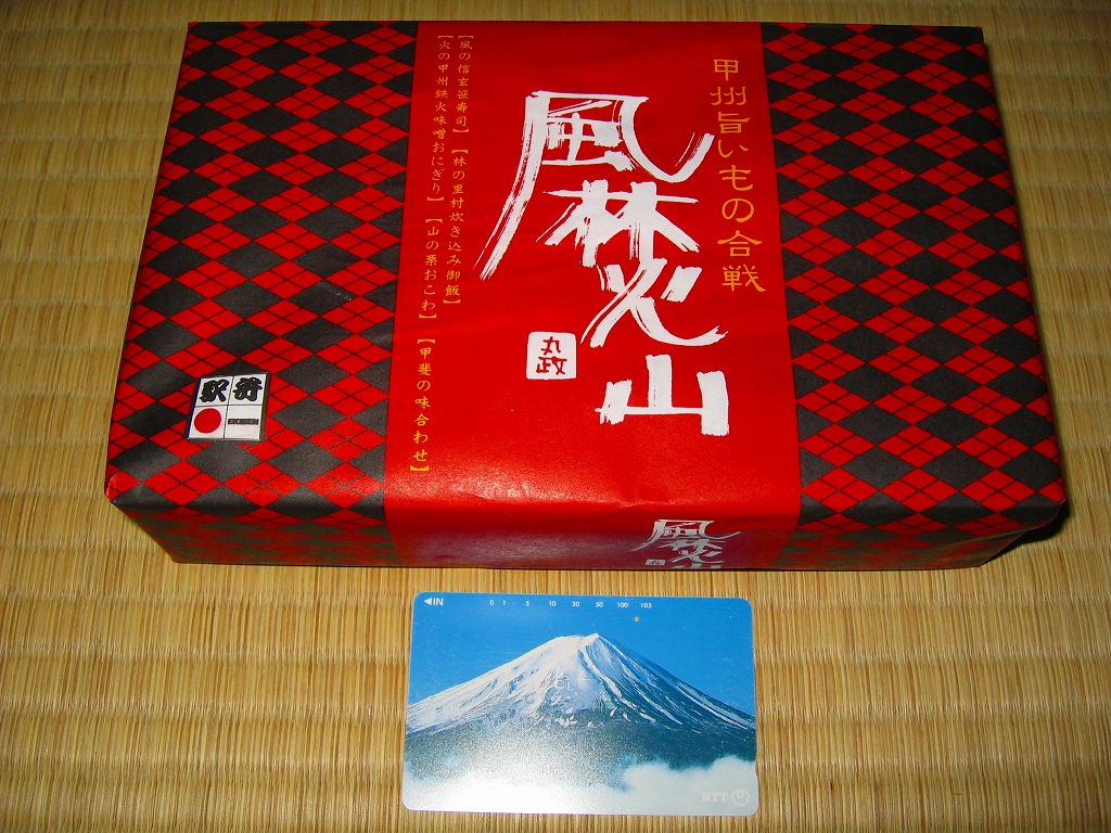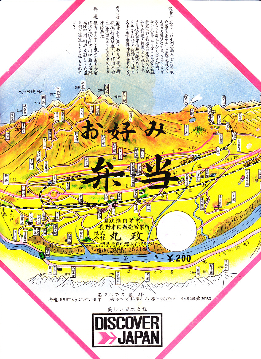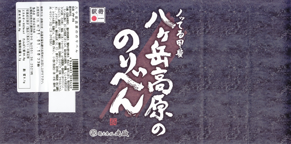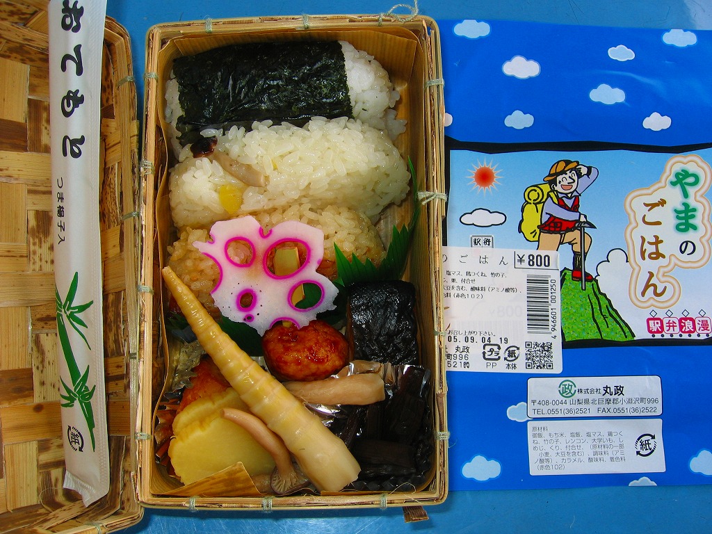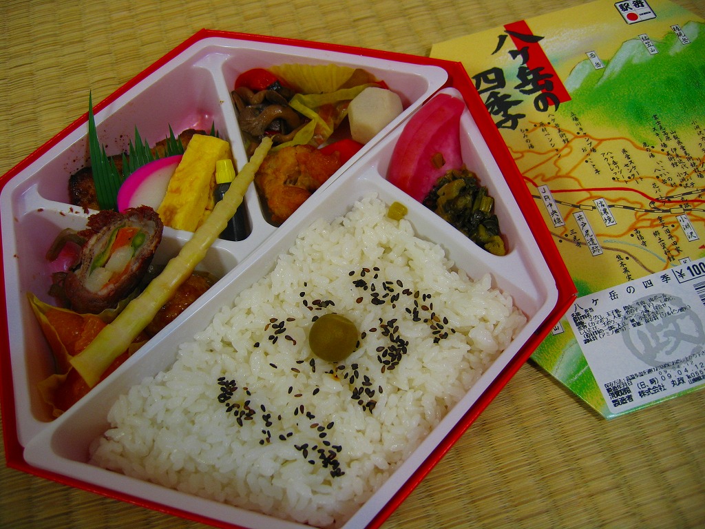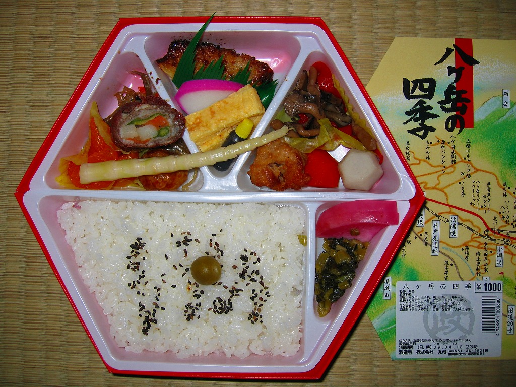 1999(平成11)年に発売された、主に甲府駅で売られる幕の内弁当。正六角形のボール紙製容器には、小淵沢を中心とした鉄道や道路や高速道路の路線図と周囲の山々が描かれるが、ここに甲府駅は入っていない。中身は日の丸御飯にマグロ照焼、玉子焼、鶏唐揚、牛肉野菜巻、肉団子、ニンジンやタケノコなどの煮物、カマボコ、しめじ和え、ミカンなど。