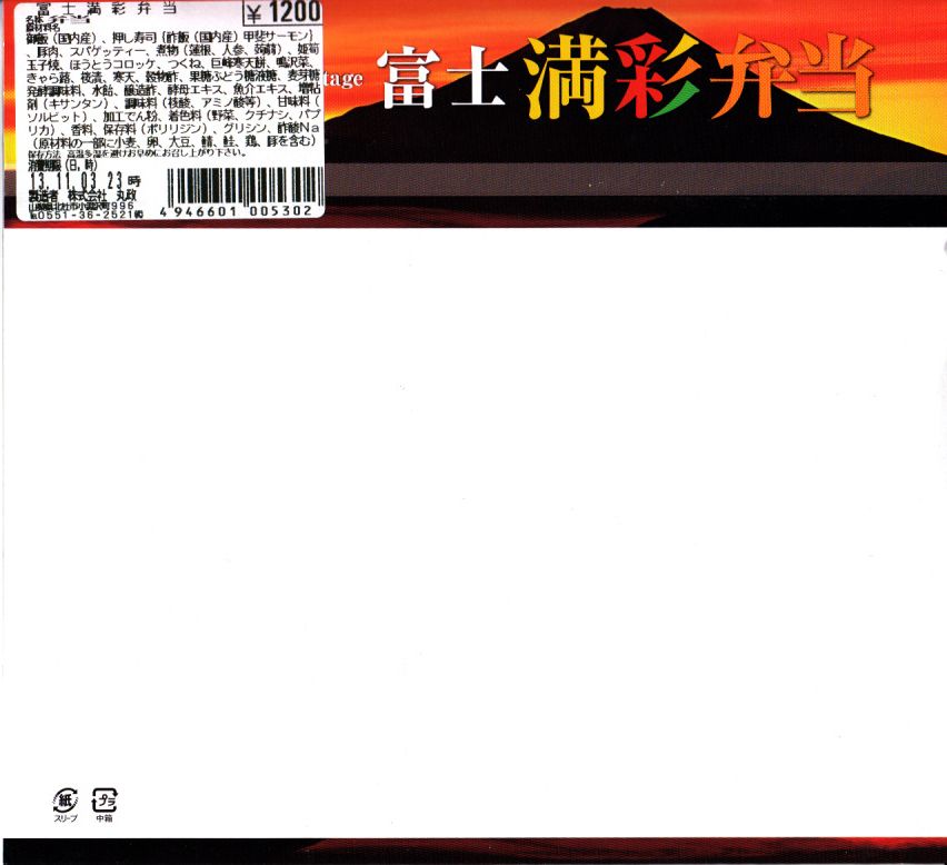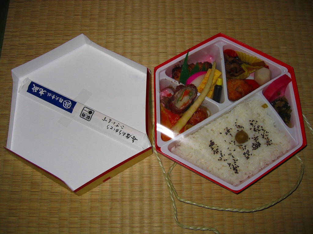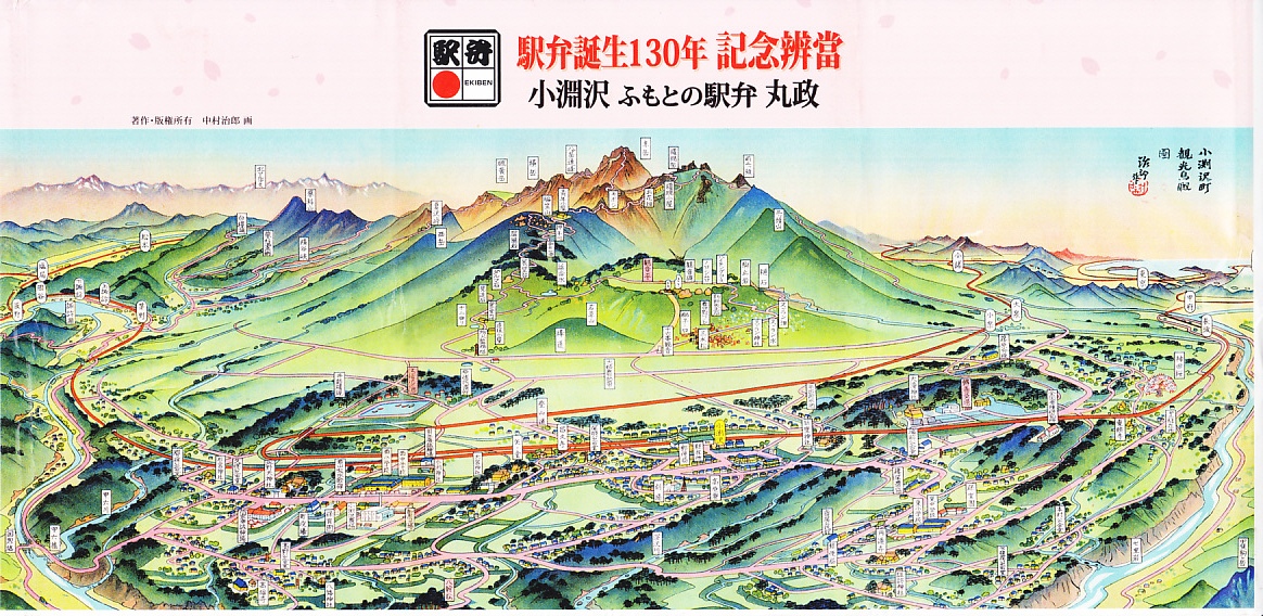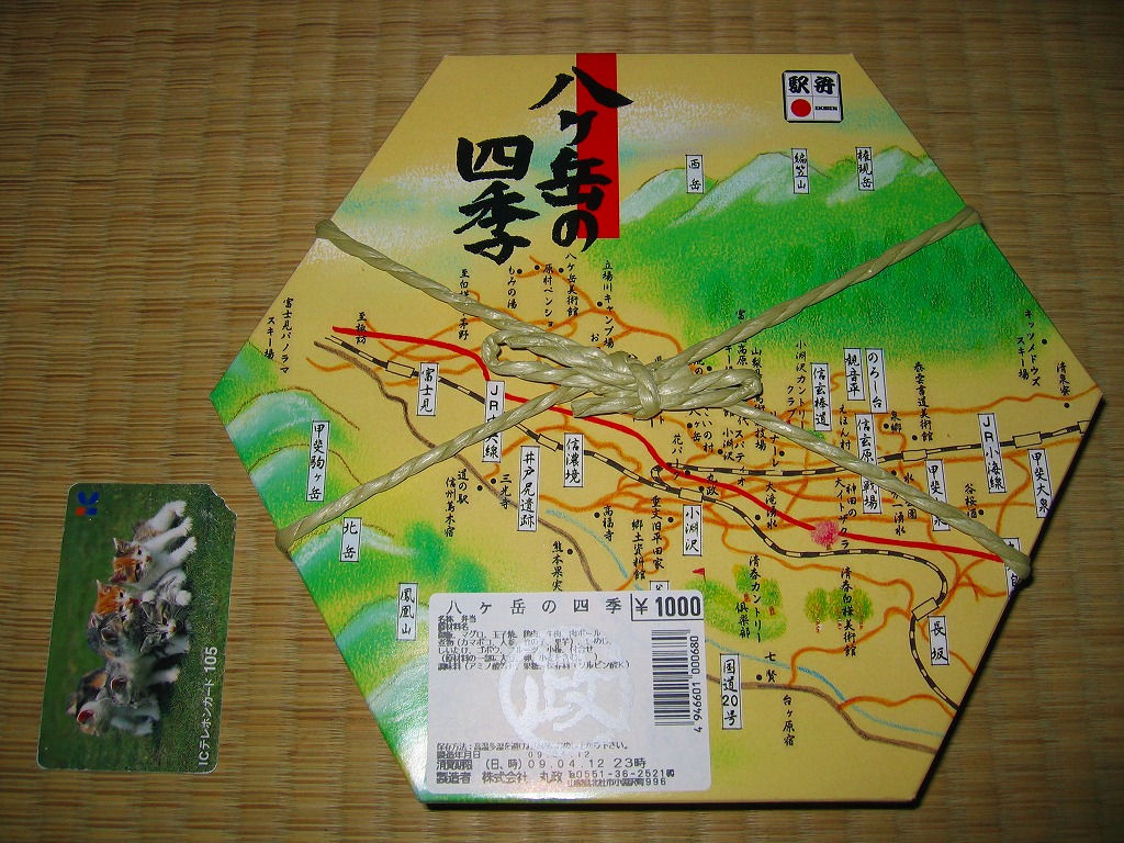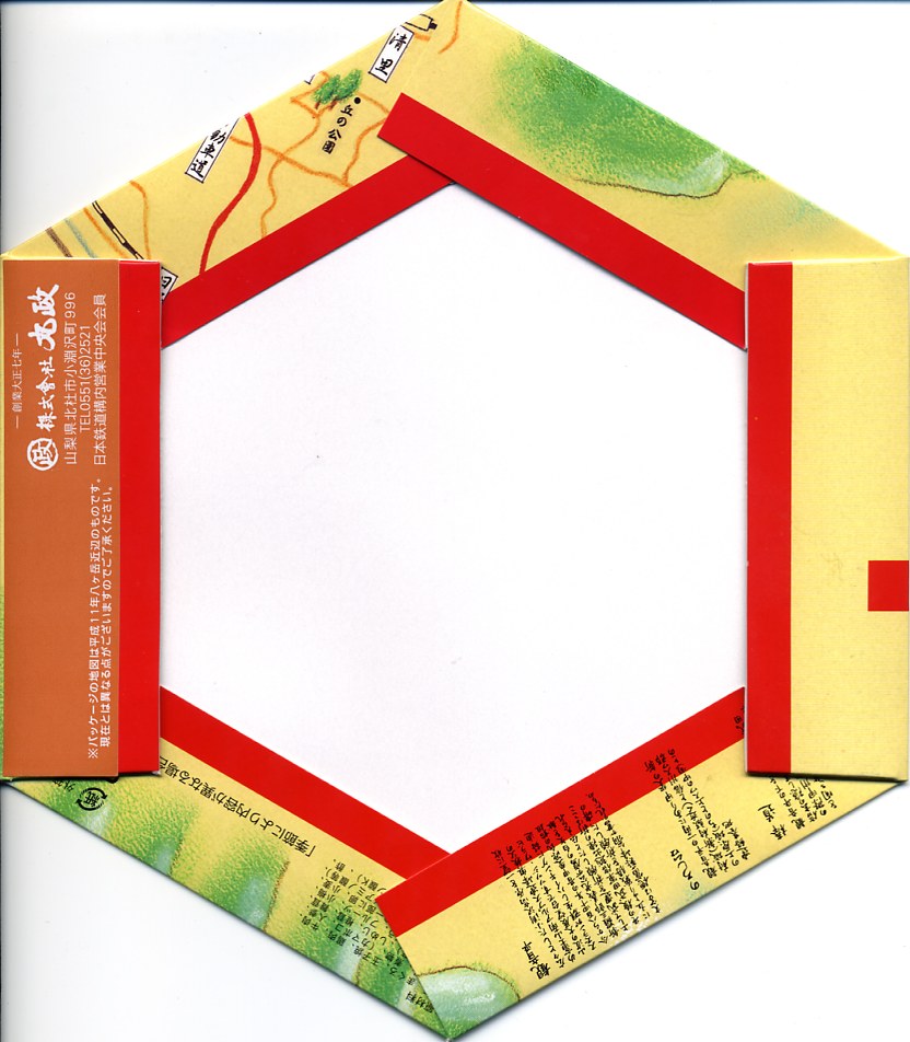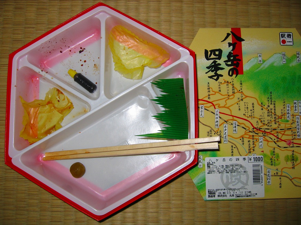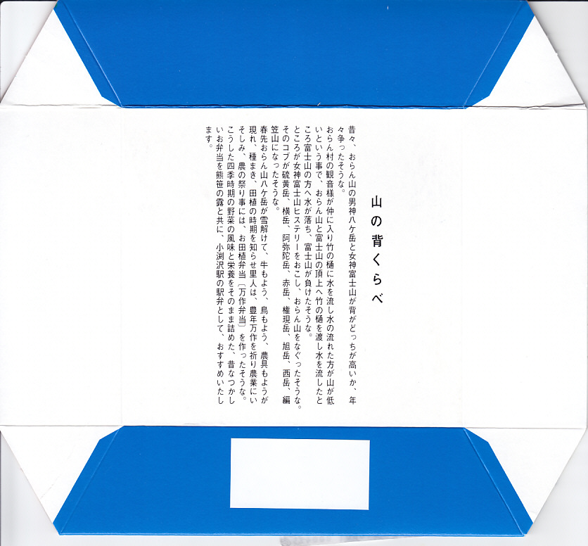 1999(平成11)年に発売された、主に甲府駅で売られる幕の内弁当。正六角形のボール紙製容器には、小淵沢を中心とした鉄道や道路や高速道路の路線図と周囲の山々が描かれるが、ここに甲府駅は入っていない。中身は日の丸御飯にマグロ照焼、玉子焼、鶏唐揚、牛肉野菜巻、肉団子、ニンジンやタケノコなどの煮物、カマボコ、しめじ和え、ミカンなど。