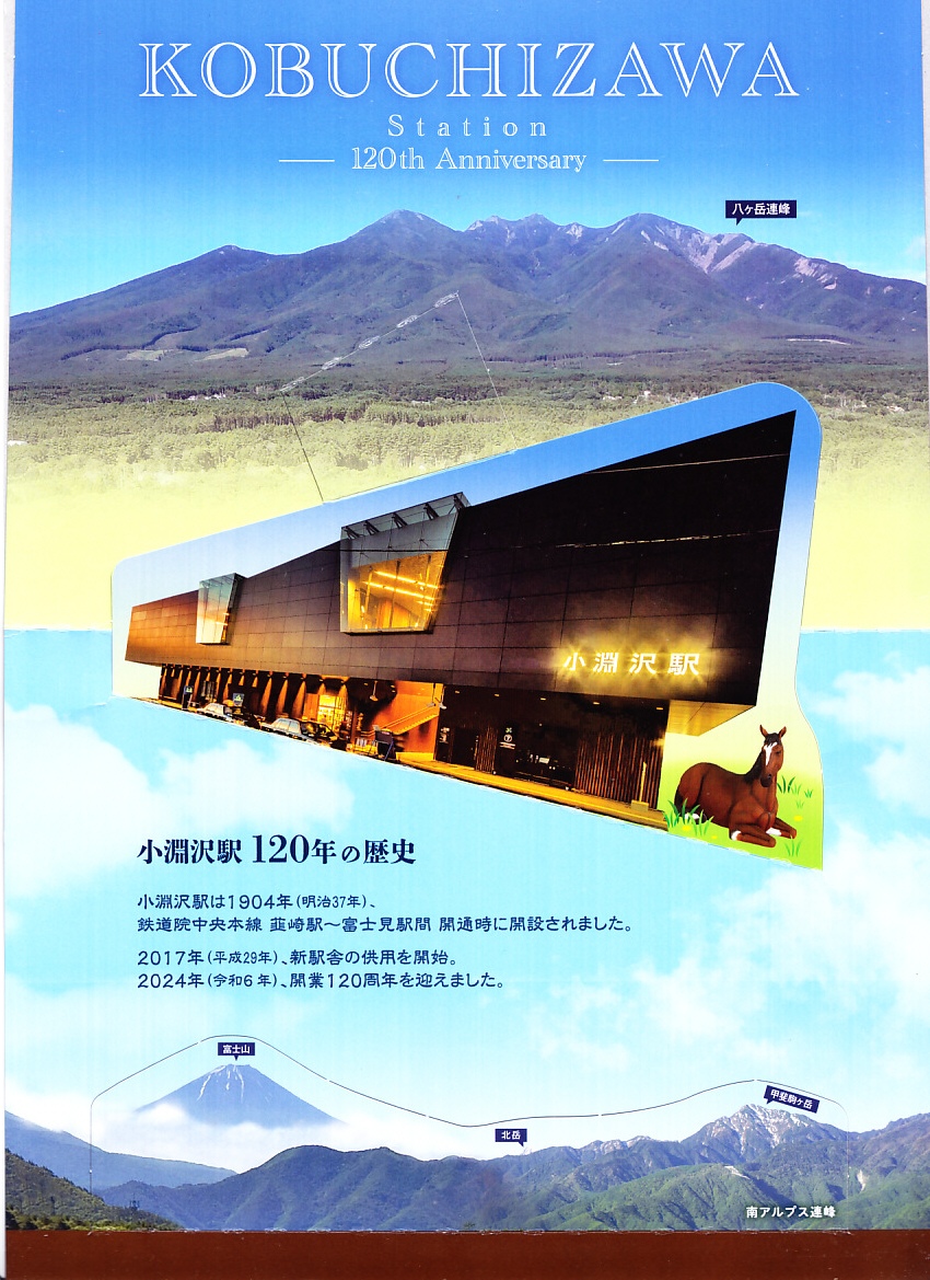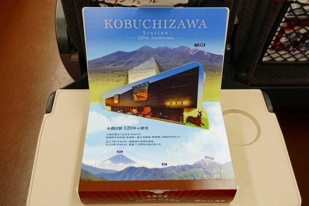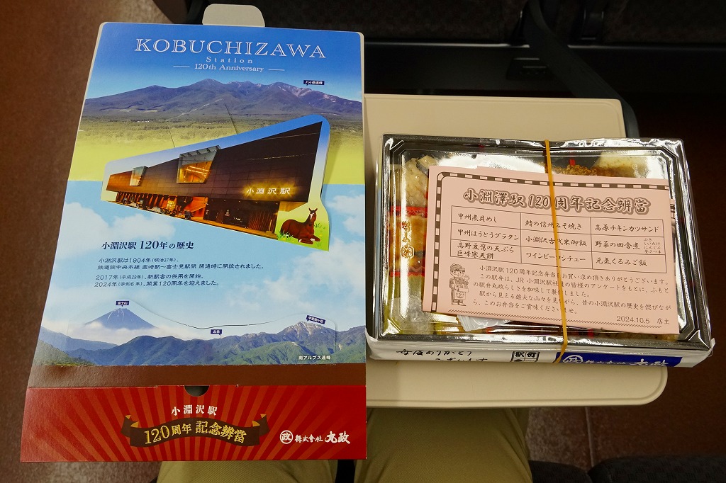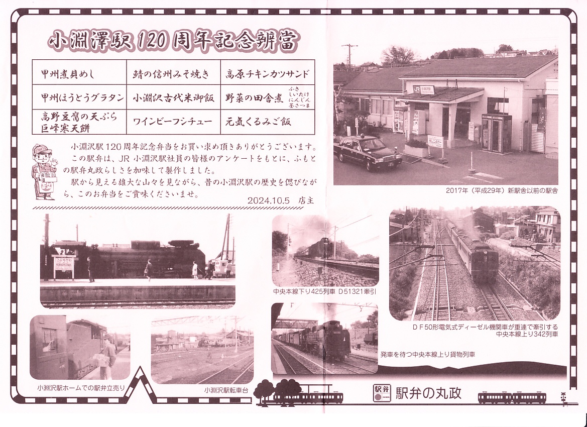 2024(令和6)年10月6日に小淵沢、甲府、東京、新宿の各駅で発売、その前日に小淵沢駅で開催された小淵沢駅開業120周年×北杜市制20周年記念イベントで120個を先行販売、その前の10月1日からのJR東日本の駅弁キャンペーン「駅弁味の陣2024」にエントリー。その名のとおり、1904年12月に開業した小淵沢駅の、開業120周年を記念して発売したお弁当。JR小淵沢駅社員のアンケートとあるいは考案したメニューと、「ふもとの駅弁丸政」らしさを加味して製作されたという。