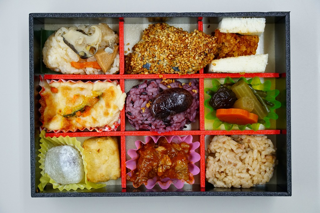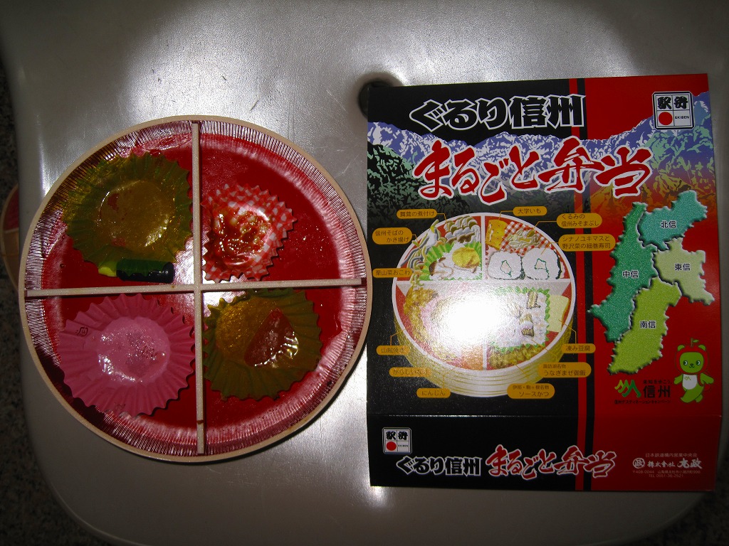 パッケージの底面に書かれるとおり、中身はそれぞれ、東信、南信、中信、北信をイメージした模様。1,200円で12品目を欲張り過ぎたためか、「栗山菜おこわ」に山菜はシメジ1本だけだとか、「うなぎまぜ御飯」にウナギは小片が載るだけで混ざってないとか、文句を探せば挙げられるが、分量豊富で賑やかな記念弁当。