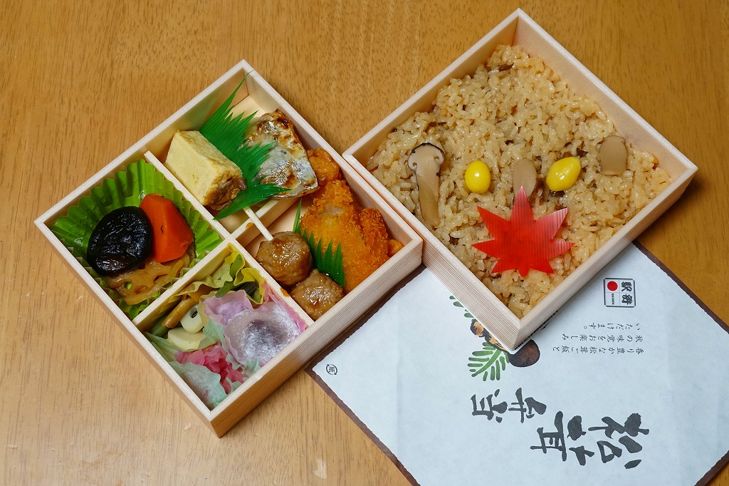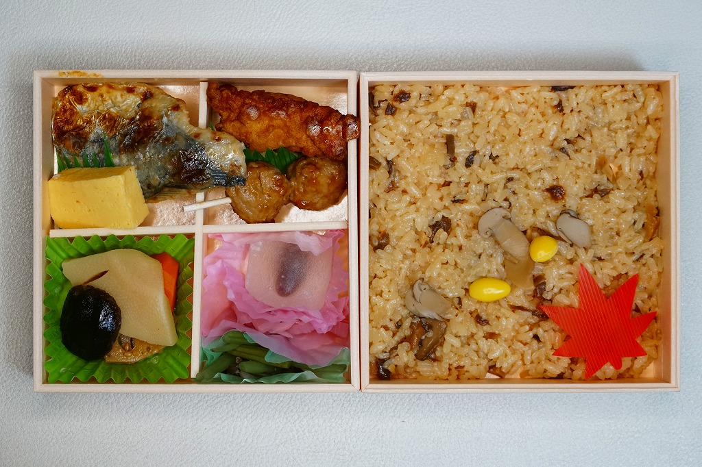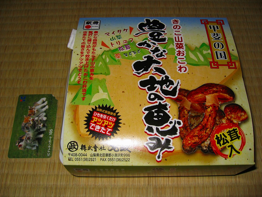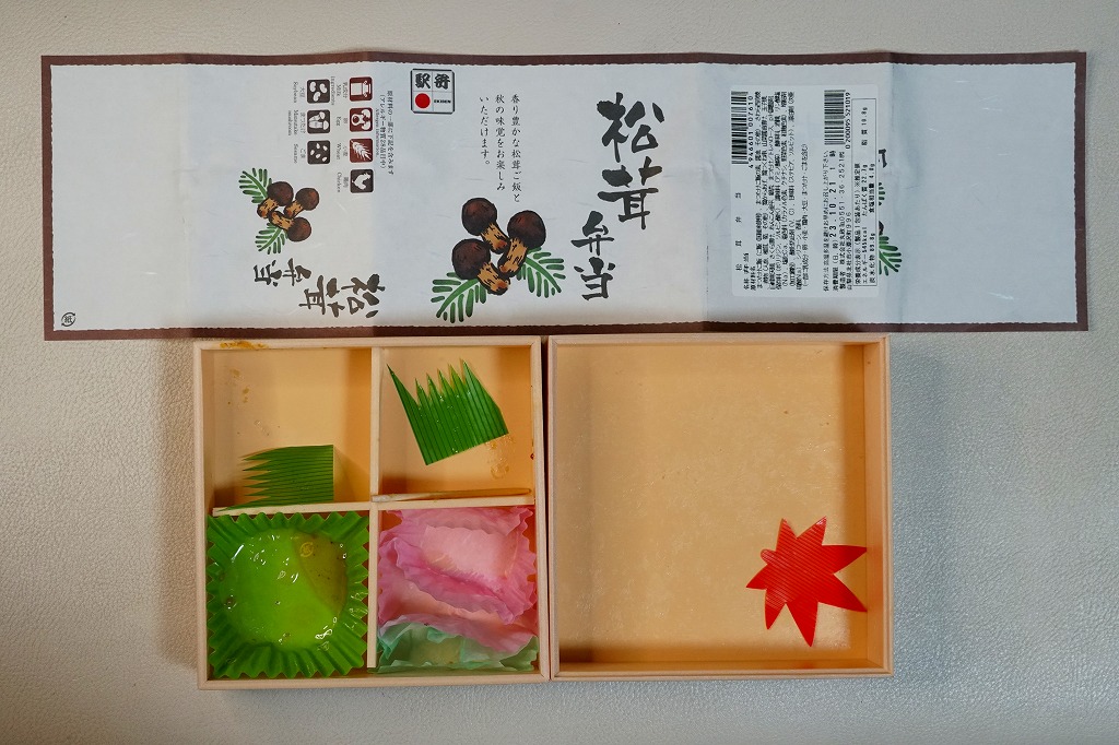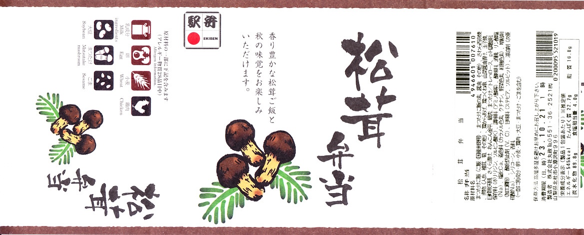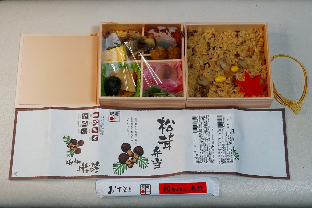 2020(令和2)年10月の新作というが、2018(平成30)年や2019(令和元)年の同時期にも販売した模様。正方形の折箱を二段に重ね、下段に松茸御飯を、上段に鶏唐揚、サワラ西京焼、肉団子、玉子焼、煮物、すずらん餅のおかずを配置。小淵沢駅の名物駅弁「元気甲斐」を廉価に、安く、安っぽくしたような存在。掛紙は商品名と宣伝文とイラストを簡潔に配した、シンプルなもの。価格は2020年時点で1,150円、2023年時点で1,360円、2024年時点で1,390円。