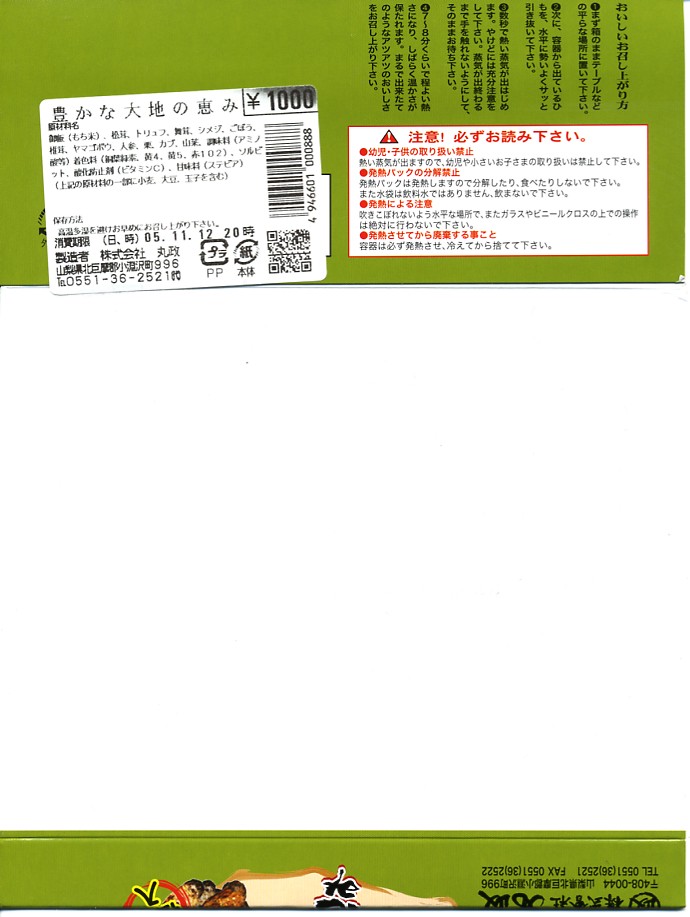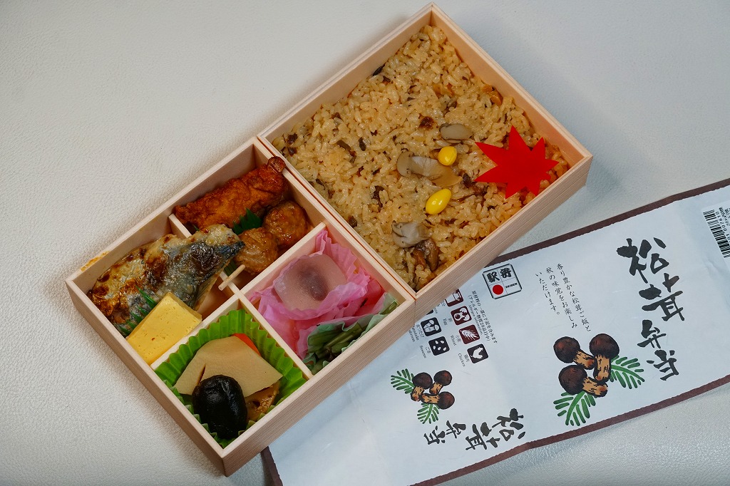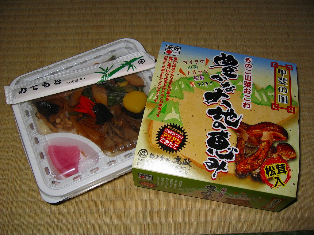 秋冬の駅弁大会シーズンに向けた、2005(平成17)年秋の新商品か。ほぼ正方形の加熱機能付き容器を、山並みと松茸と商品名を描いたボール紙の枠にはめる。中身は餅米混じりの御飯の上を舞茸、しめじ、ごぼう、山菜で覆い、人参、栗、松茸、トリュフを少々添える。