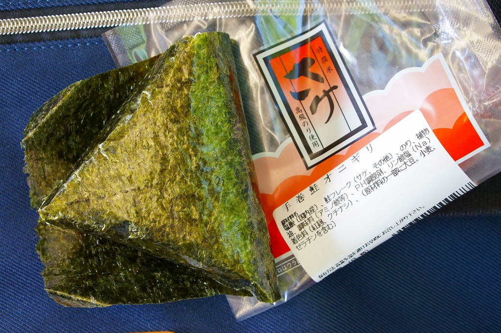 その「おにぎらず」とは、スーパーなどで買える「全形」サイズ(約21cm×約19cm)の海苔1枚の上に、温かい御飯(茶碗1杯分とされる)を薄く広げ、好みで具も添えたり混ぜ、海苔の四隅で閉じて作る、握らずにできる四角いおむすび。週刊のマンガ雑誌「モーニング」で連載される、うえやまとち氏の料理マンガ「クッキングパパ」で、1990(平成2)年に掲載され翌年に単行本化された回「COOK.213『超簡単おにぎり おにぎらず』」の内容が、四半世紀の時を経て2014年の秋にインターネット上で話題になり、急速に普及した。駅弁で見たのは、これが初めて。