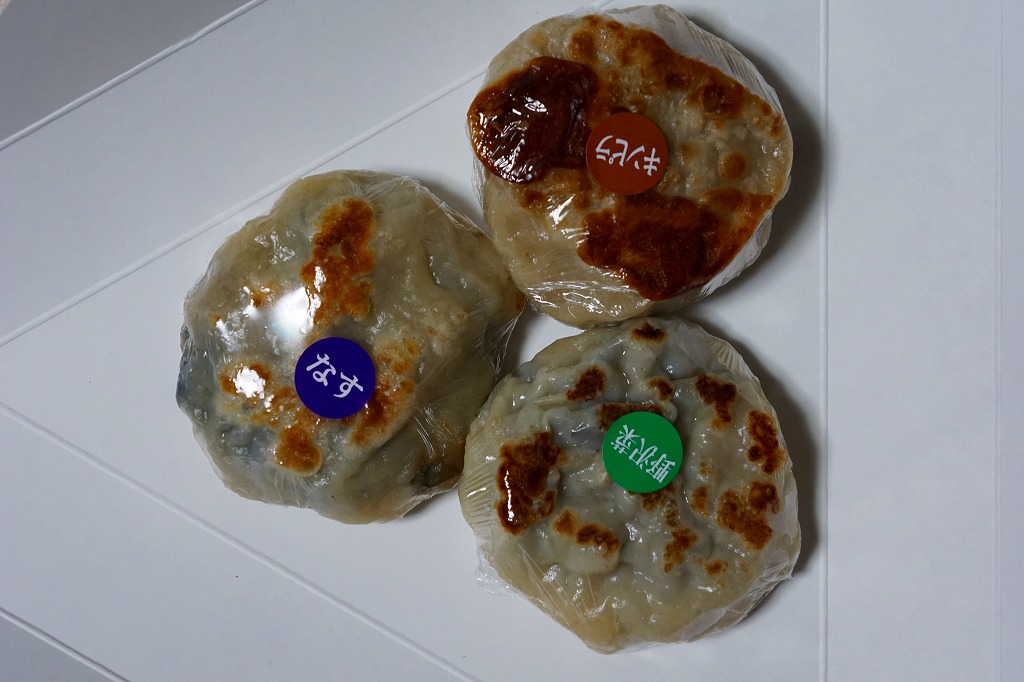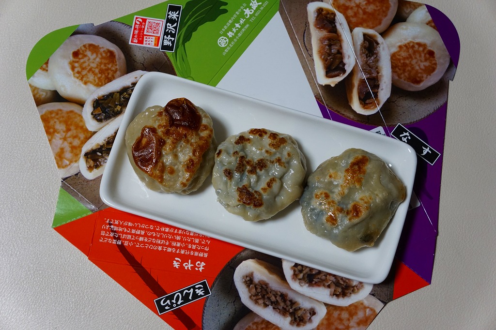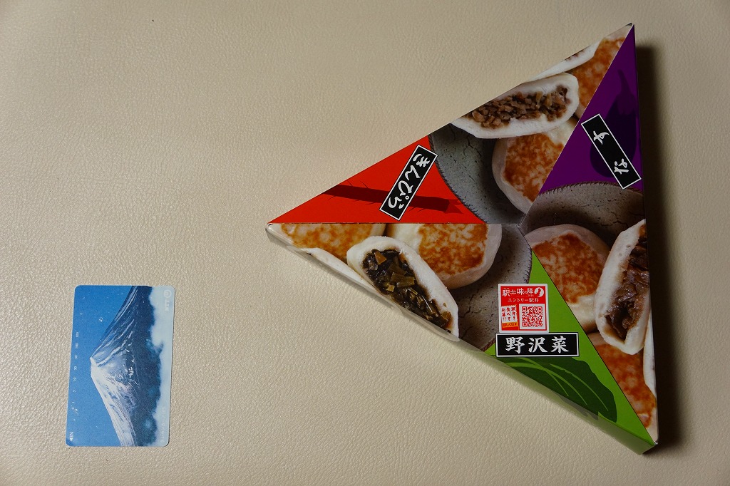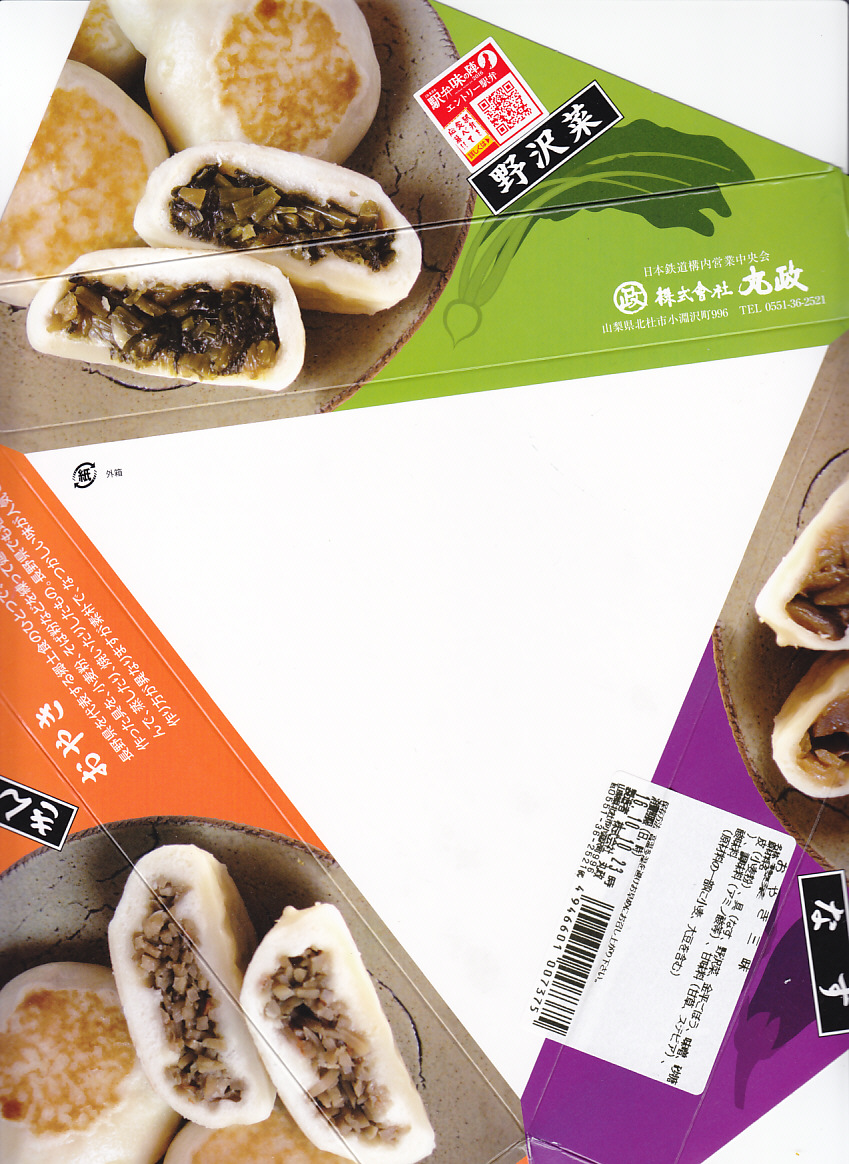 JR東日本の駅弁キャンペーン「駅弁味の陣2016」へのエントリーに合わせて、2016(平成28)年10月に発売か。現物に駅弁の名前が書かれていないが、食品表示ラベルでは「おやき三昧」、キャンペーンでは茅野駅弁「信州名物 おやき三昧」とある。おやきの写真と断面と中身をデザインした、正三角形のボール紙製容器に、ラップに包まれた「なす」「野沢菜」「キンピラ」のおやきを各1個収める。味もそのもの。おやきは信州であれば、どこでも温かいものが買えると思うので、これは東京駅その他の県外で売られるのが正しい姿に思えた。キャンペーン期間をもって売り止めた模様。