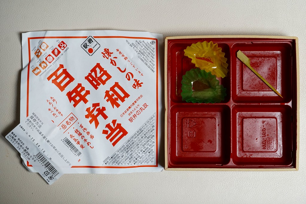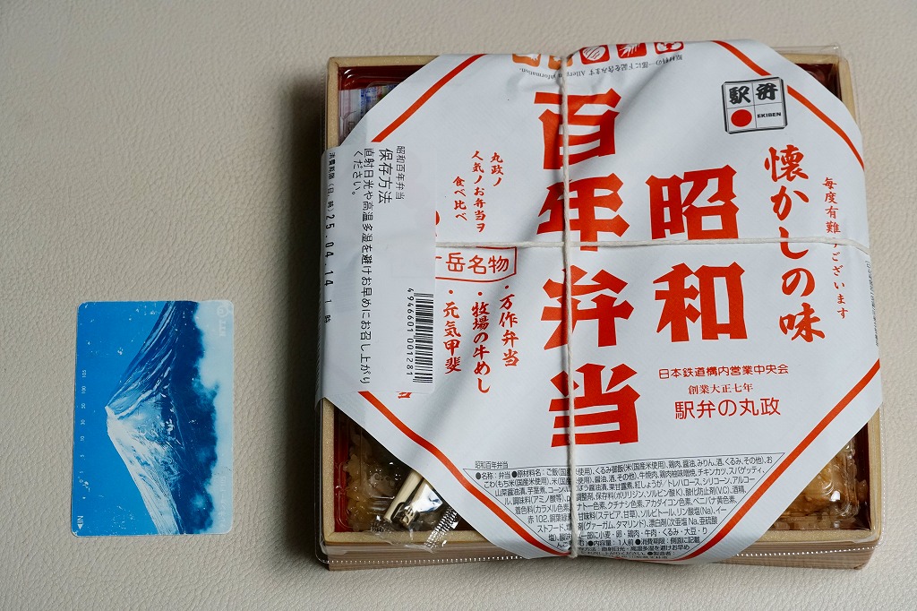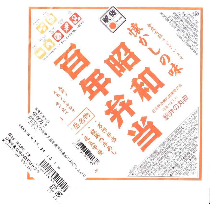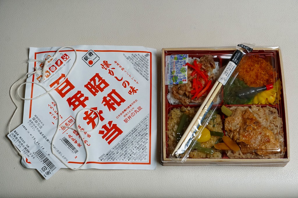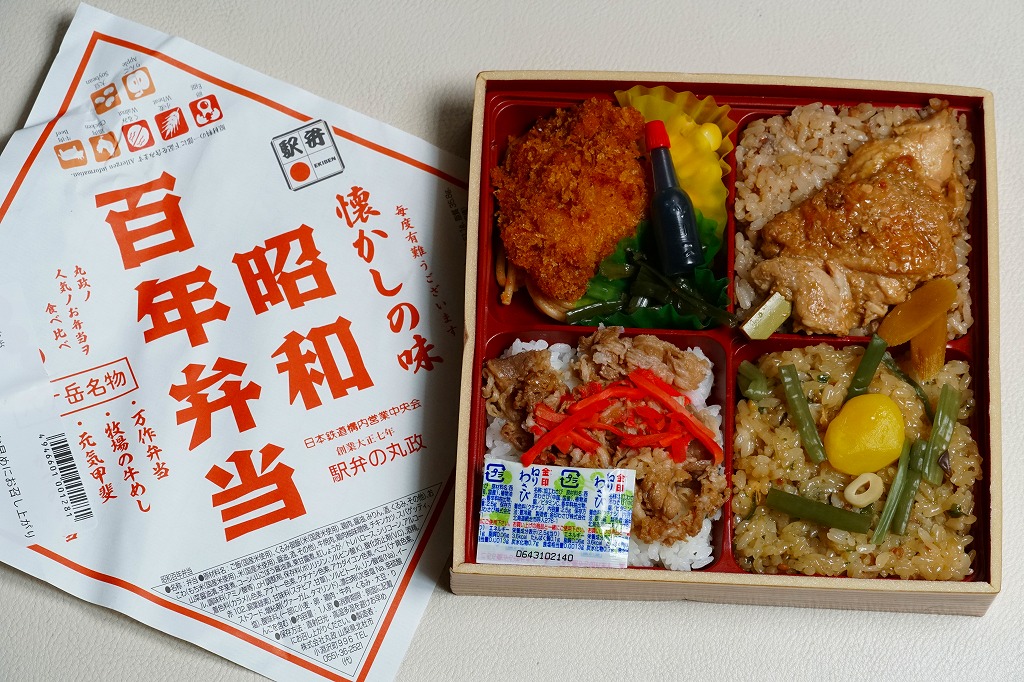 2025(令和7)年2月4日に東京などで発売。その名のとおり、元号が昭和のままであればこの年が100年にあたることにちなんだ新商品だろう。正方形の浅く平たい容器を包む、正方形の白い掛紙には、その商品名を大きく記す。松花堂弁当タイプの4区画に、掛紙のおしながきによると、「万作弁当」「牧場の牛めし」「元気甲斐」「高原野菜とかつの弁当」を詰めたといい、山菜おこわ、白飯に牛肉と紅生姜、くるみ御飯に鶏肉の柚子味噌焼、チキンカツとスパゲティにコーンと茎煮。百年は大袈裟でも、小淵沢駅弁の半世紀の歴史を詰めた。調製元は大正七年創業つまり1918年創業ということで、百年を少し超える歴史を持つ。