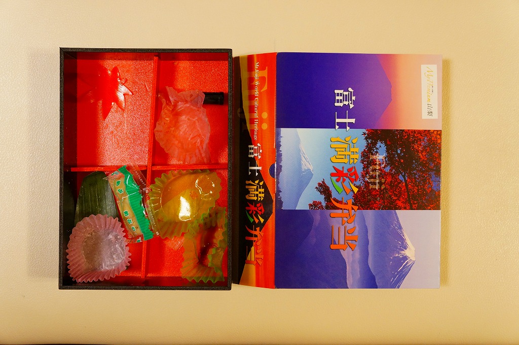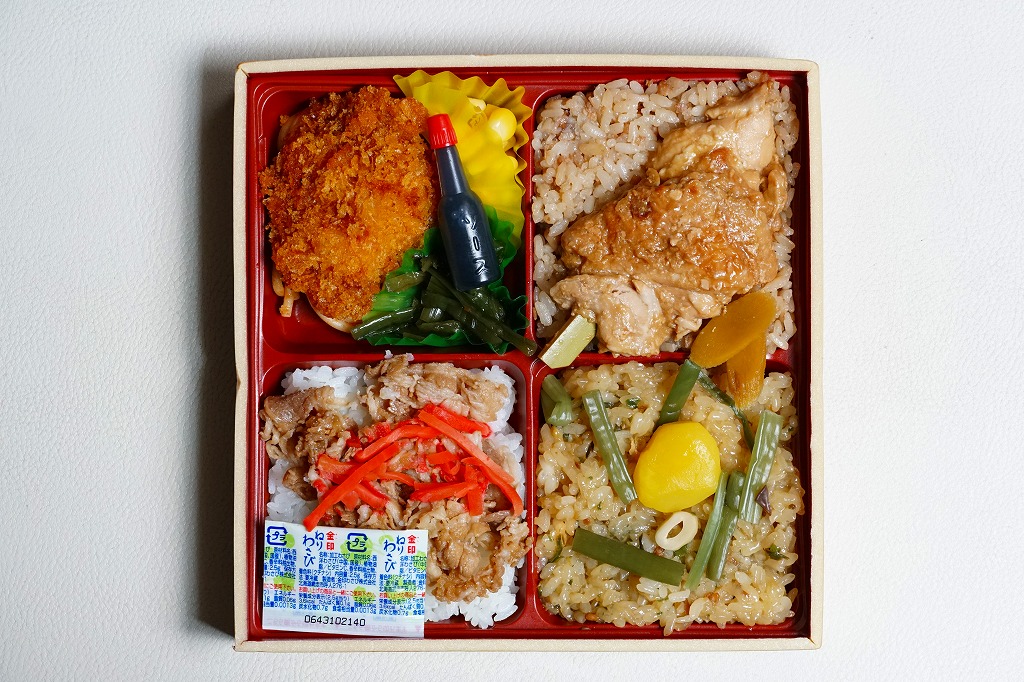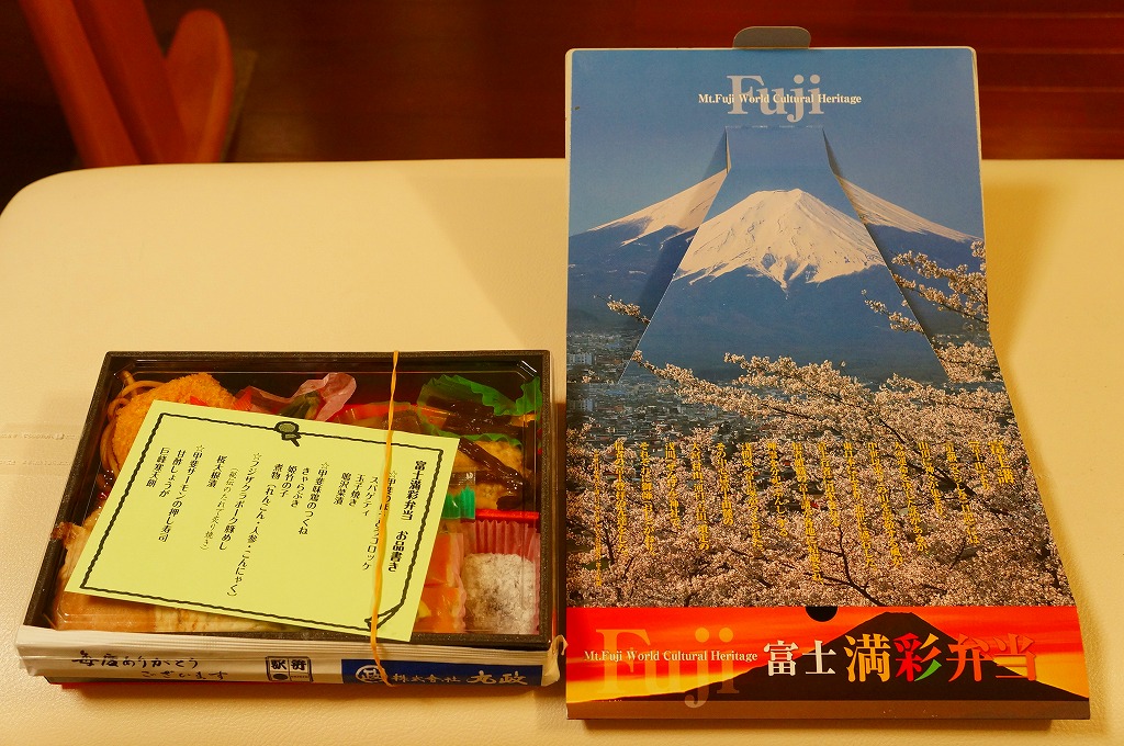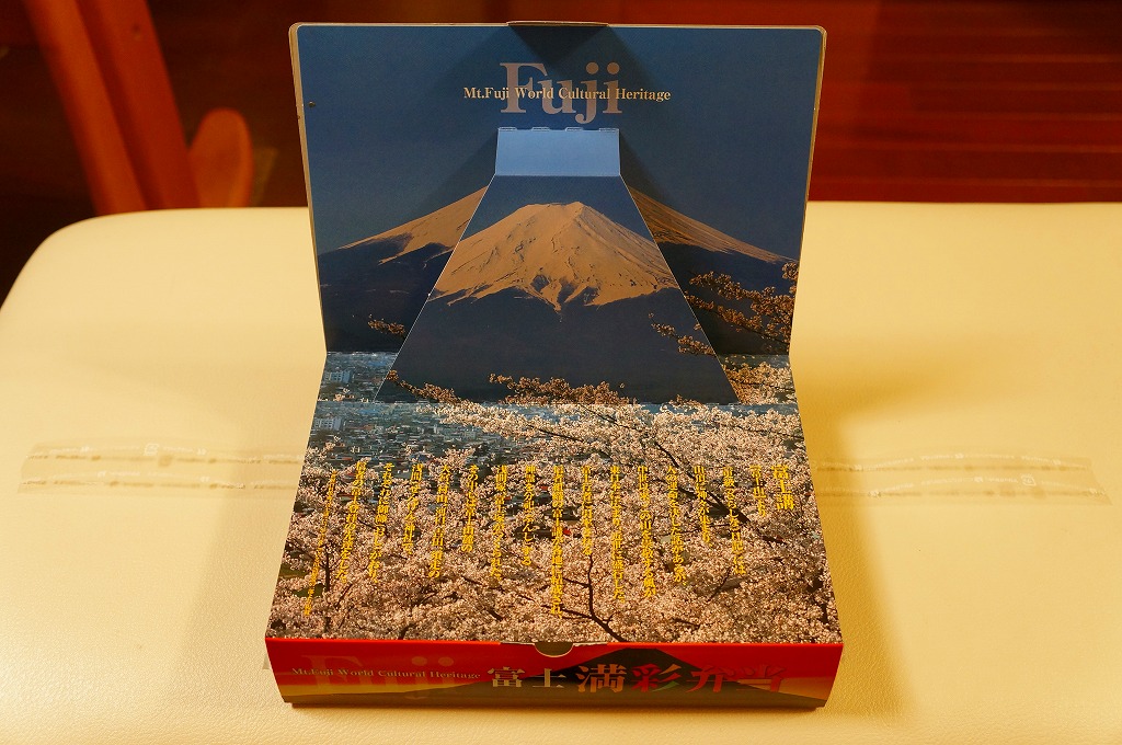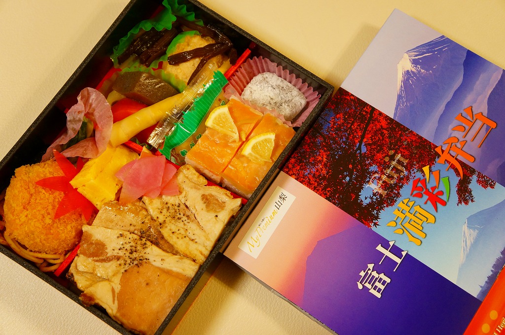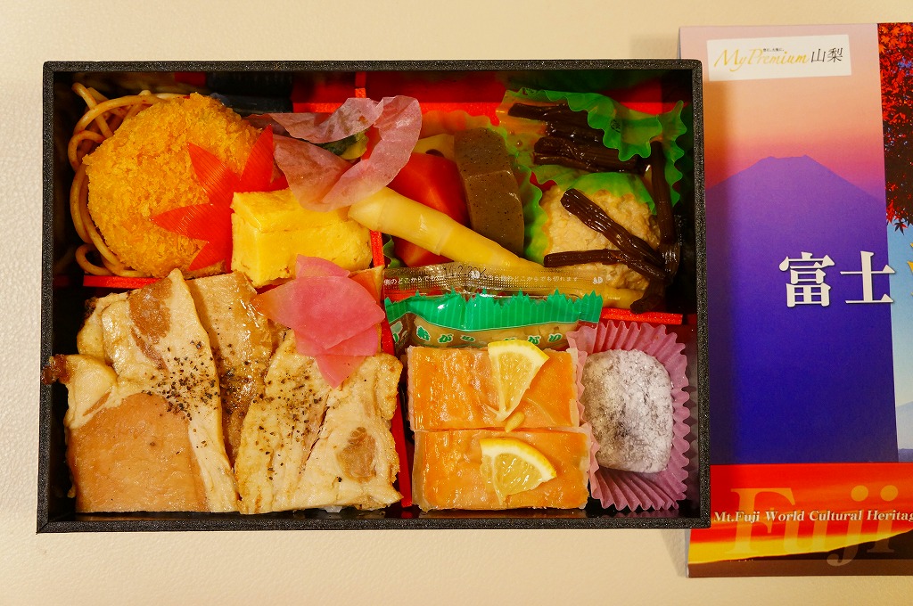 ふたを開くと富士山が現れる。四角い容器を横に引き抜くと、4区画の中身は、フジザクラポーク豚めしと桜大根漬、甲斐サーモンの押寿司と甘酢生姜と巨峰寒天餅、鶏つくねときゃらぶきと煮物類、コロッケとスパゲティと玉子焼と鳴沢菜漬。富士よりもむしろ山梨で固めている。キャンペーン名をシールで後貼りし、駅名も調製元も駅弁マークもないパッケージは、駅弁以外での使用を視野に入れたものか。
