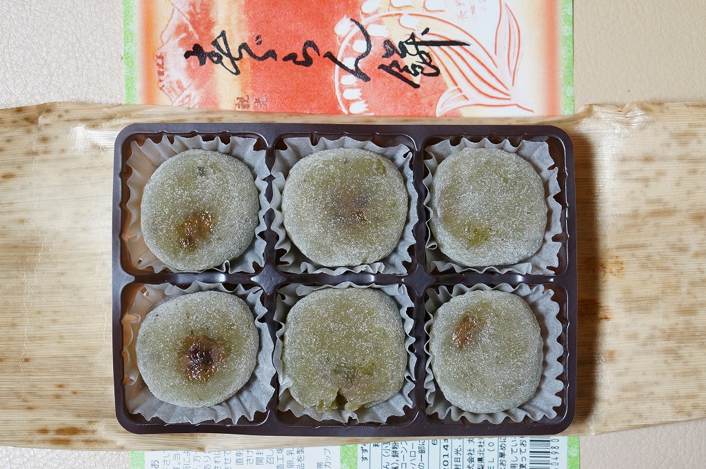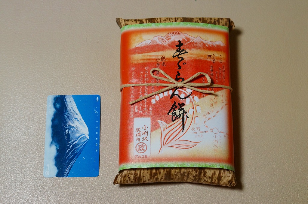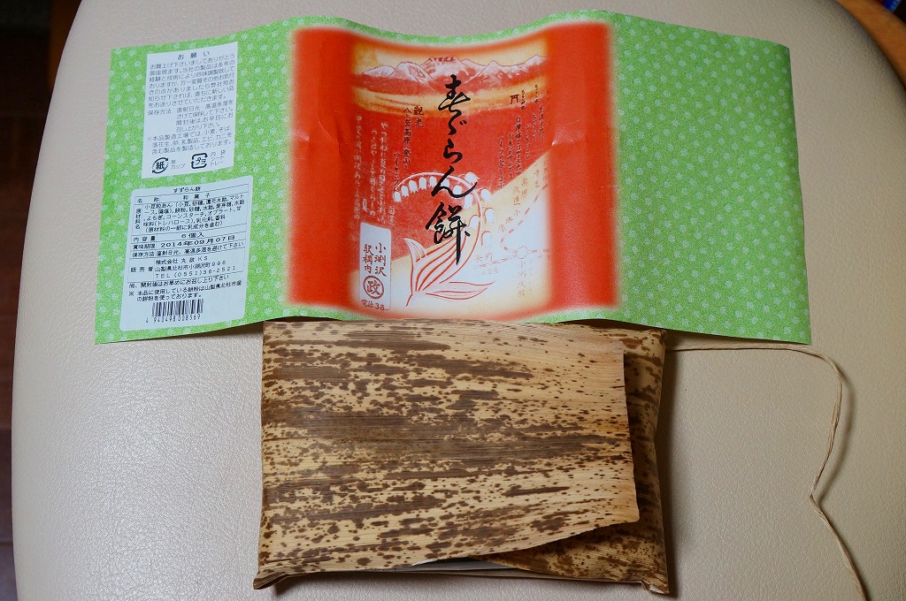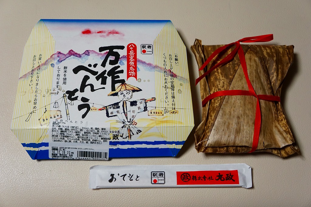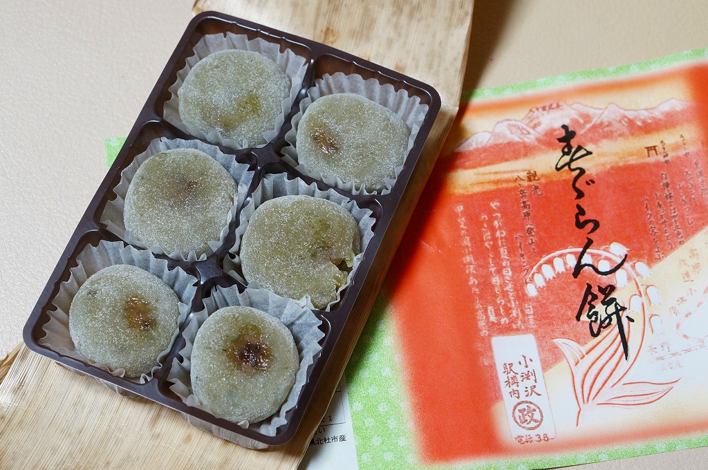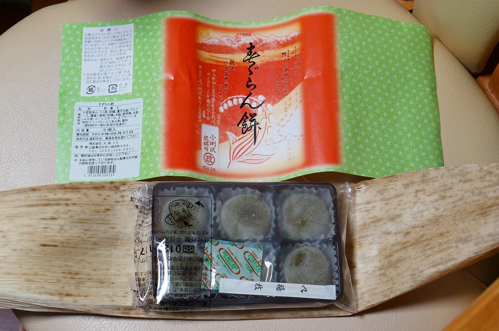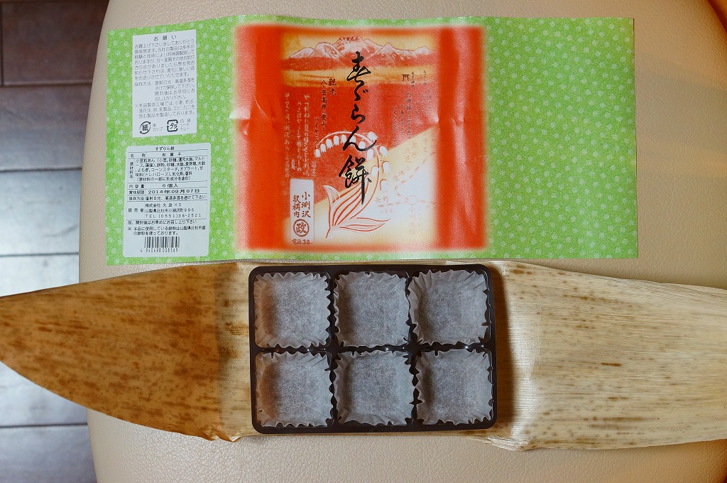 2014(平成26)年7月に復刻販売。かつて小淵沢駅や富士見駅で売られた鉄道銘菓。つぶあんを薄い求肥に包んだ餅が6個、プラ製トレーに収められて密封パックし、竹皮に包み、昔の絵柄を印刷した掛紙を巻いていた。今は売られていないものを作るため、ご当地を偽装する全国各地の土産物と同じような、製造委託記号とフリーダイヤルの組合せは仕方がなくても、あんこと皮がスカスカに分離した中身で、これにはげんなり。せっかくのメモリアルなのに、話題にも挙がらないようで残念。1年間ほどの販売か。