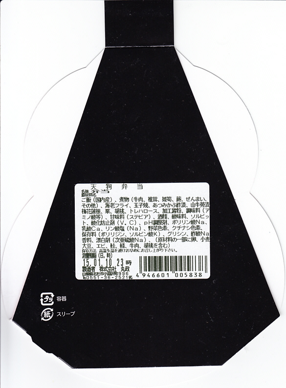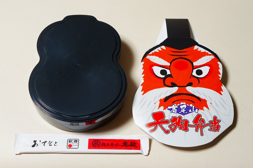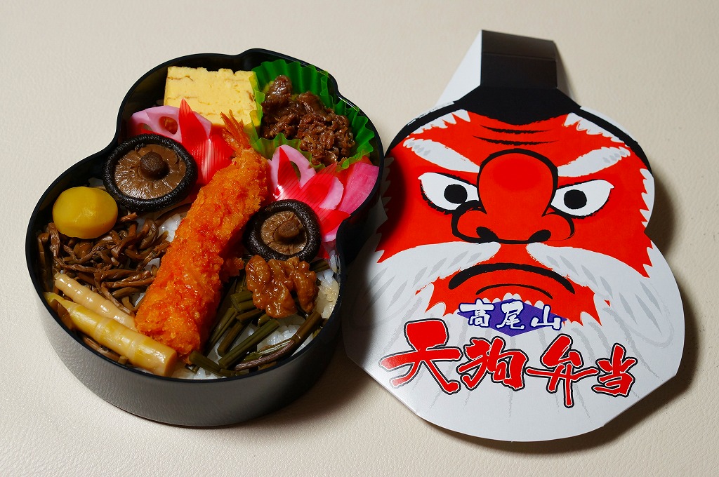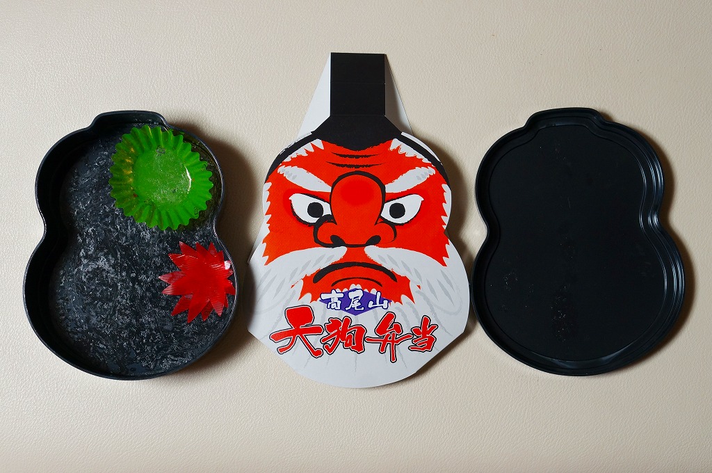 2015(平成27)年1月の京王百貨店の駅弁大会で販売。ダルマ型かヒョウタン型に見える黒いプラスティックの容器に、天狗の顔のパッケージを被せる。中身は食材の配置で天狗を模しており、白御飯の上に目のシイタケ、鼻のエビフライ、眉の花レンコン、髭のワラビやゼンマイやヒメタケ、髪の牛肉煮、他にクリ、玉子焼、大根漬け。具は見栄えのみで選んだと思われるので、当然に内容と風味が散漫になる。食べるのではなく見る弁当。