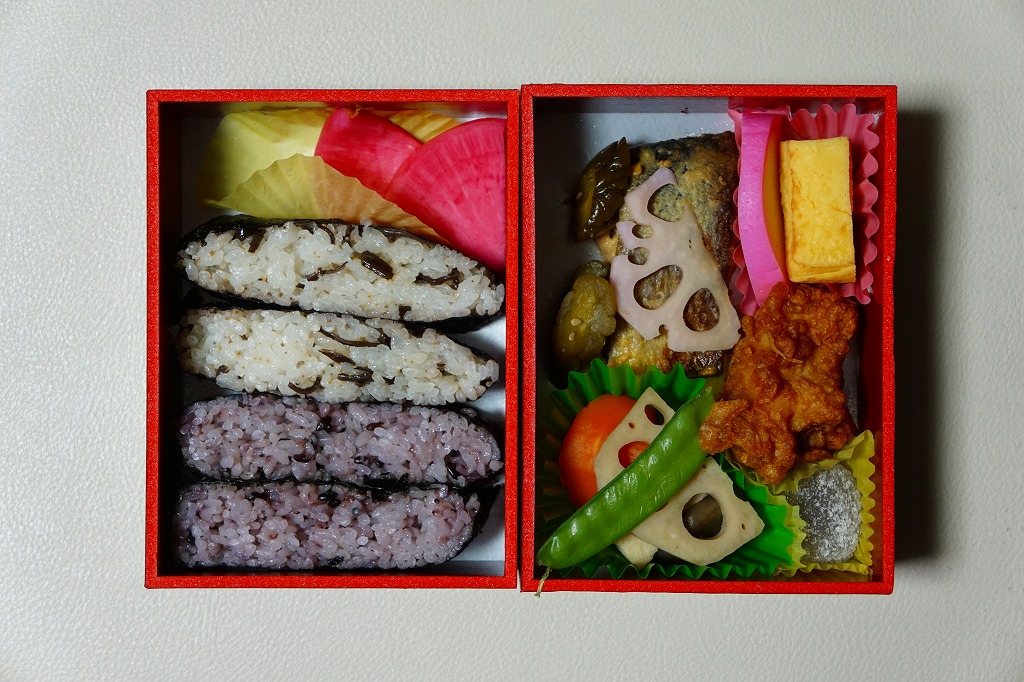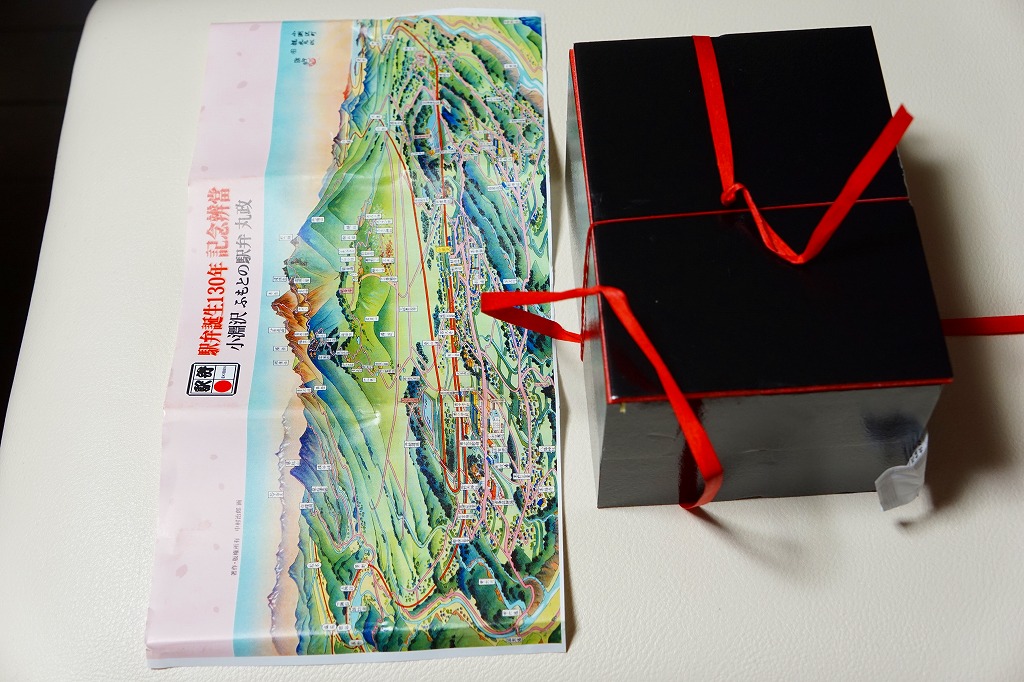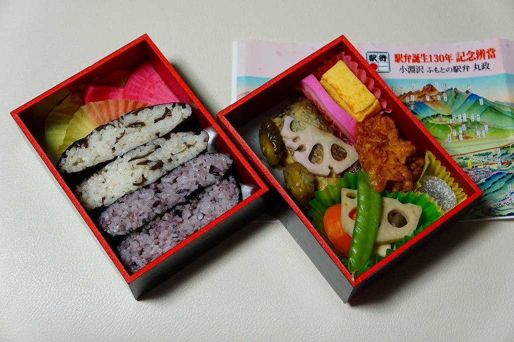 小淵沢の古い鳥瞰図を掛紙に使用、二段重ねの容器の中身は、下段がキクラゲ入りの白飯と黒米混じり飯のおむすびが2個ずつと赤かぶ漬、上段がおかずでサケ西京焼、玉子焼、鶏唐揚、かまぼこ、ニンジンや高野豆腐などの煮物、すずらん餅など。つまりだいたい幕の内駅弁であるが、最近話題の「おにぎらず」でふんわりと飯を詰めた点が目新しい。食品表示ラベルにも「お握らず」とあった。