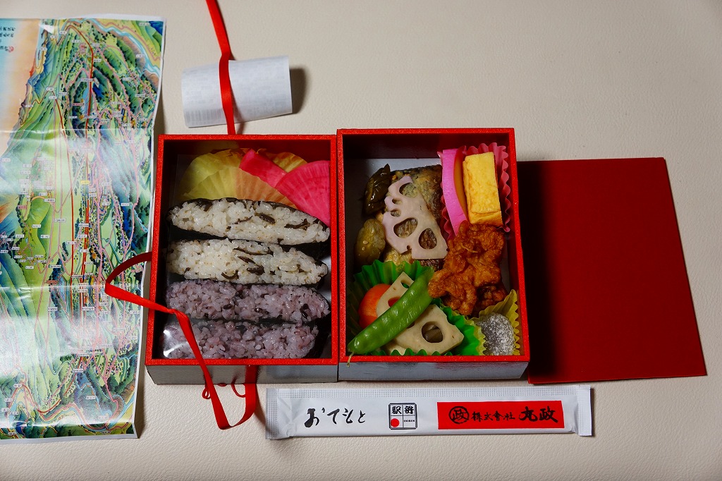 大きめの長方形容器を収めるスリーブは、八ヶ岳を中心とした鳥瞰図を描く上部を開くと小淵沢駅舎が飛び出る仕様。9区画の中身は添付のしおりで紹介され、甲州煮貝めし、鯖の信州みそ焼き、高原チキンカツサンド、甲州ほうとうグラタン、小淵沢古代米御飯、野菜の田舎煮、高野豆腐の天ぷらと巨峰寒天餅、ワインビーフシチュー、元気くるみご飯。御飯を握りの形で詰めたからか、小淵沢駅弁のいろんな中身が、個々に独立して詰められた感じで、9個分の駅弁ミニチュアが一堂に会した印象。なかなかのお値段。